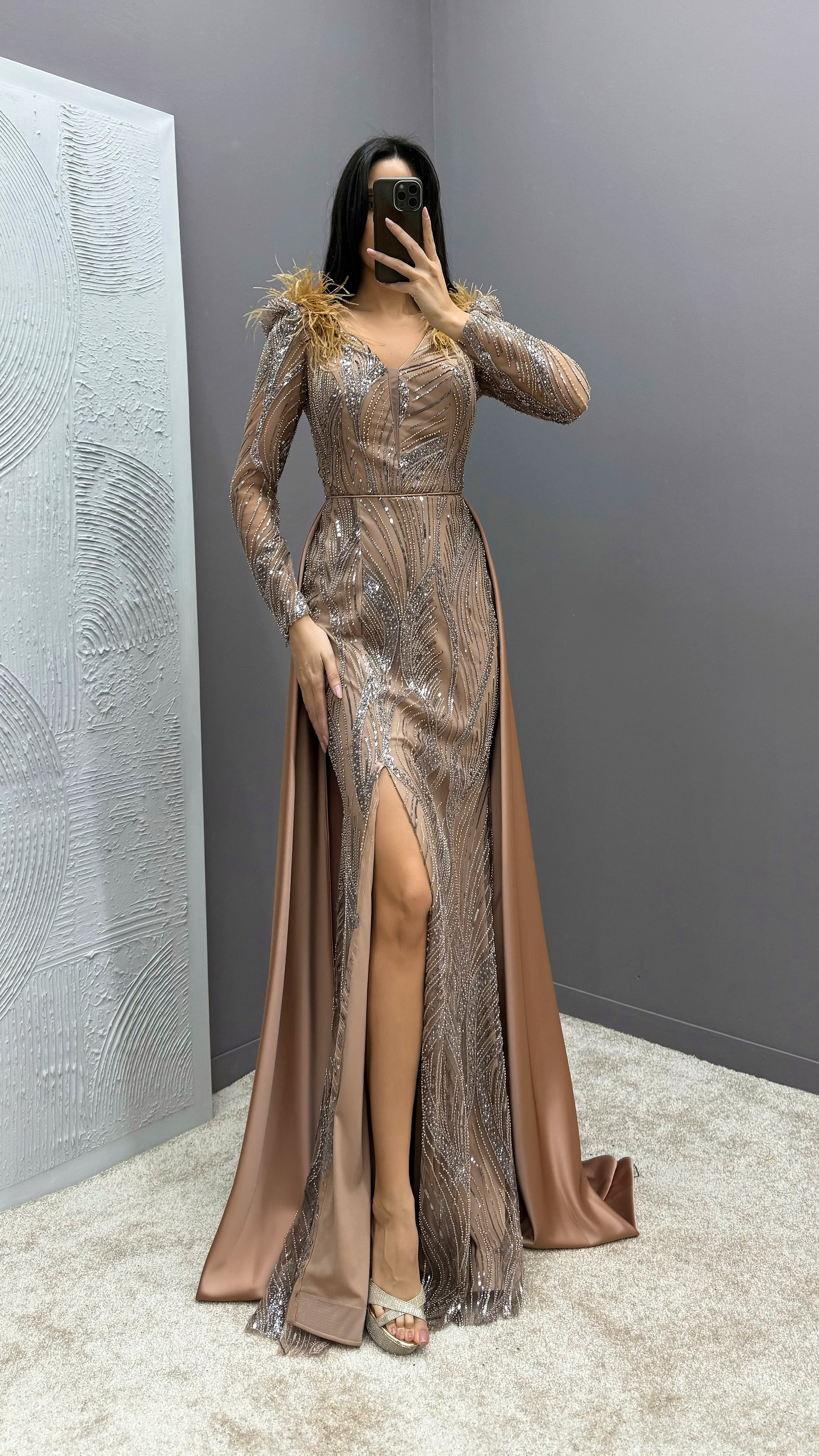 • Pudra Omuzları Tüylü İşleme Detay Yırtmaçlı Abiye