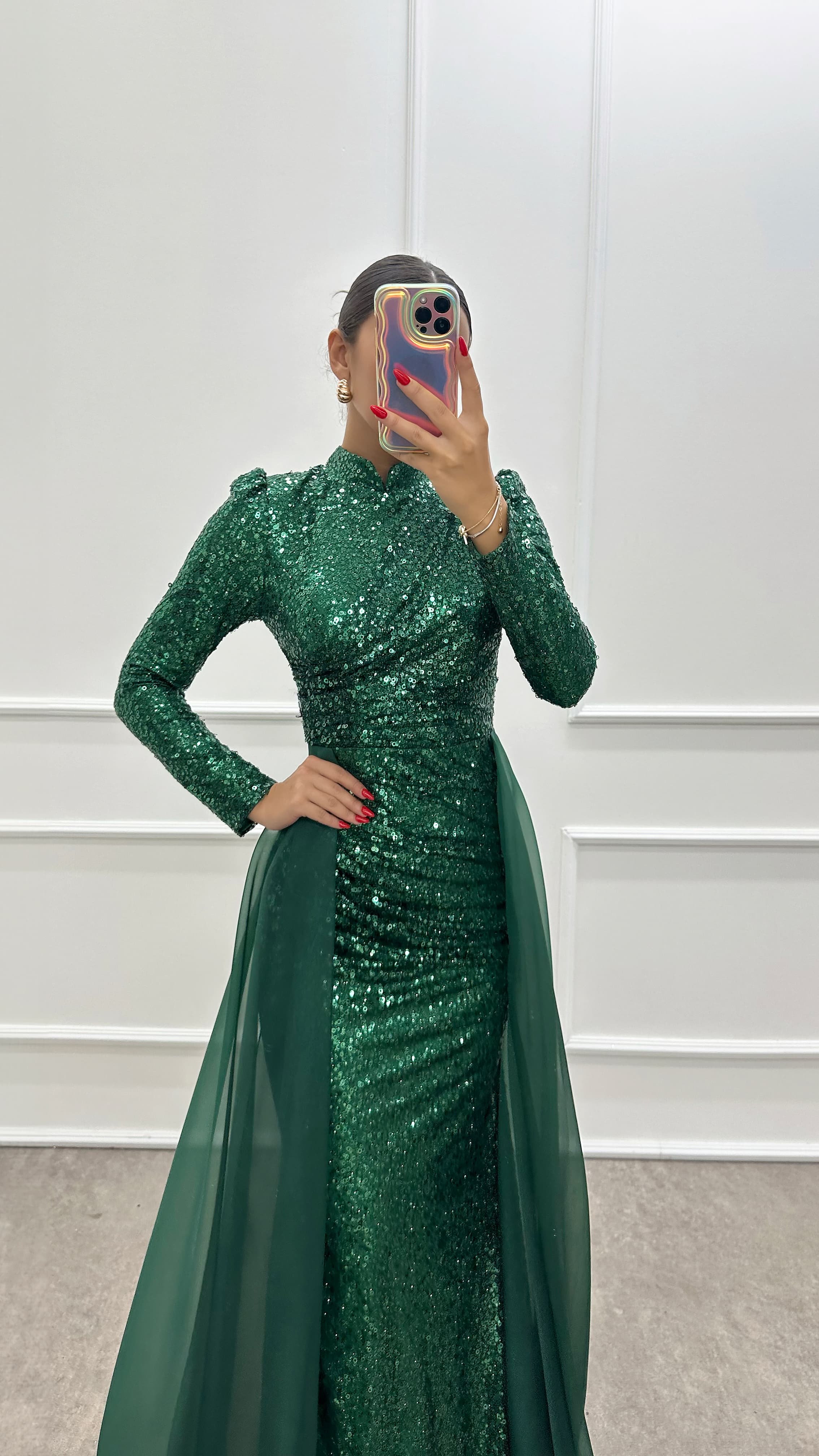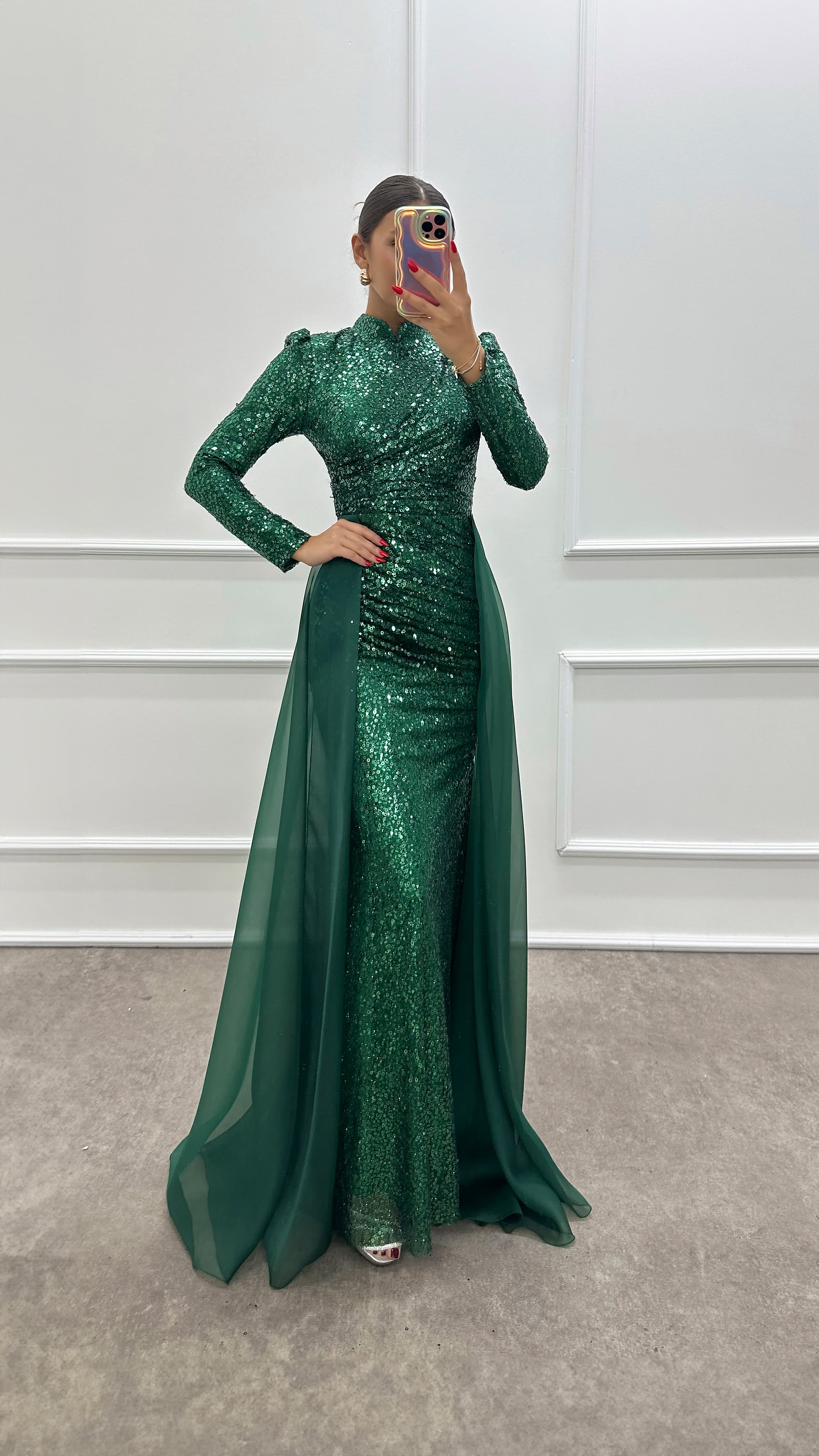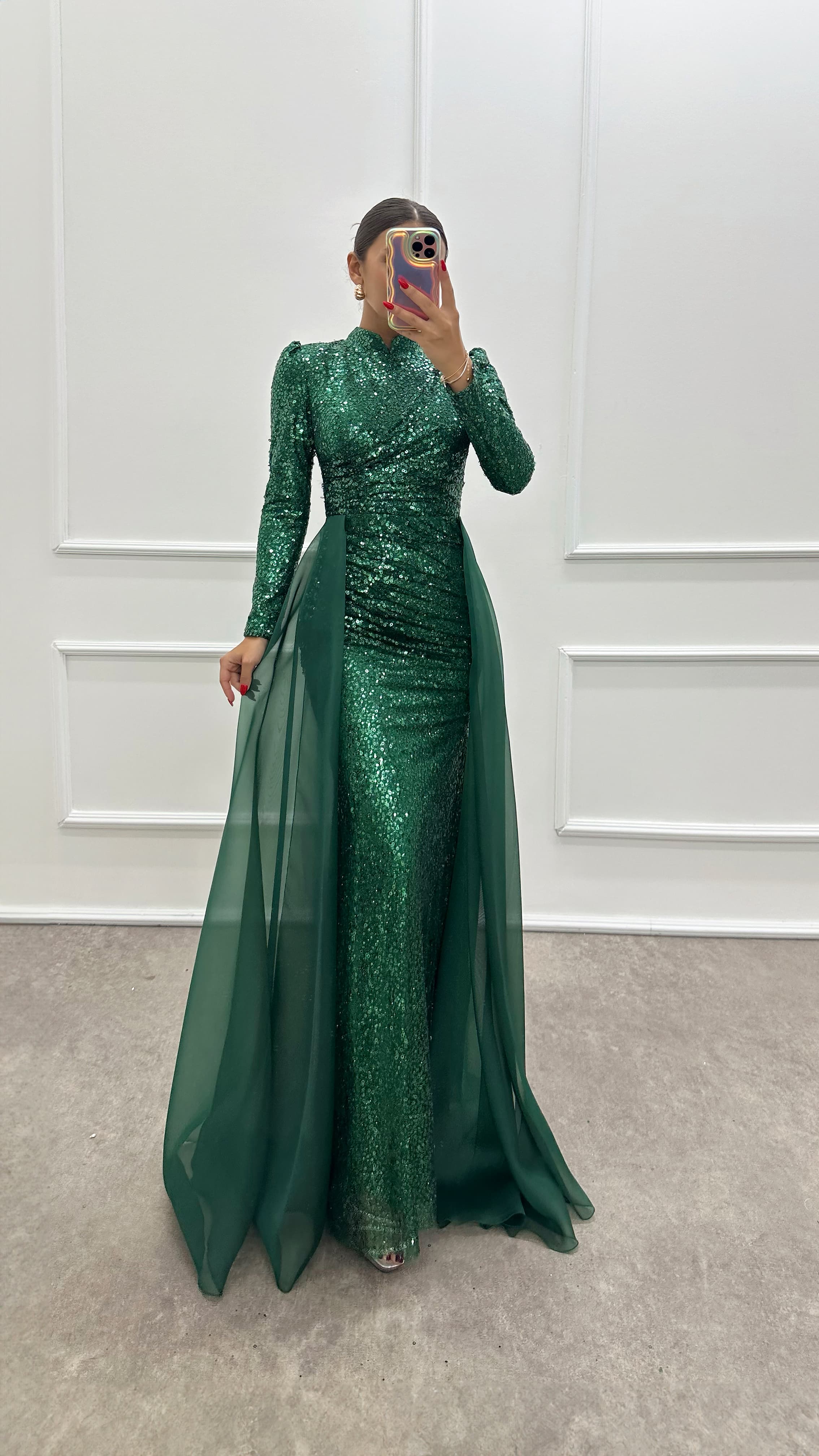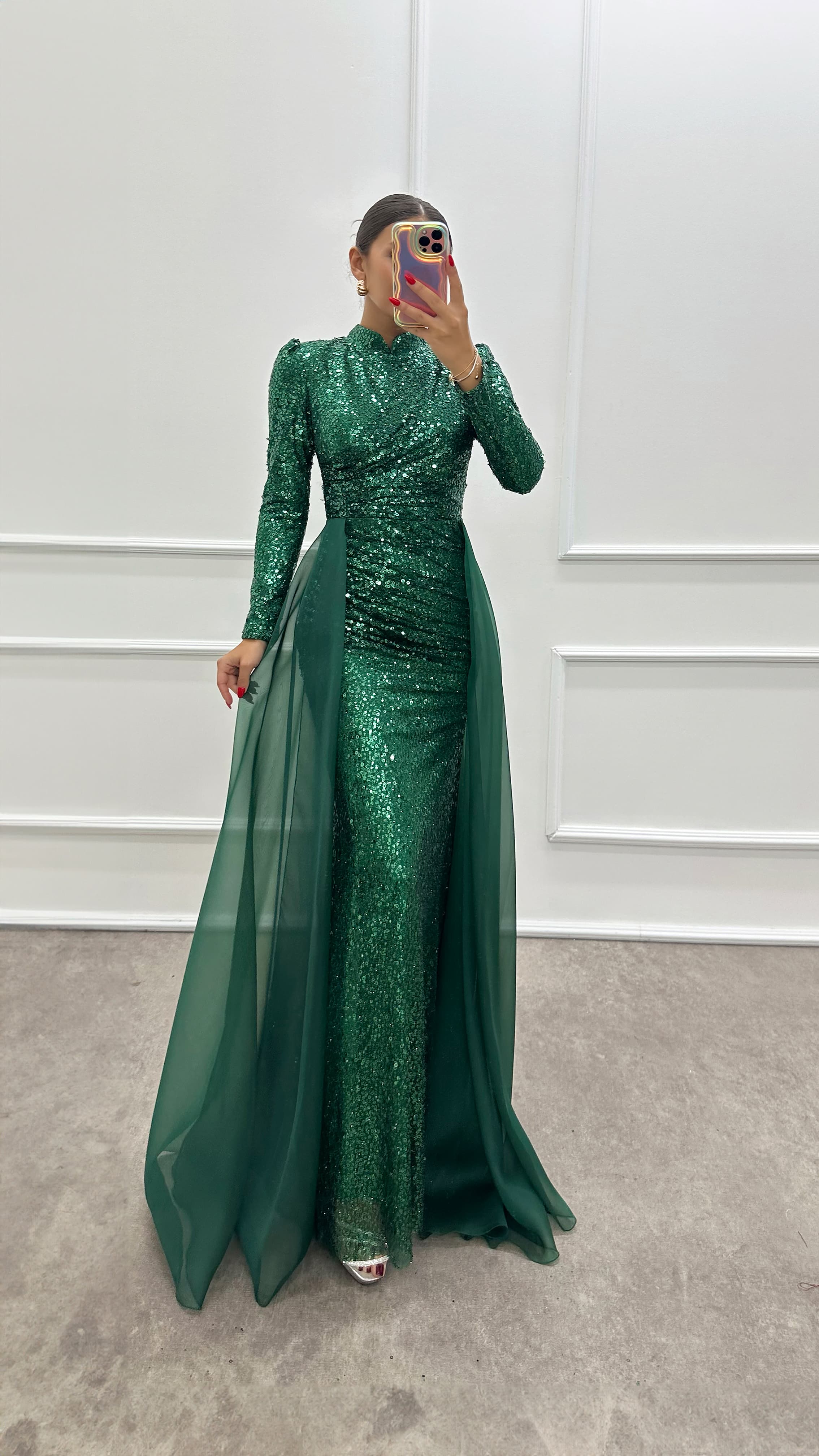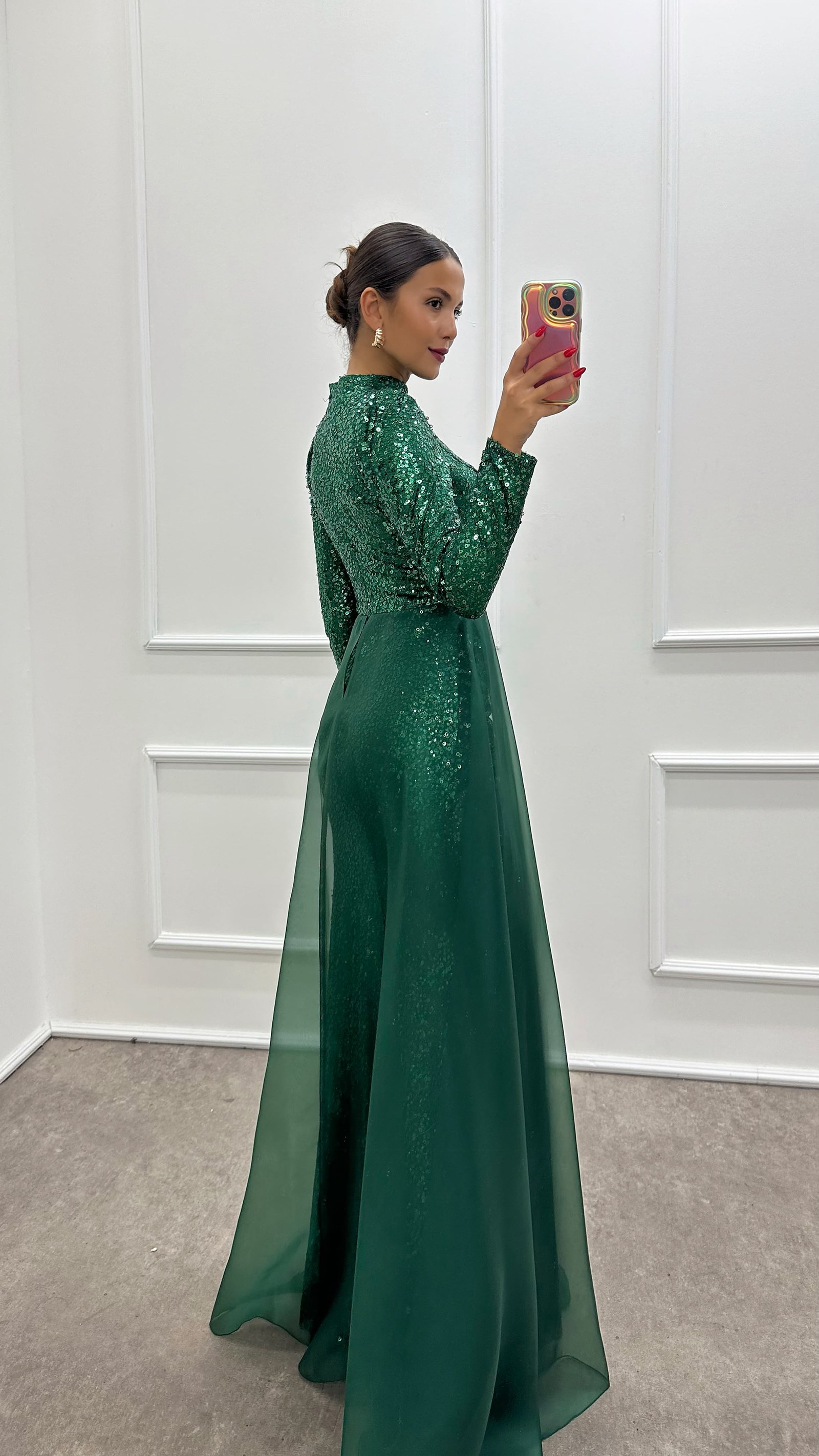 • Zümrüt Yeşili Tül Detay Payet Abiye Elbise