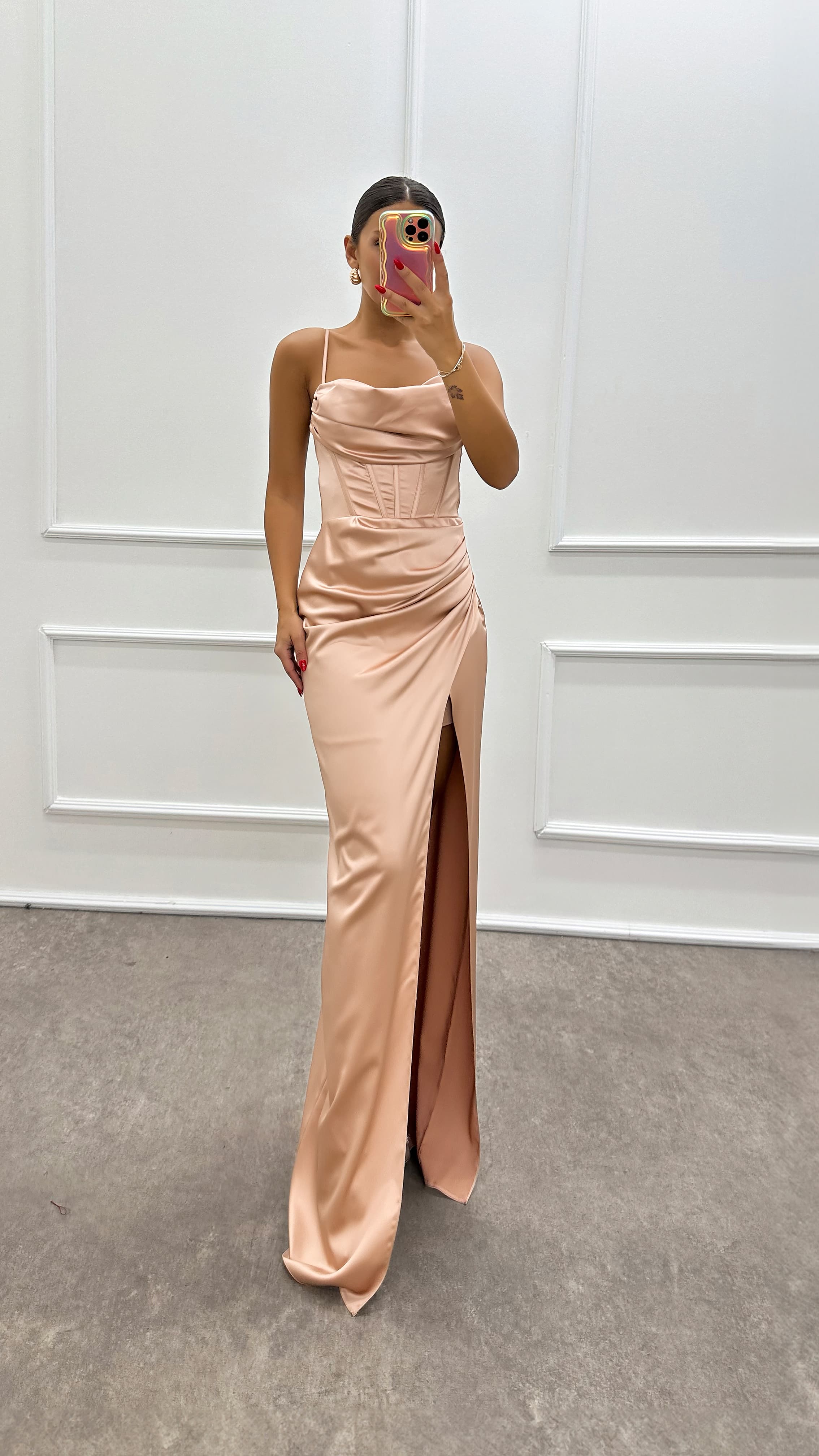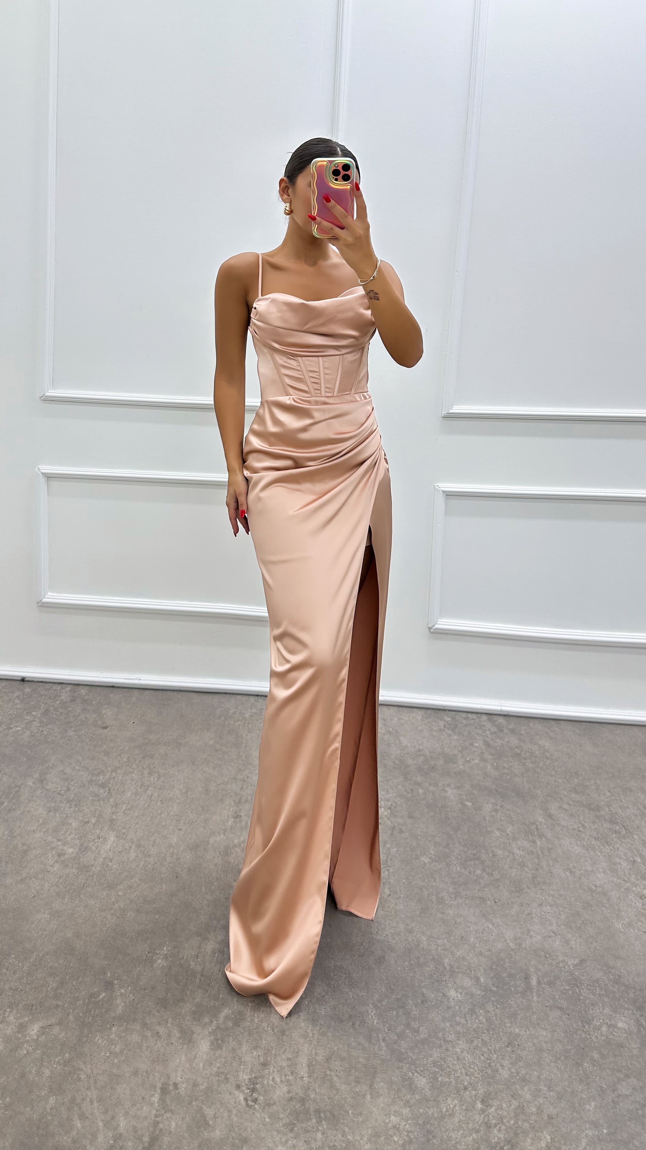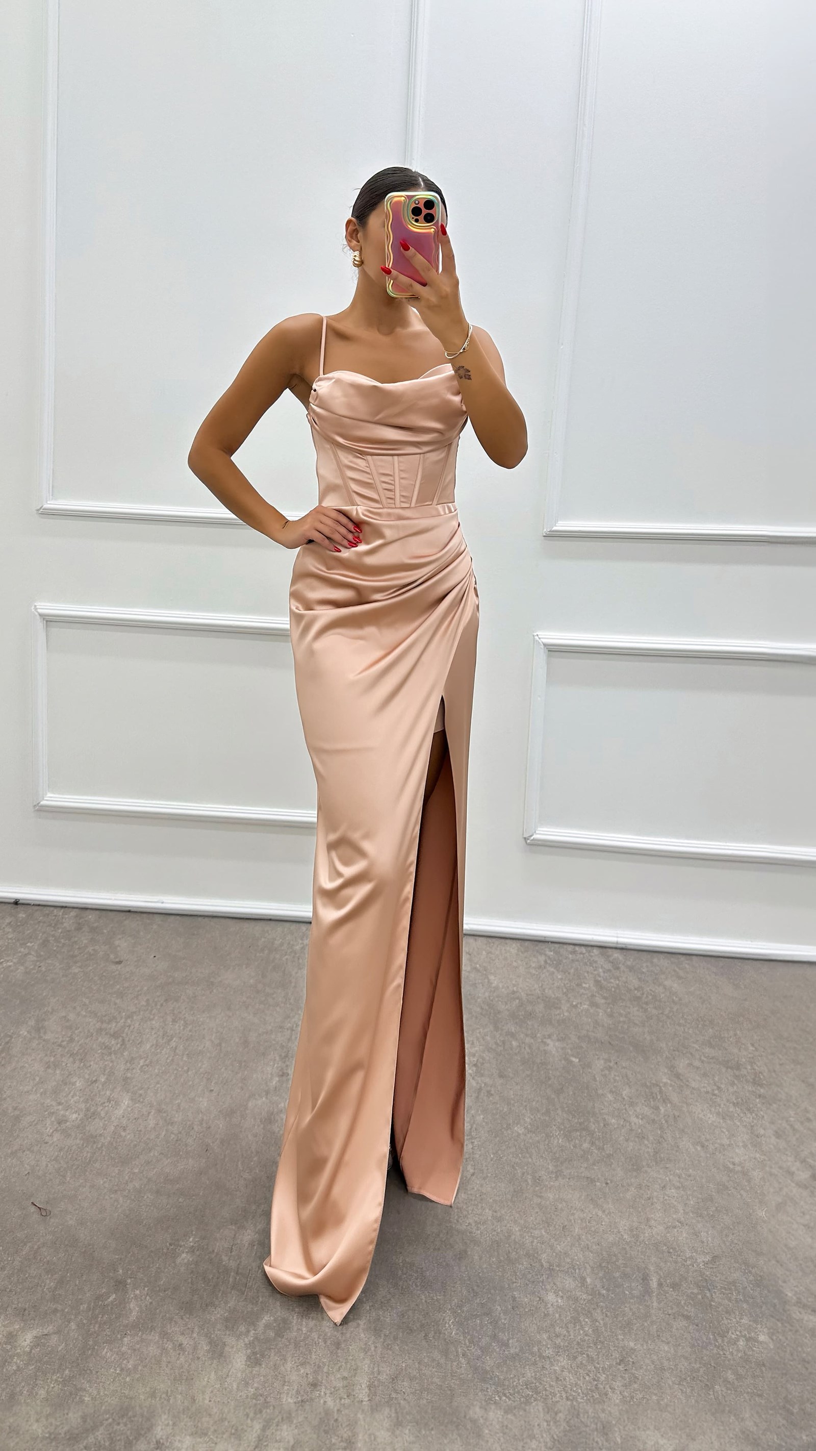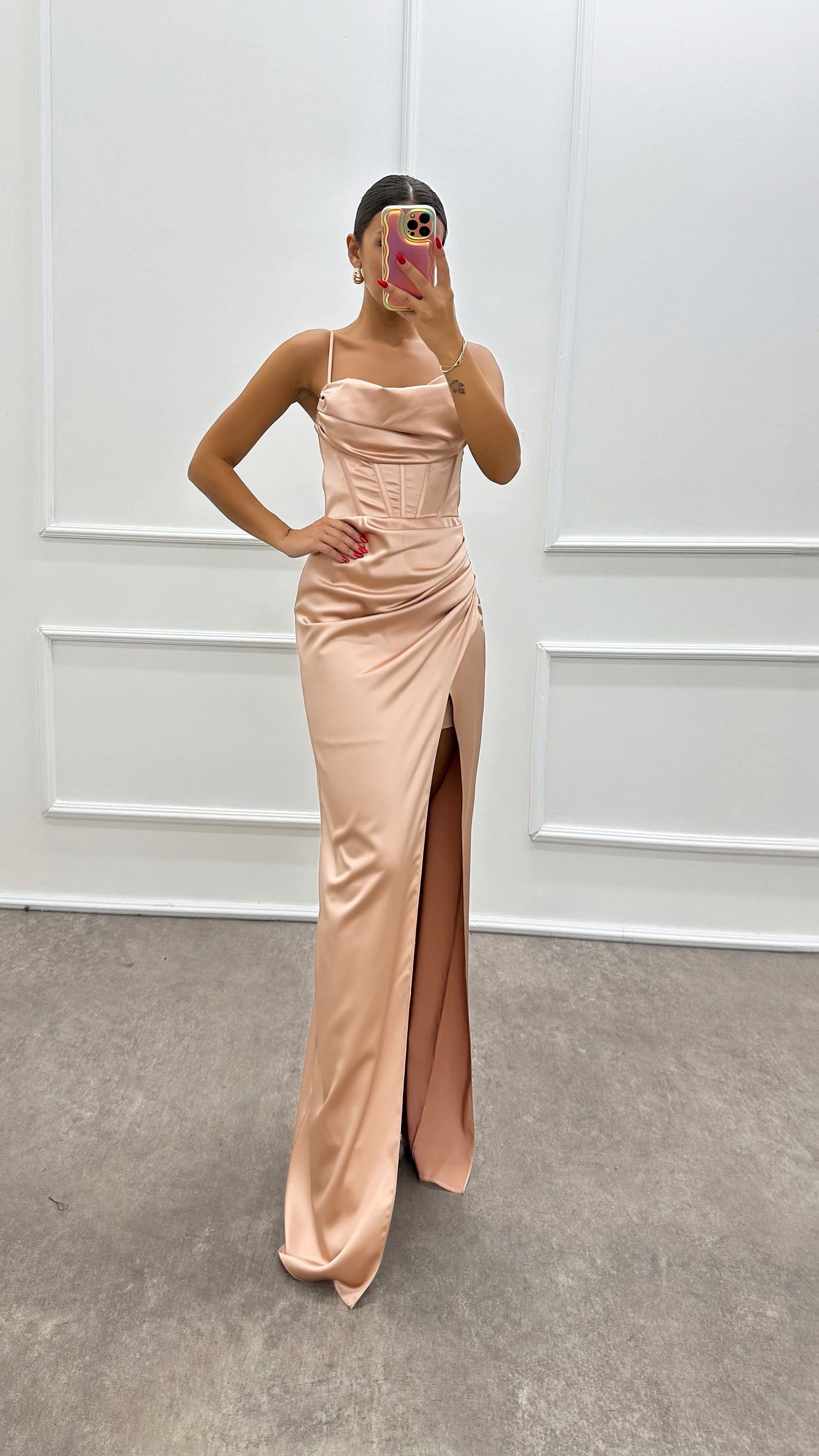 • Pudra İp Askılı Bel Detay Tasarım Saten Abiye Elbise