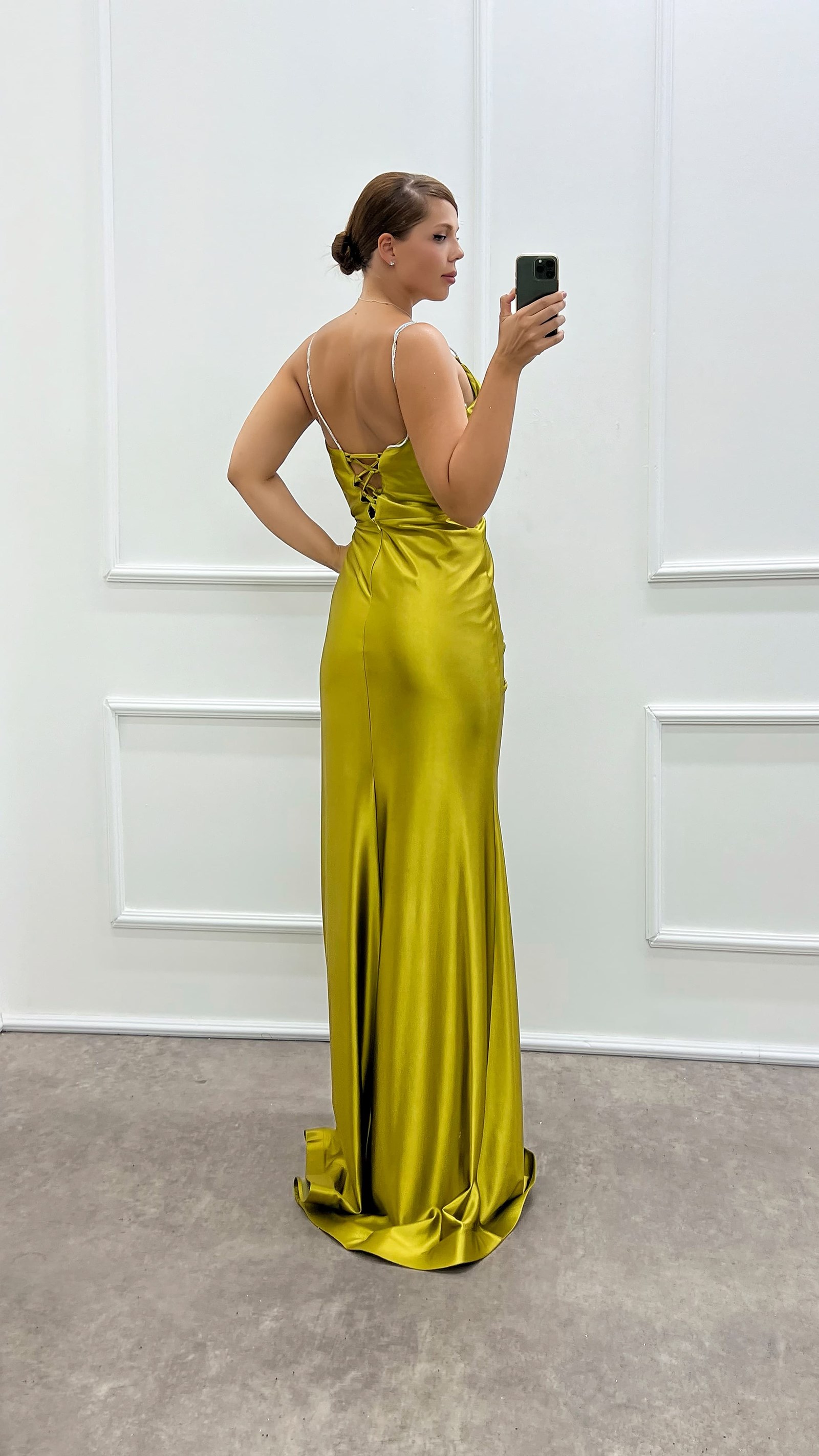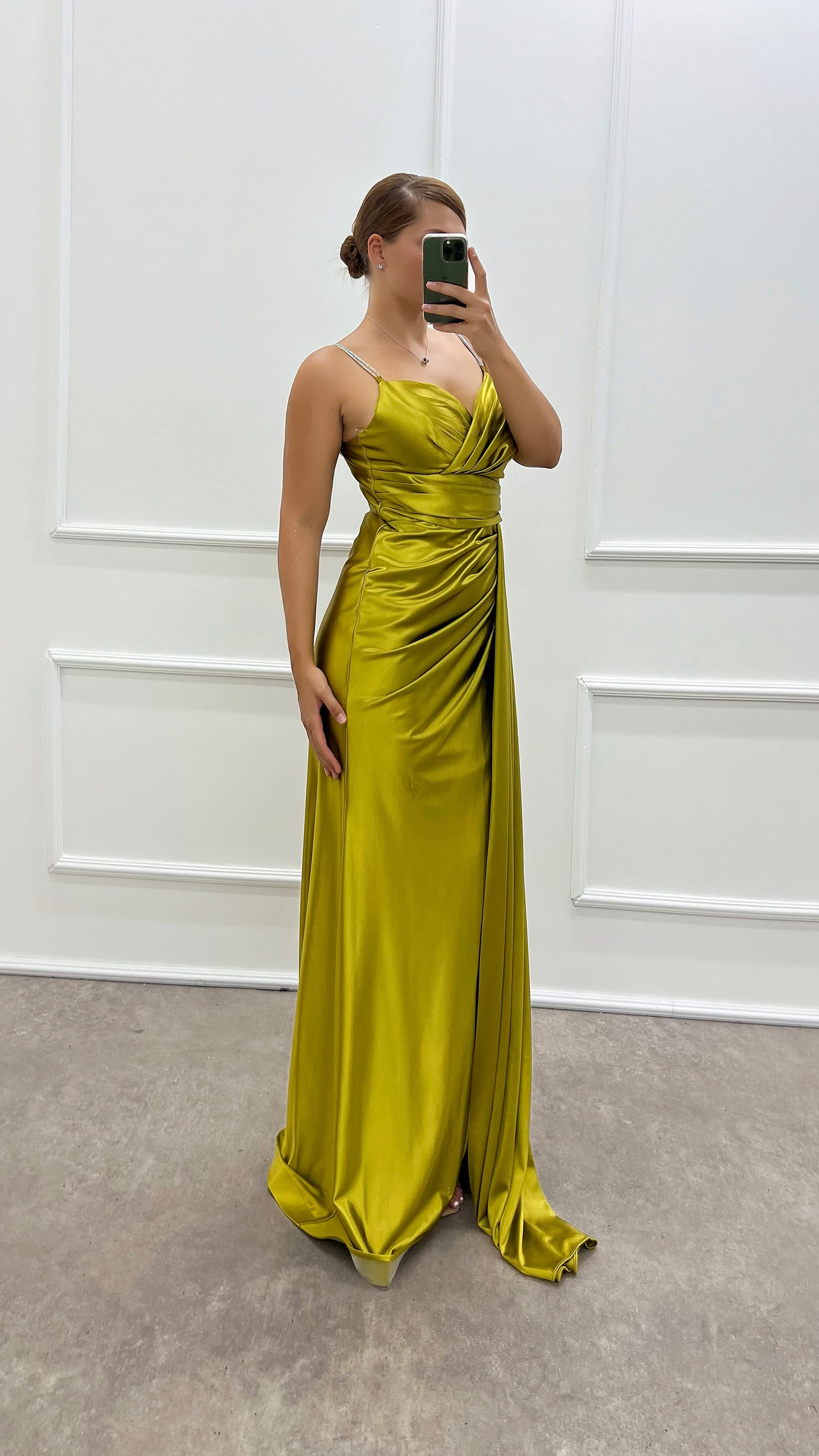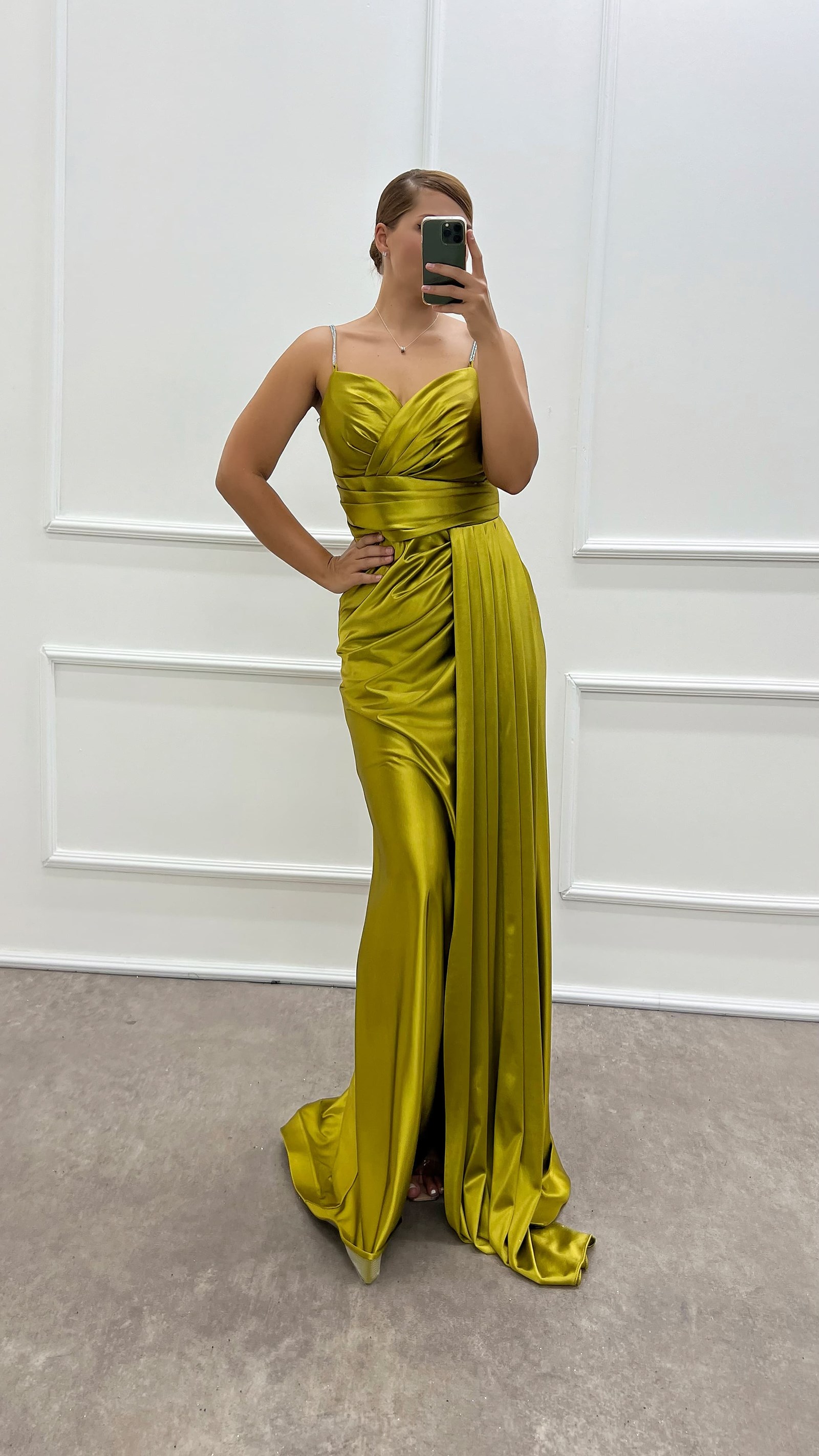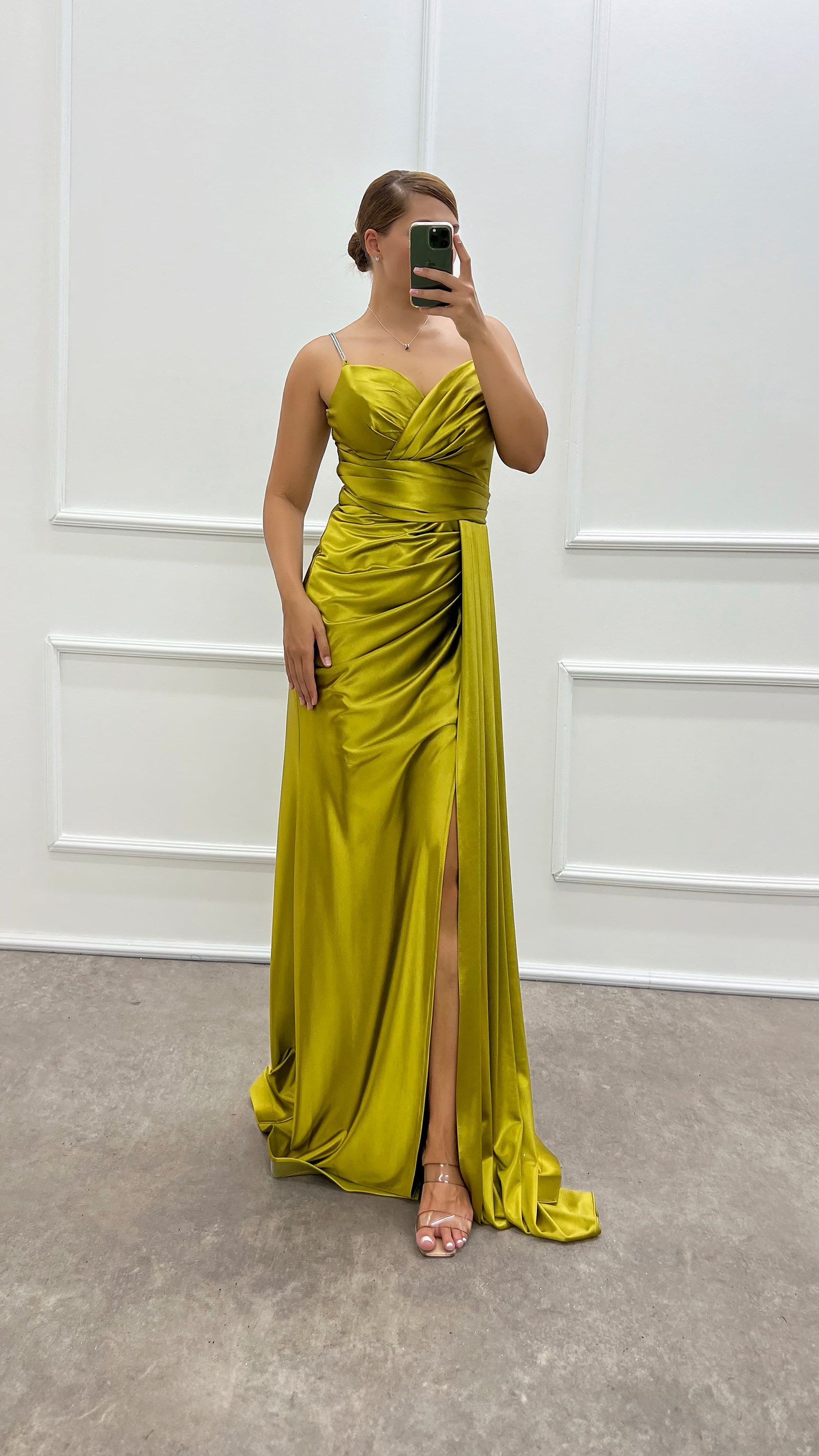 Sarı Straplez Bel Detay Büyük Beden Tasarım Saten Abiye Elbise