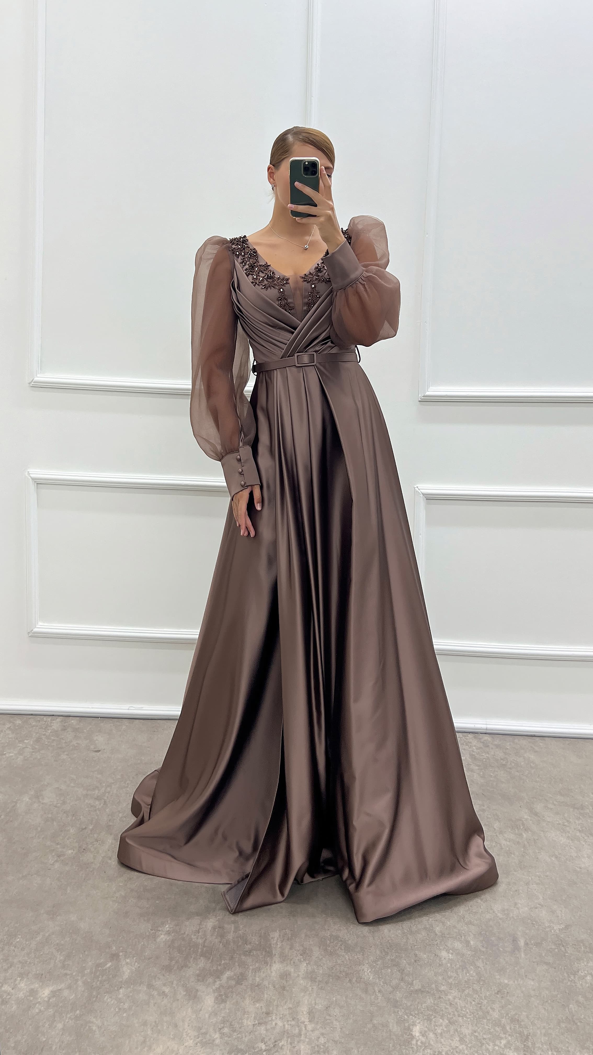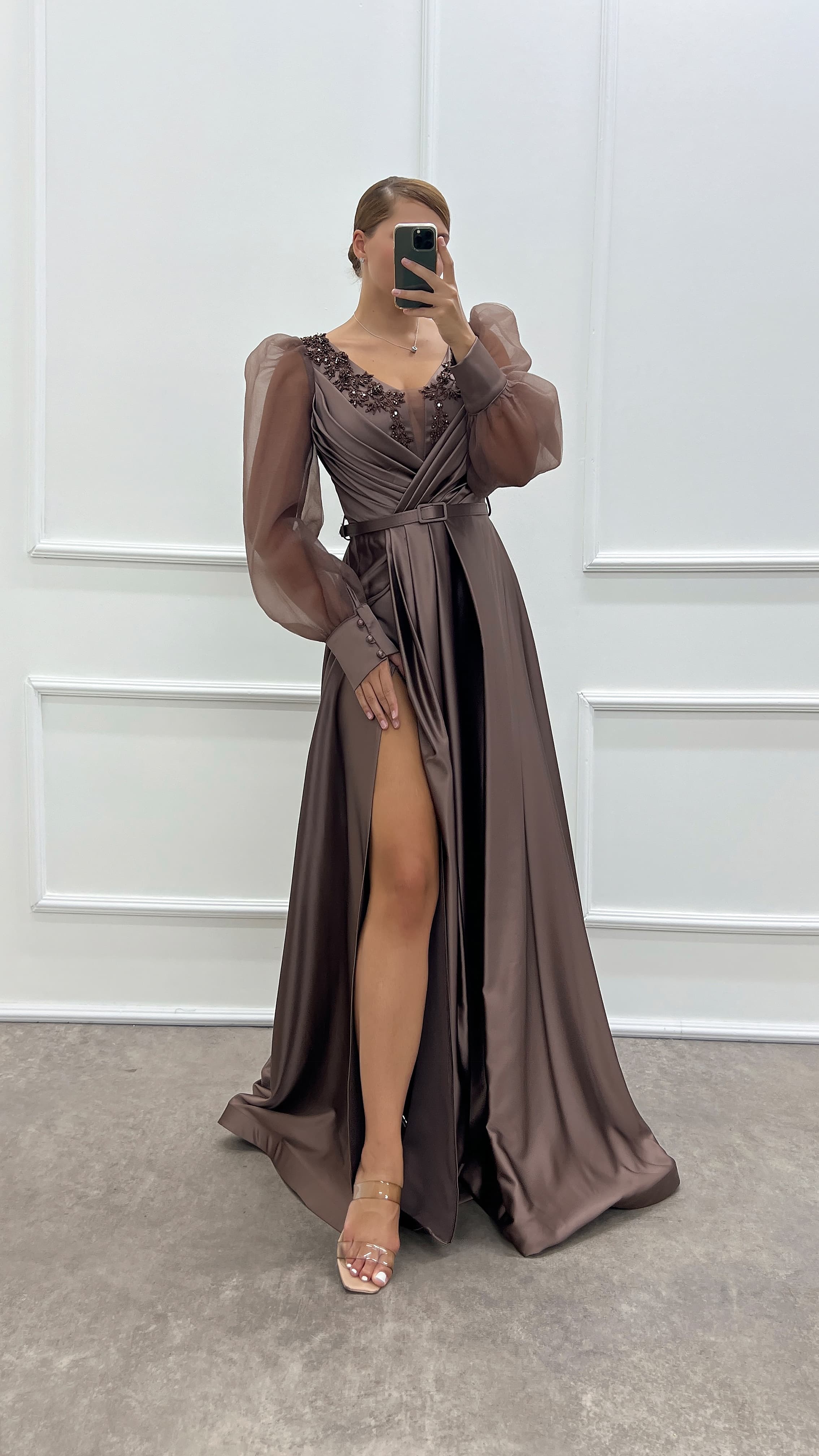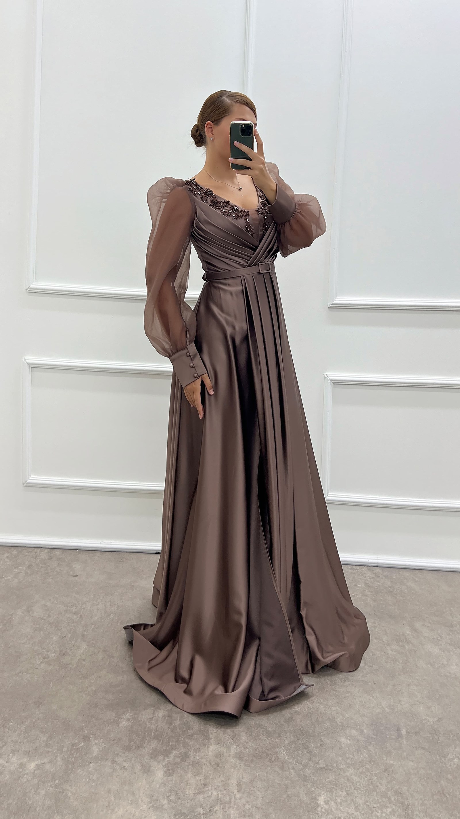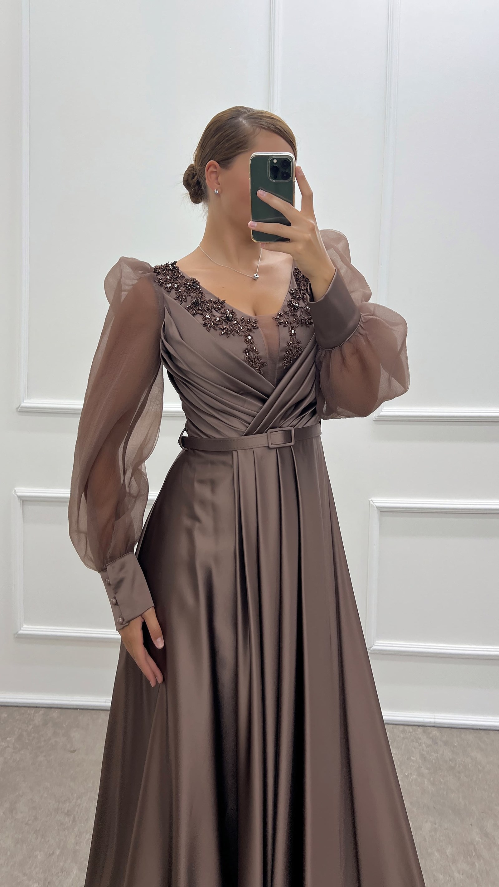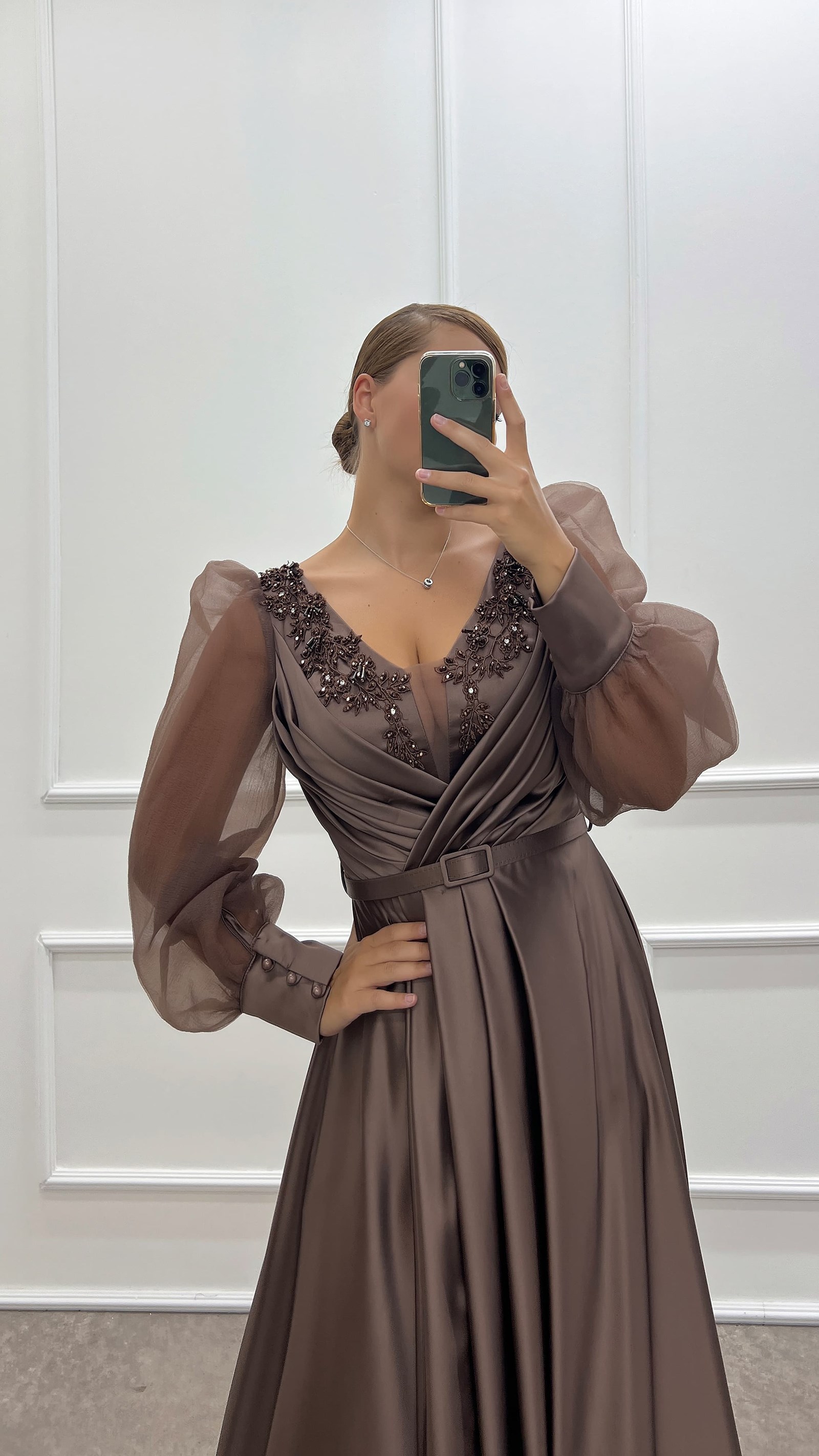• Kahverengi Balon Kol Göğsü İşlemeli Tasarım Saten Büyük Beden Abiye Elbise