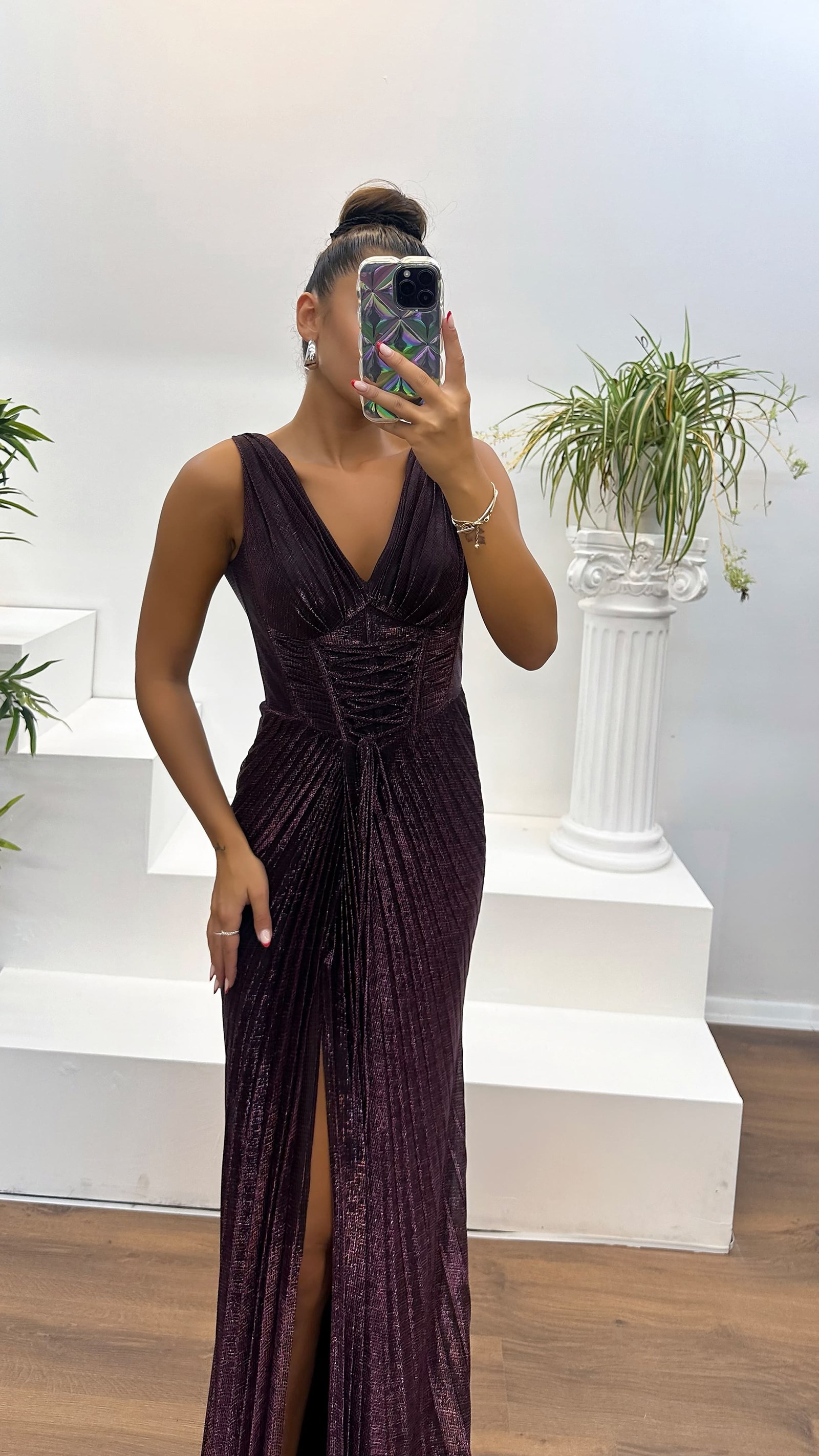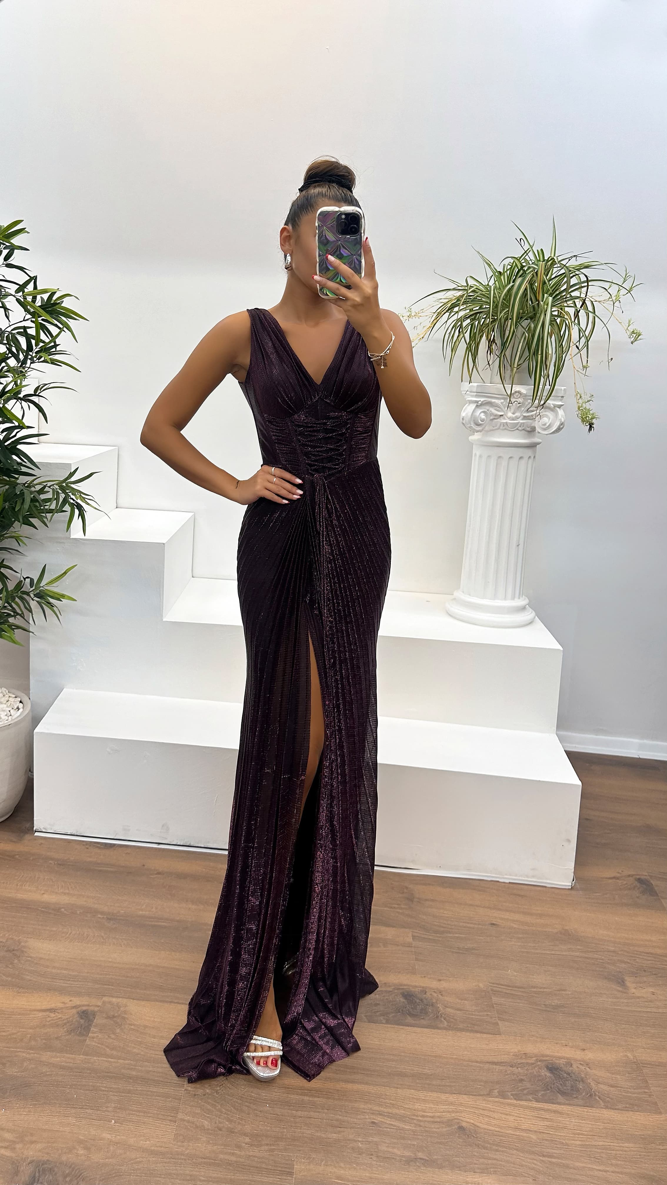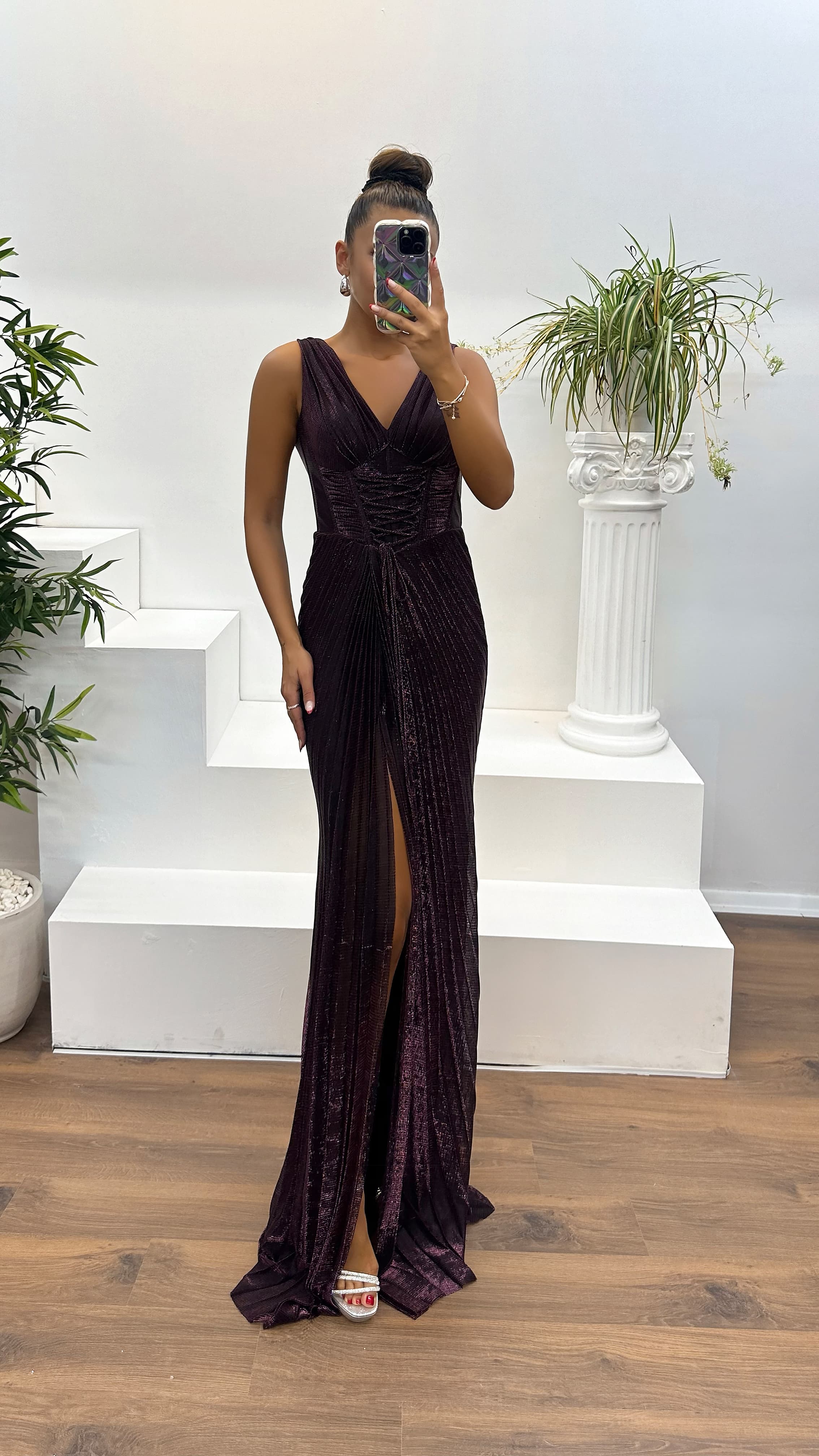 • Mürdüm V Yaka Bel Detay Abiye Elbise