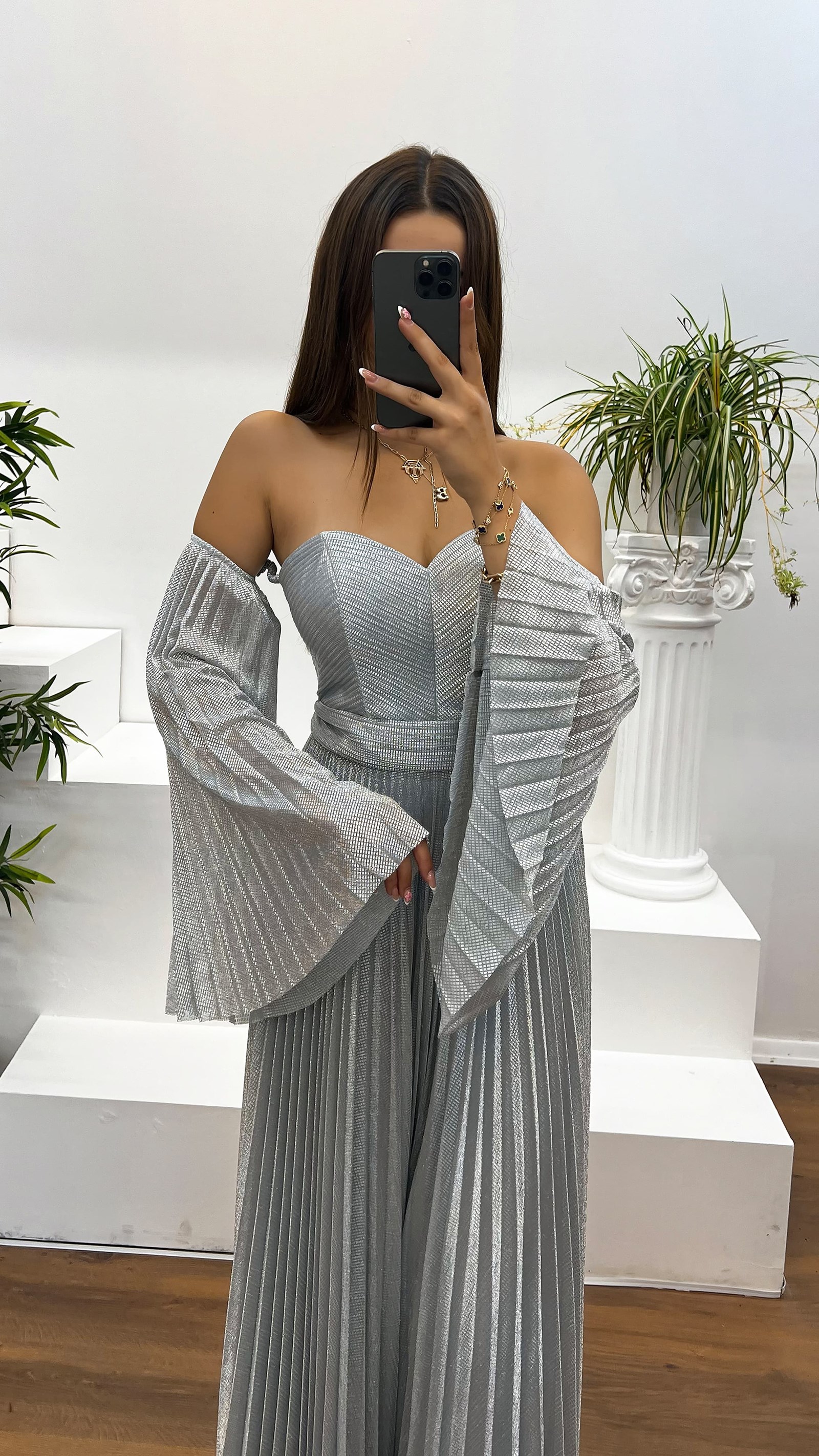 • Gümüş Kalp Yaka Pliseli Abiye Elbise