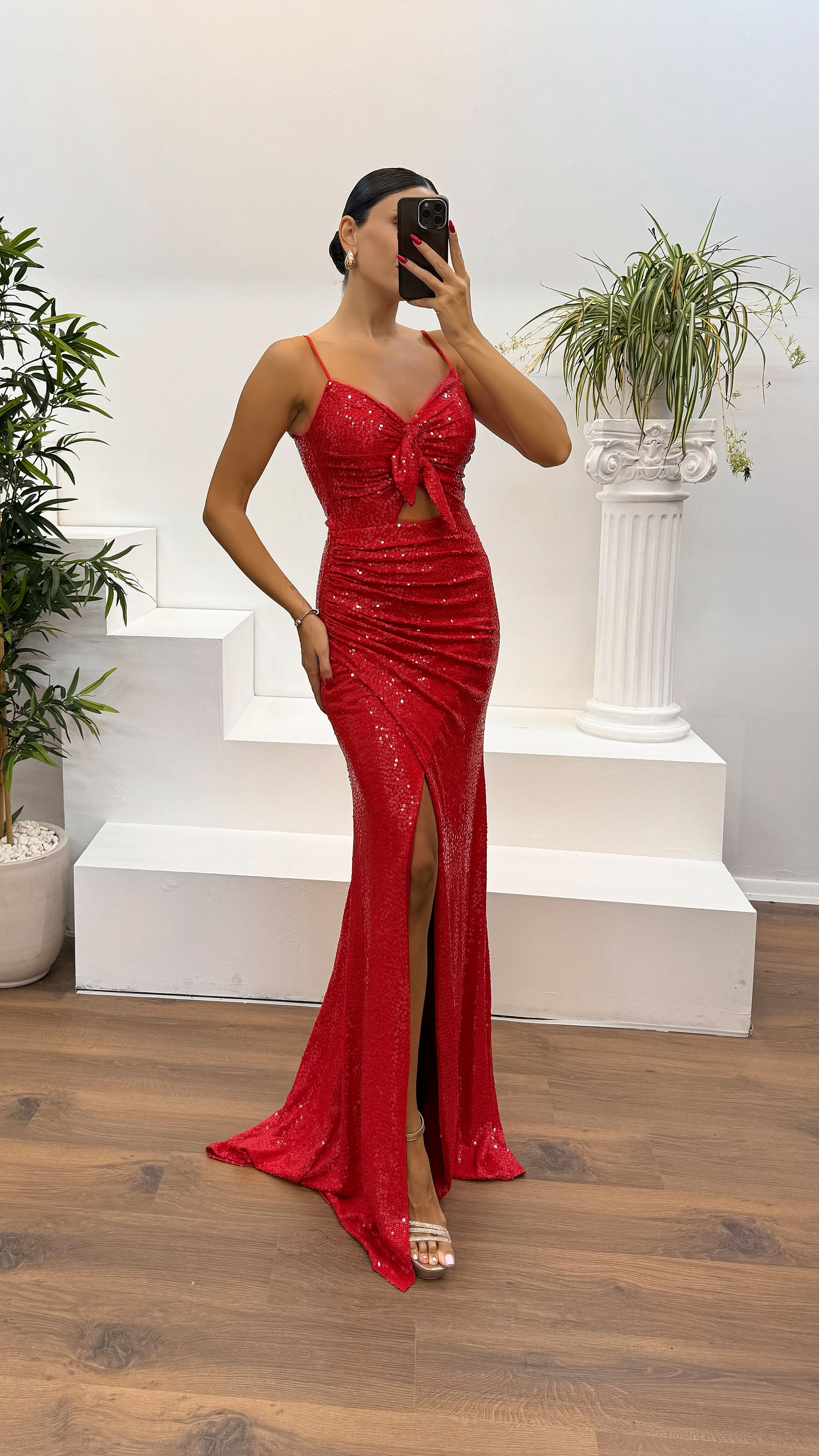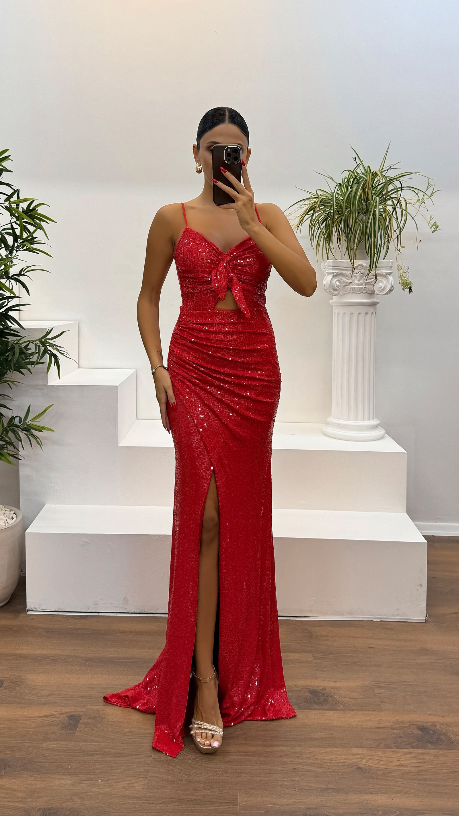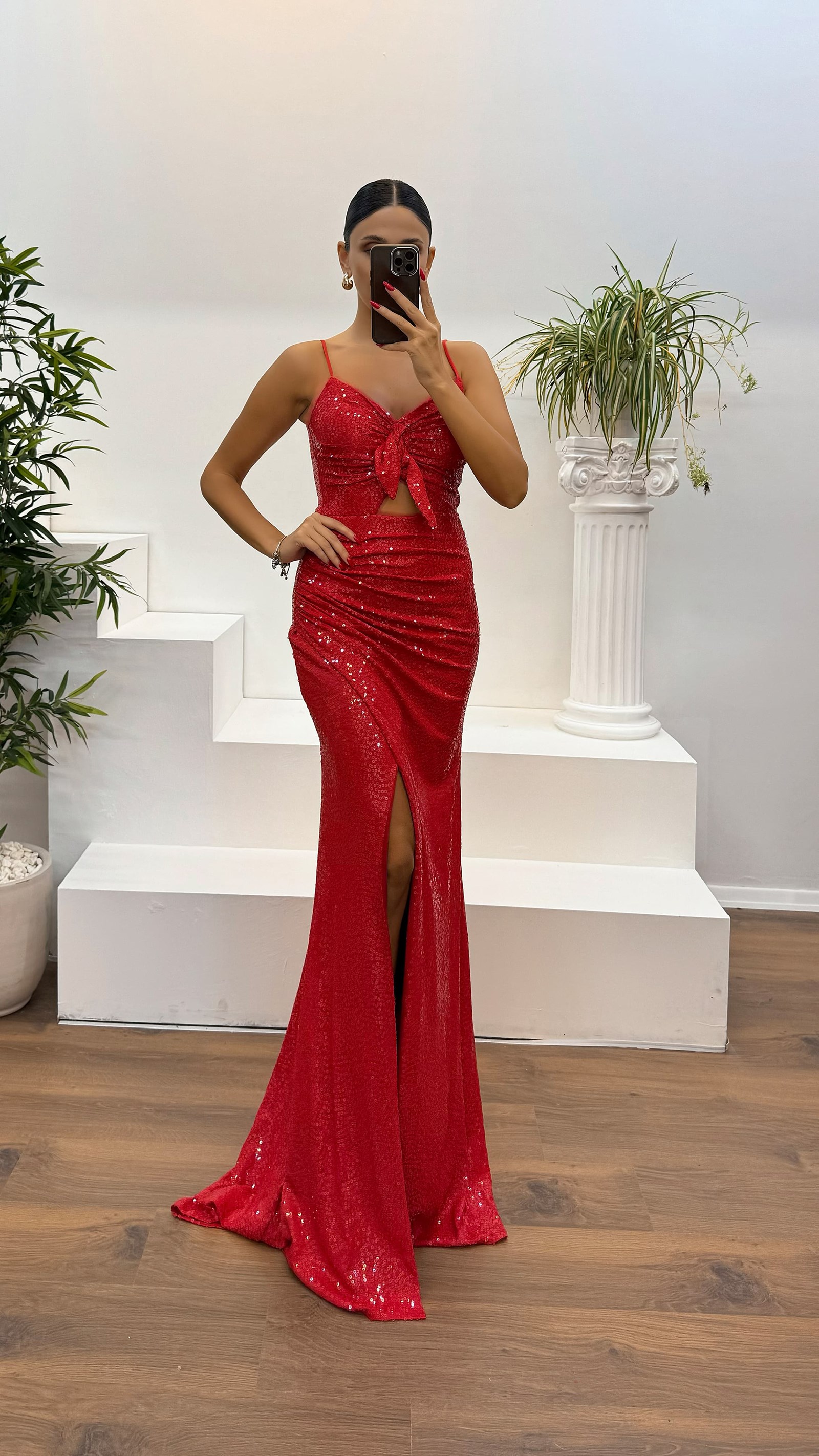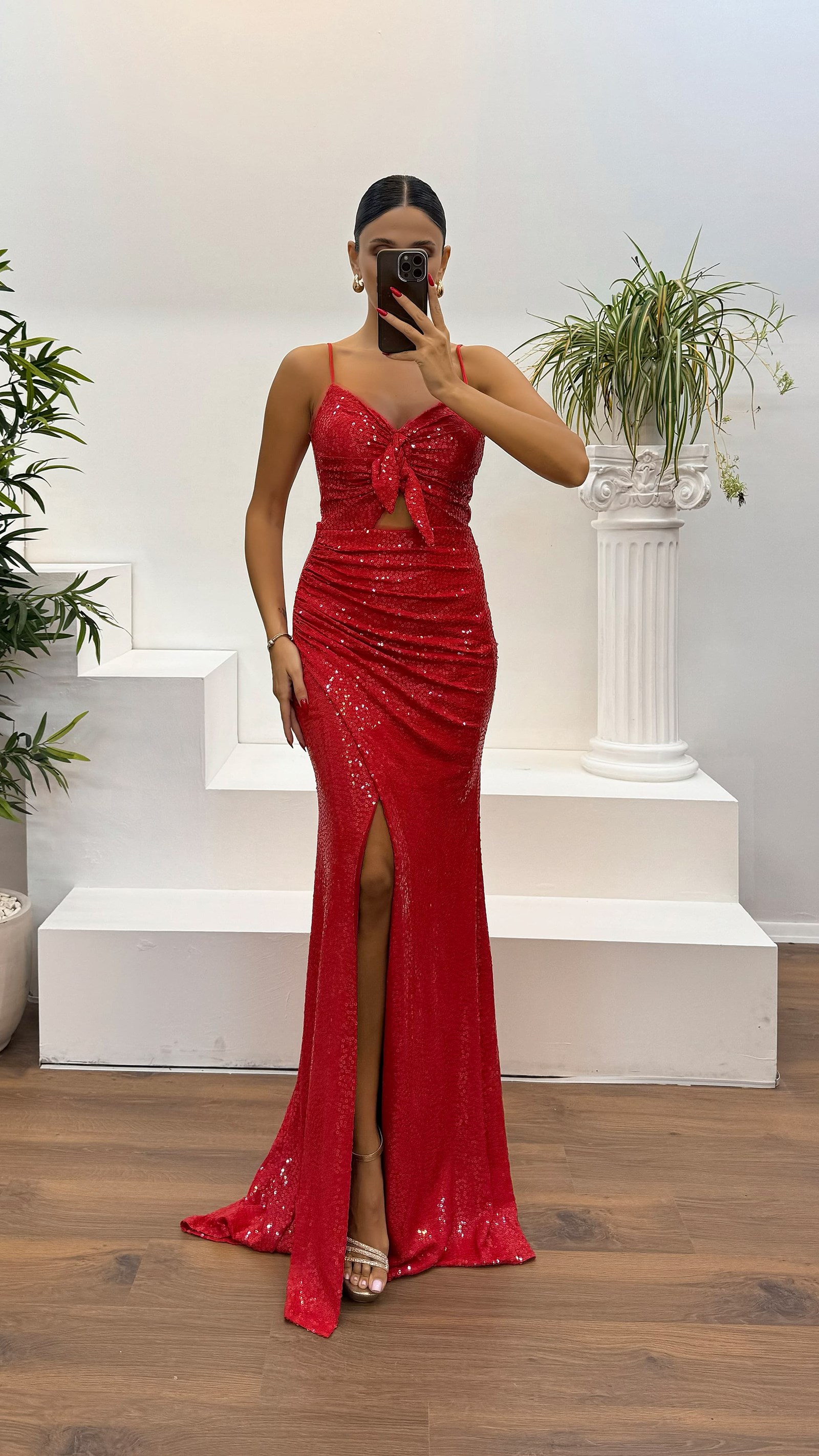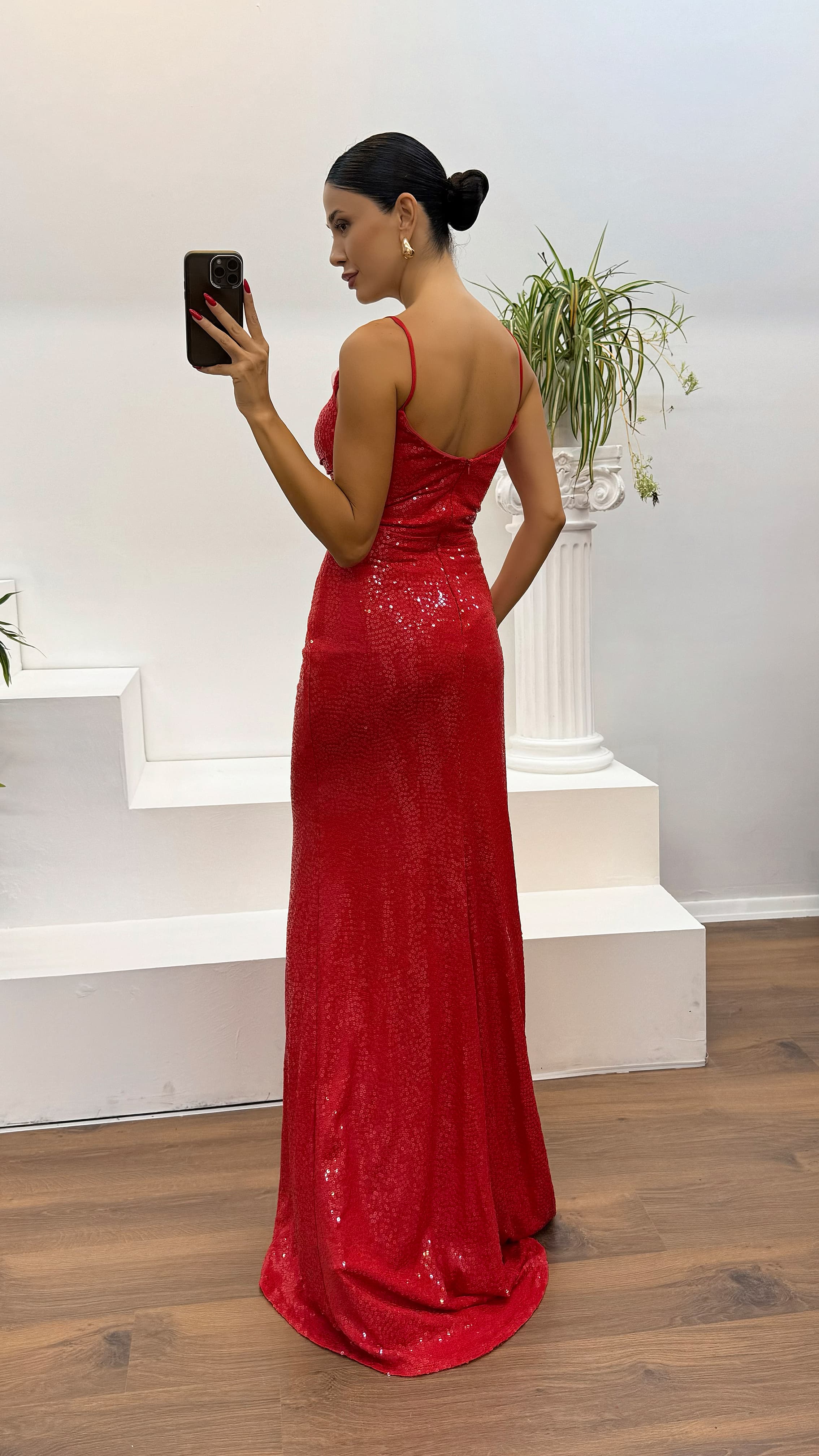 Kırmızı İp Askılı Pul Payet Abiye Elbise