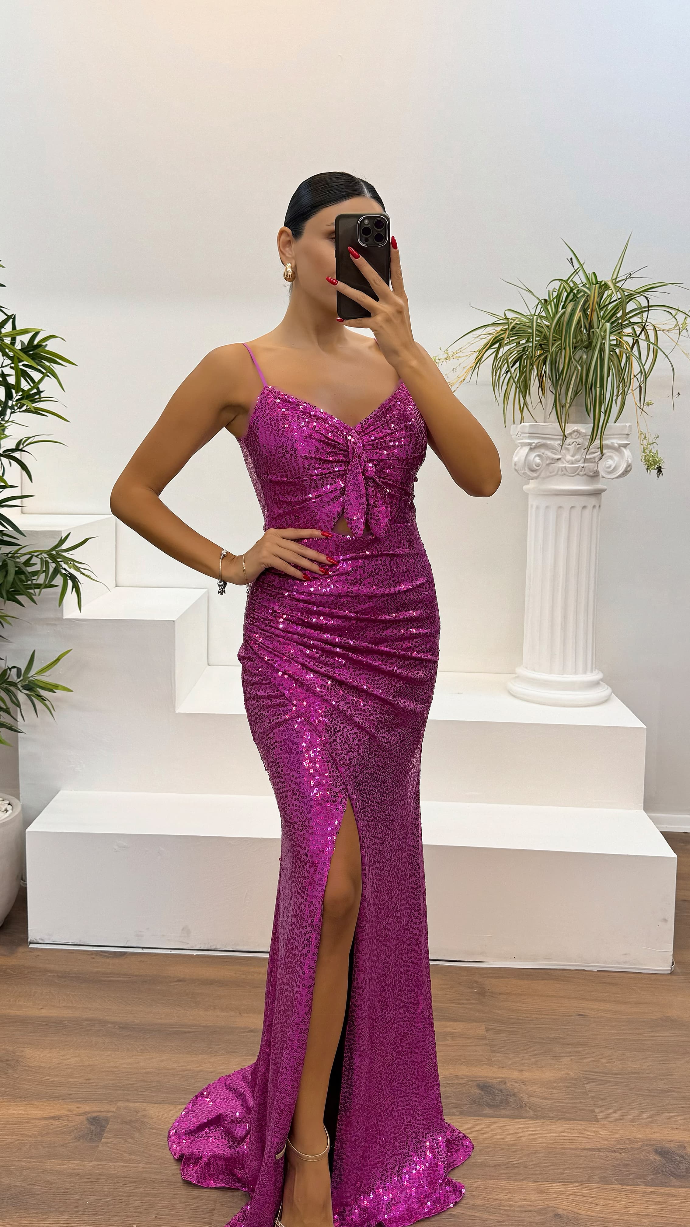 Fuşya İp Askılı Pul Payet Abiye Elbise