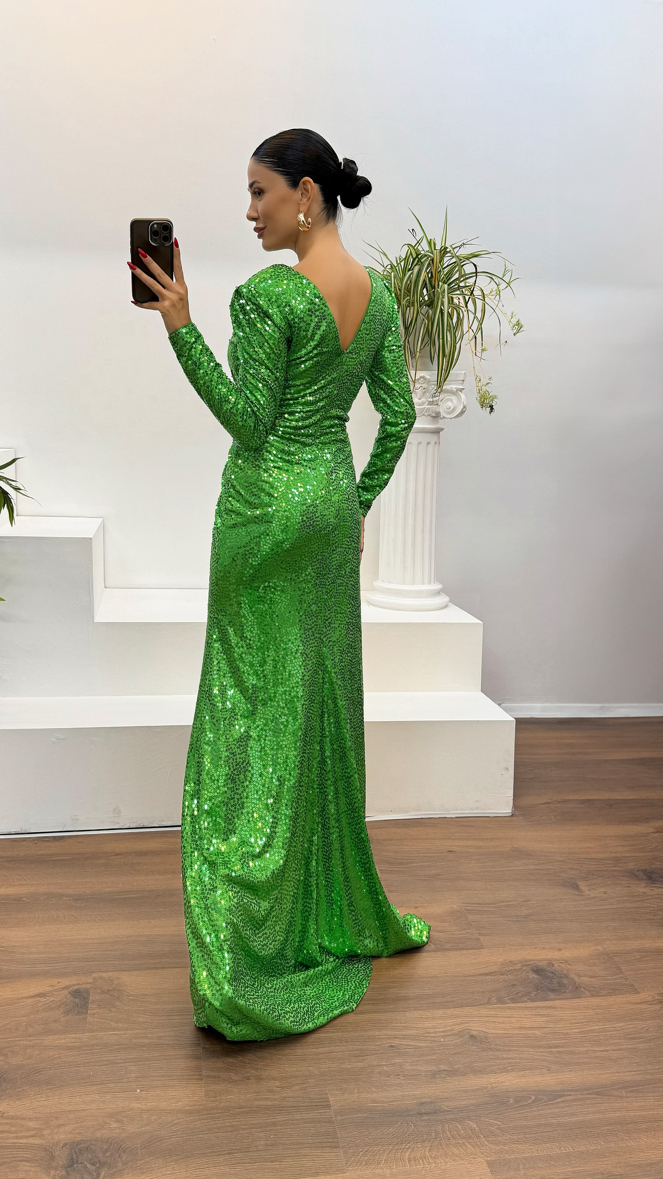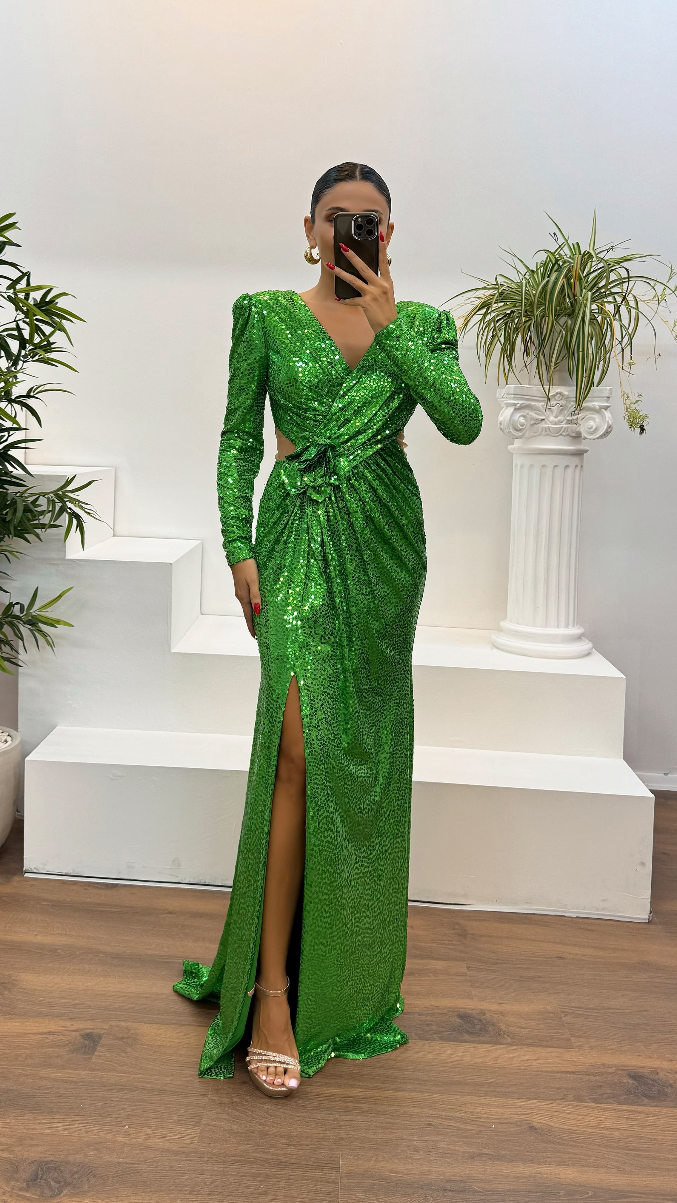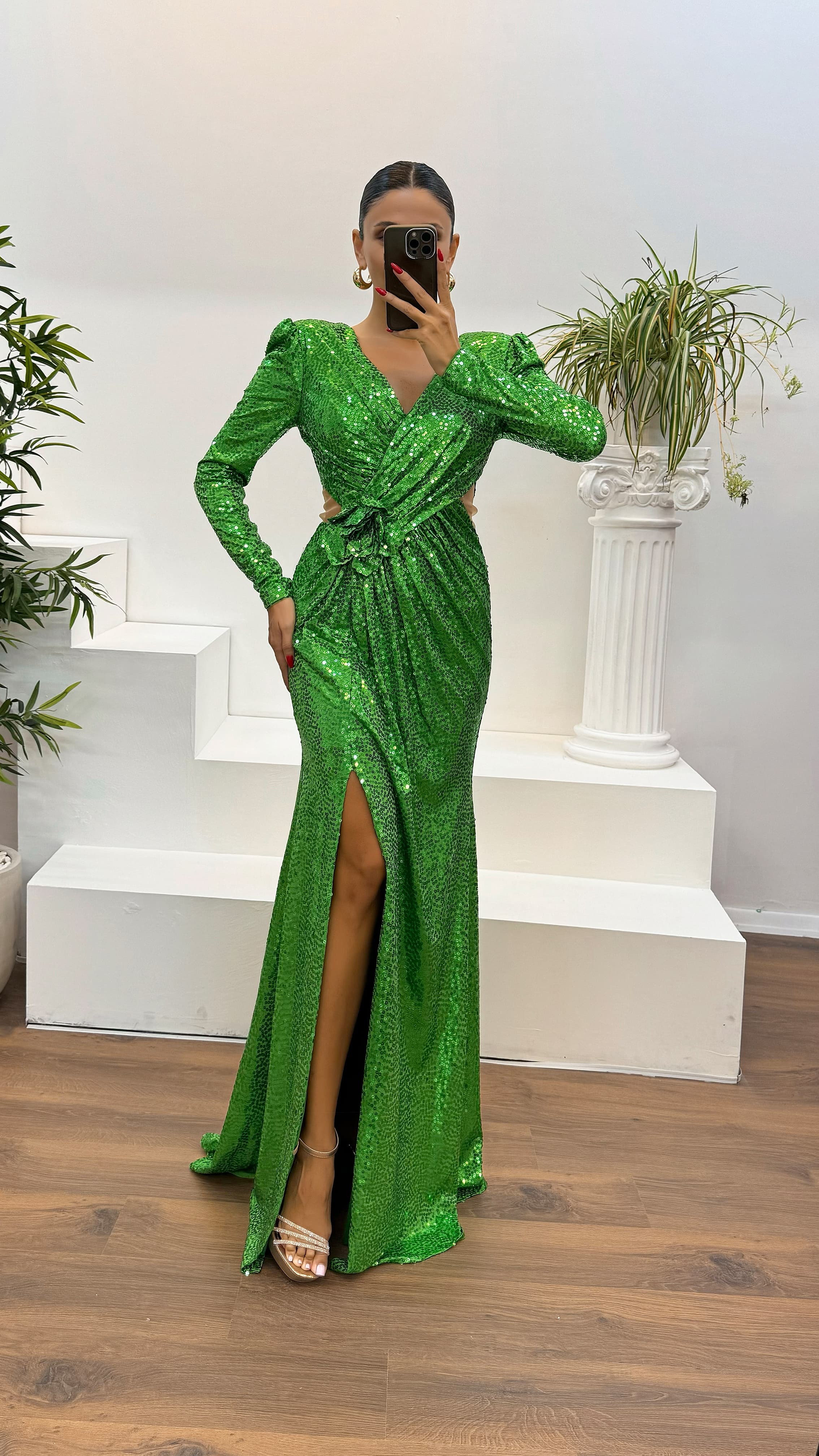 • Yeşil Pul Payet Bel Detay Abiye Elbise