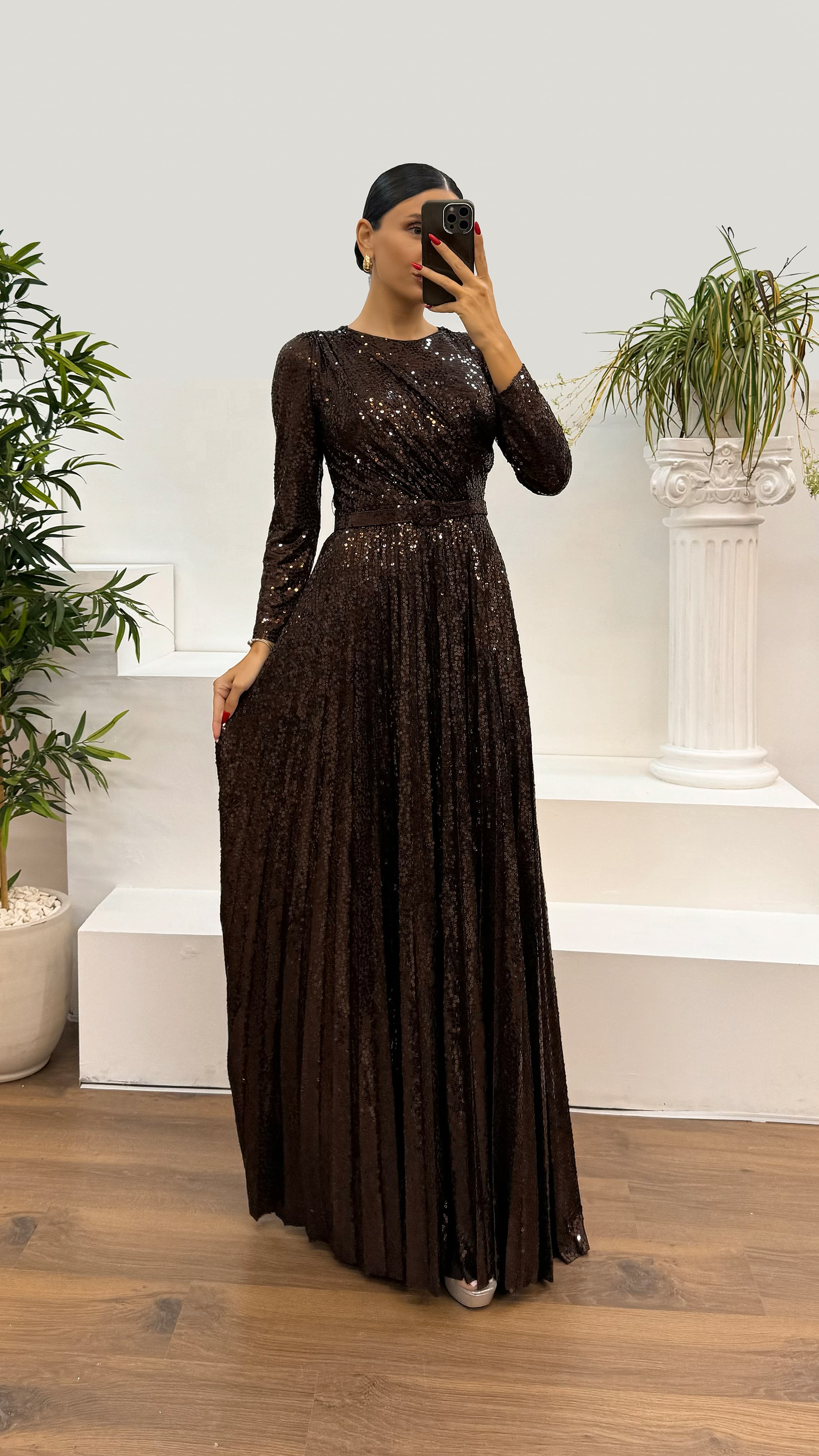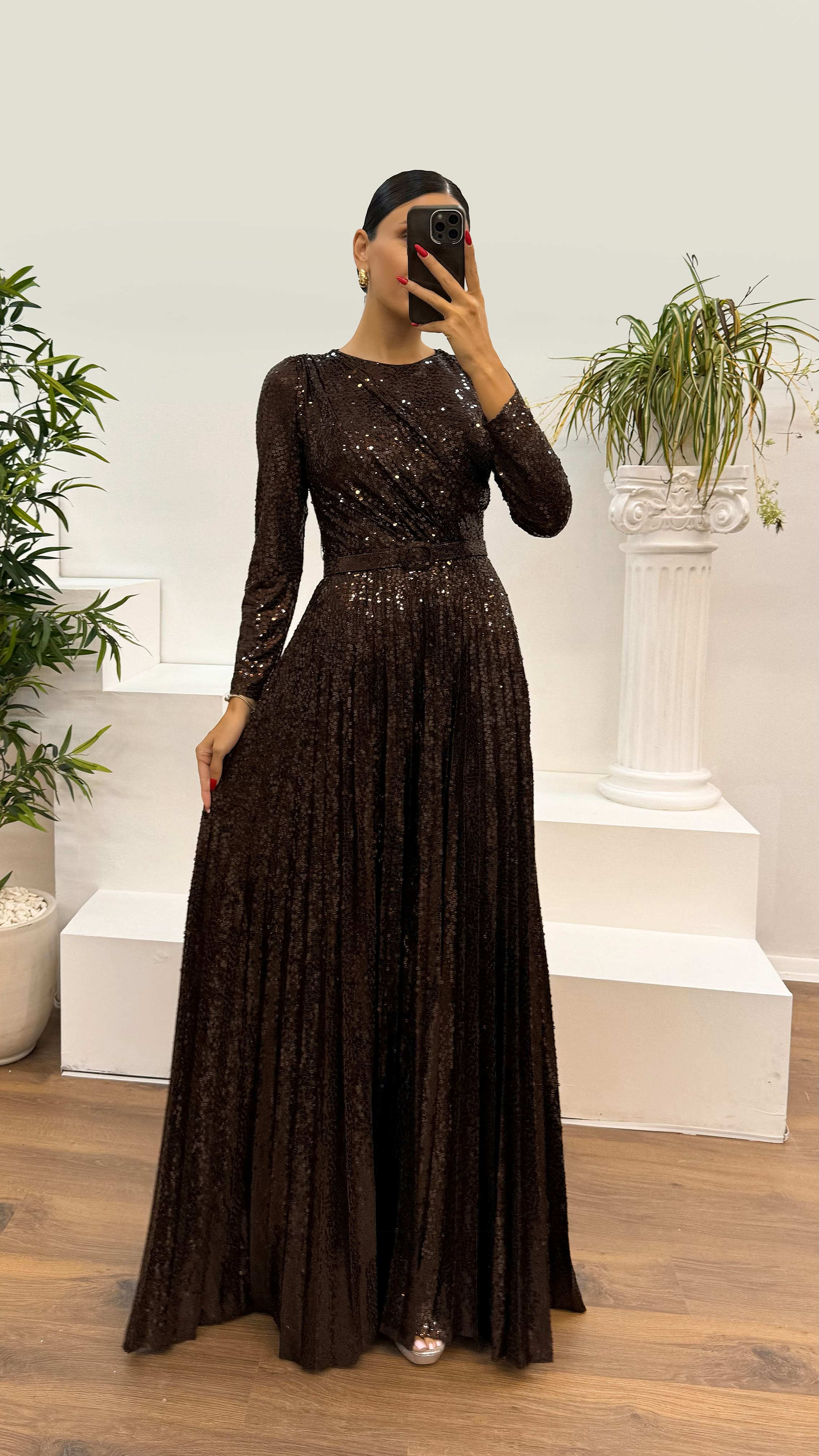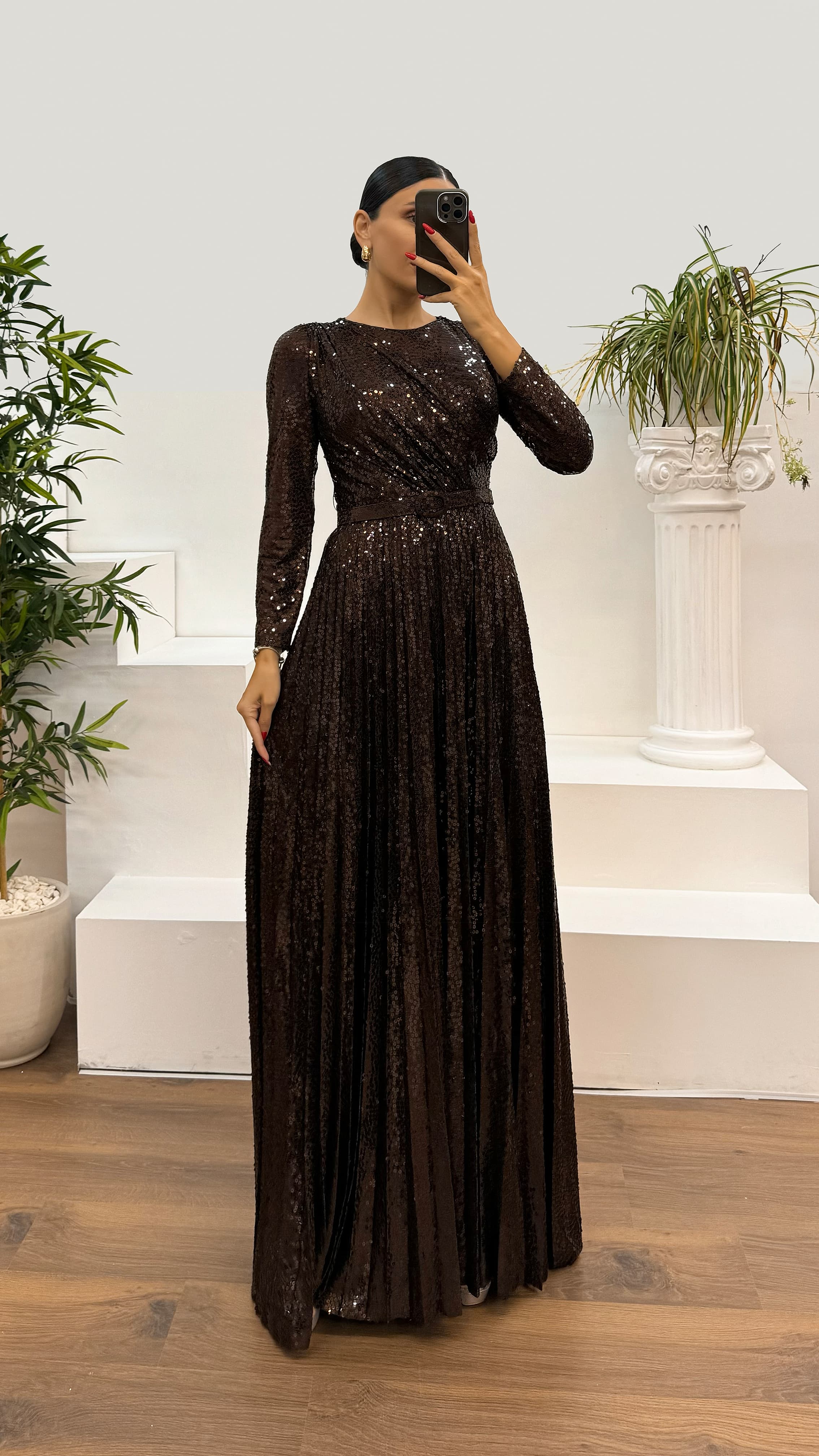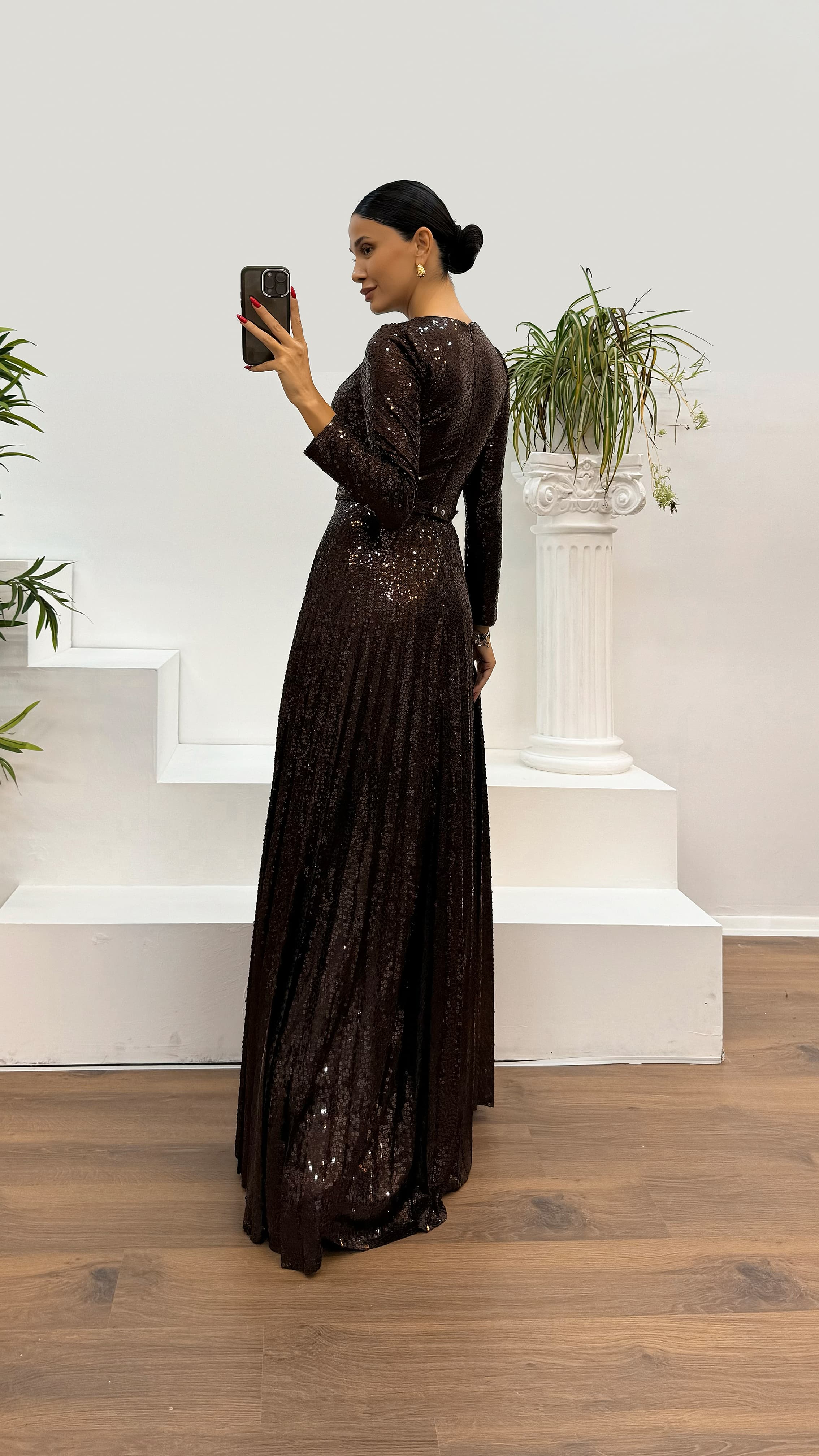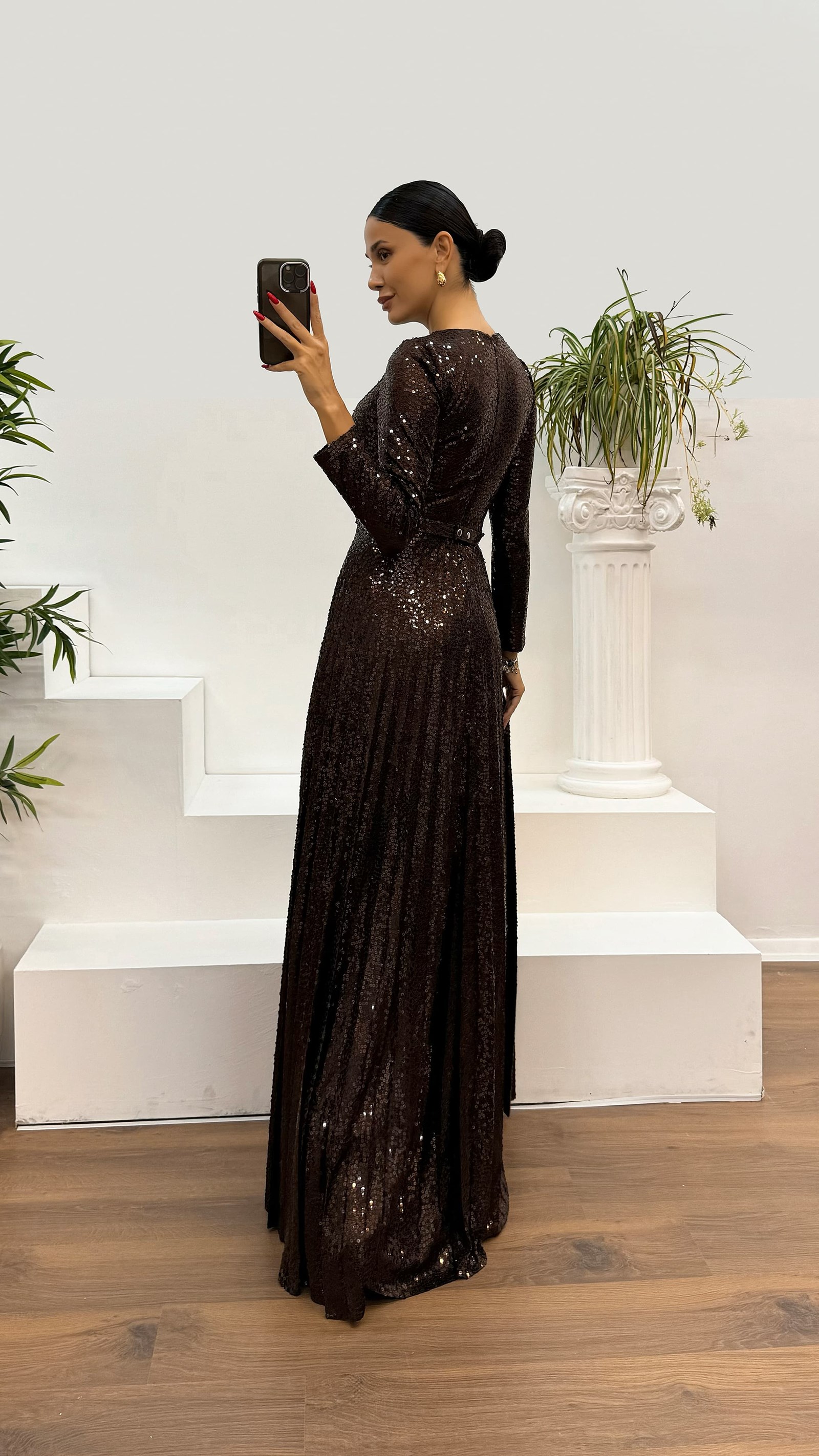 Kahverengi Uzun Kol Pul Payet Abiye Elbise