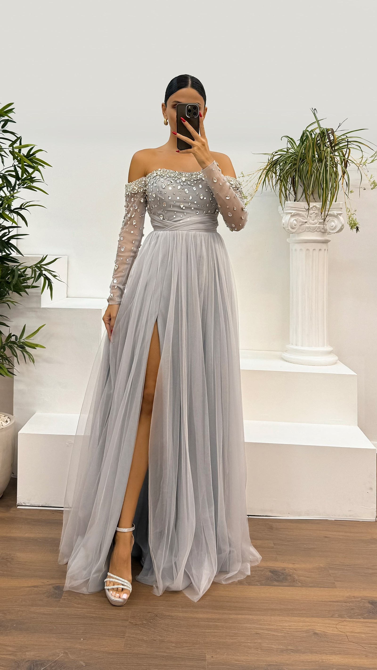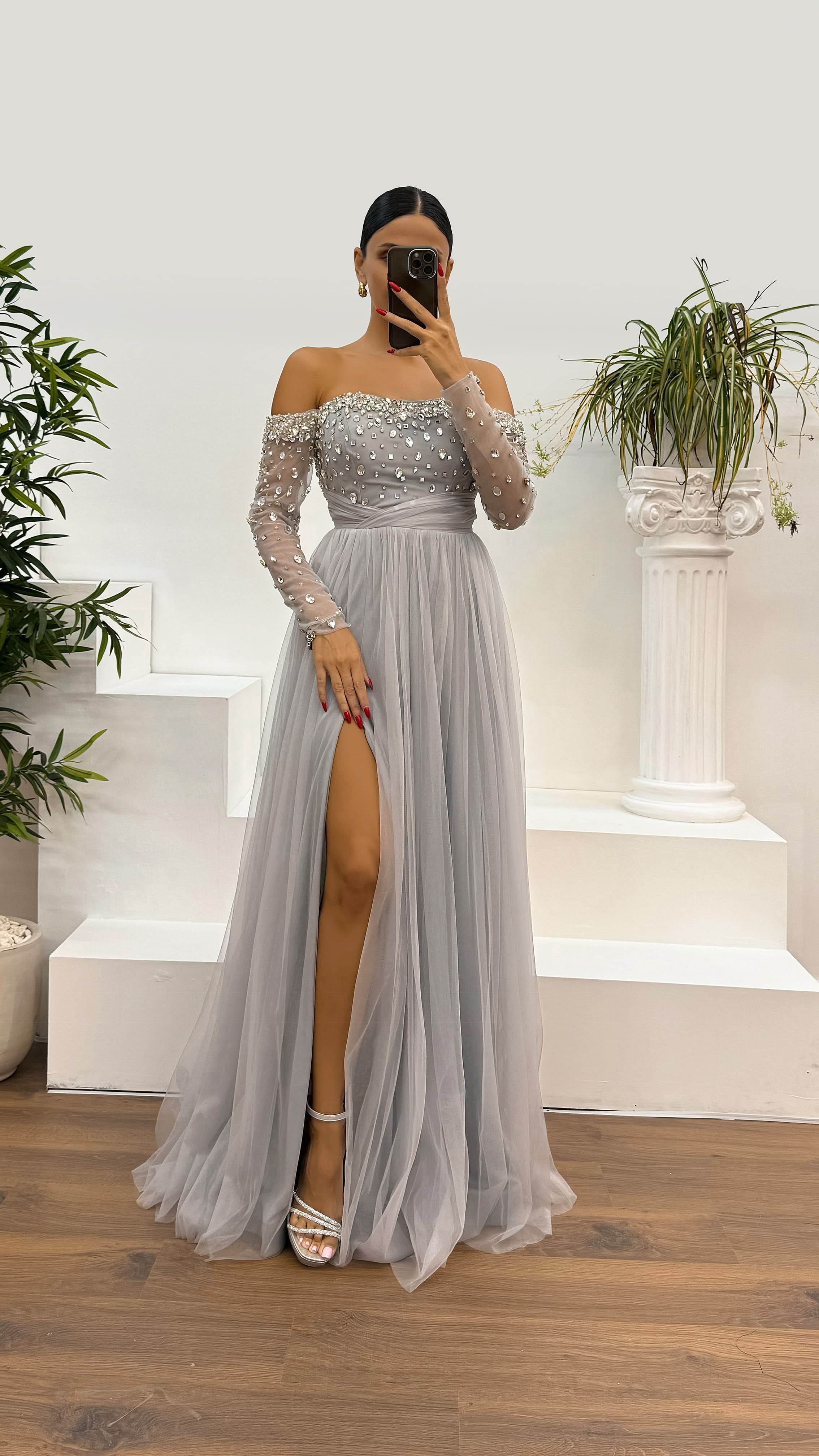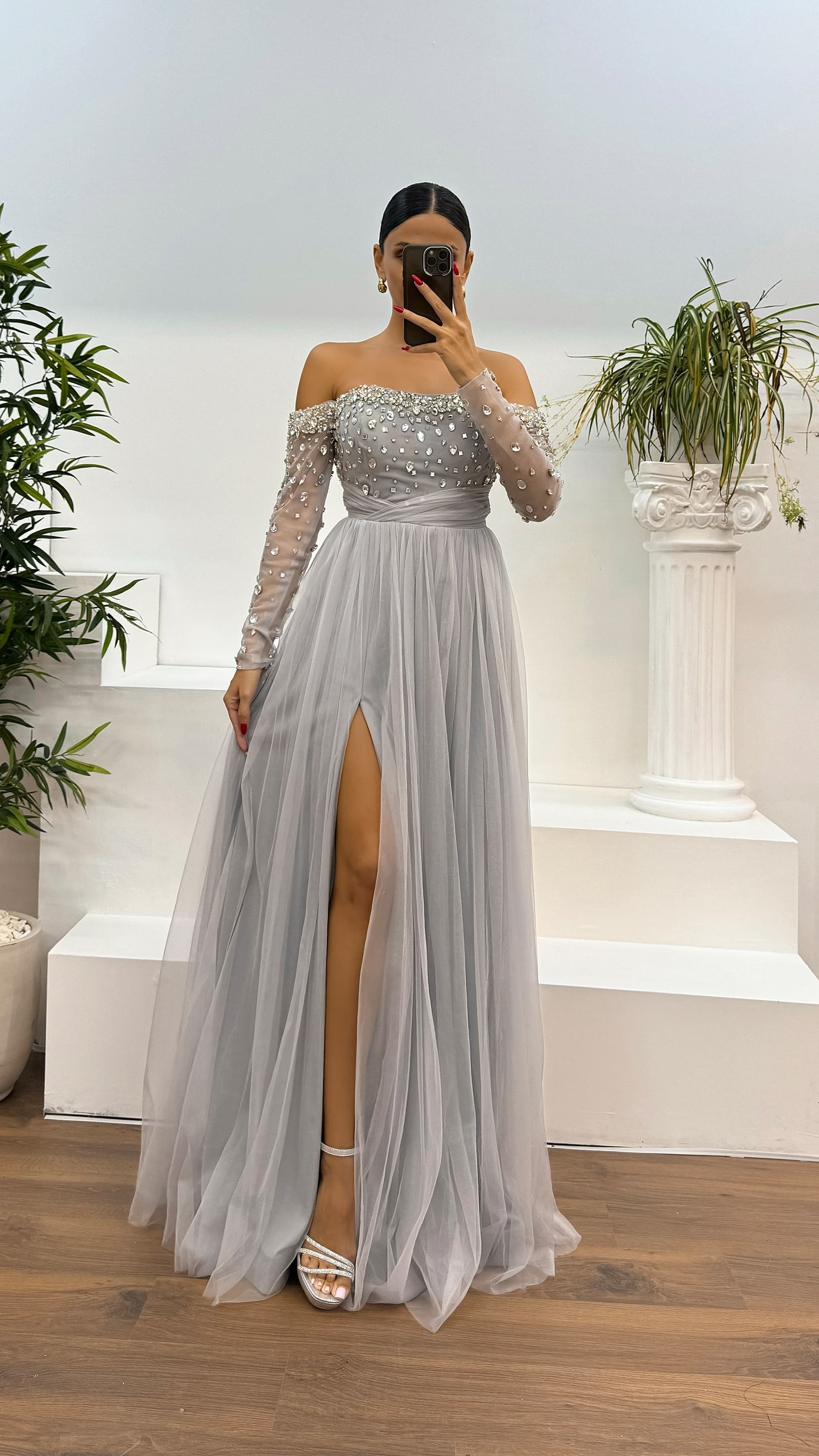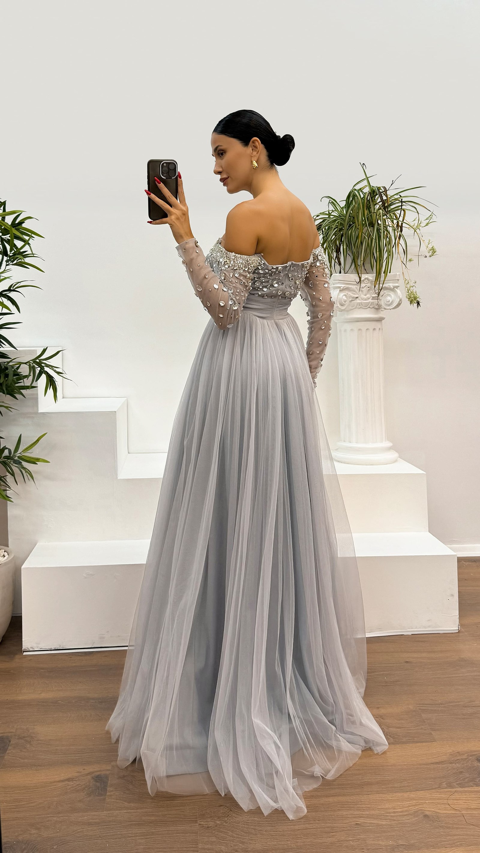 Gri Kayık Yaka İşlemeli Tül Abiye Elbise
