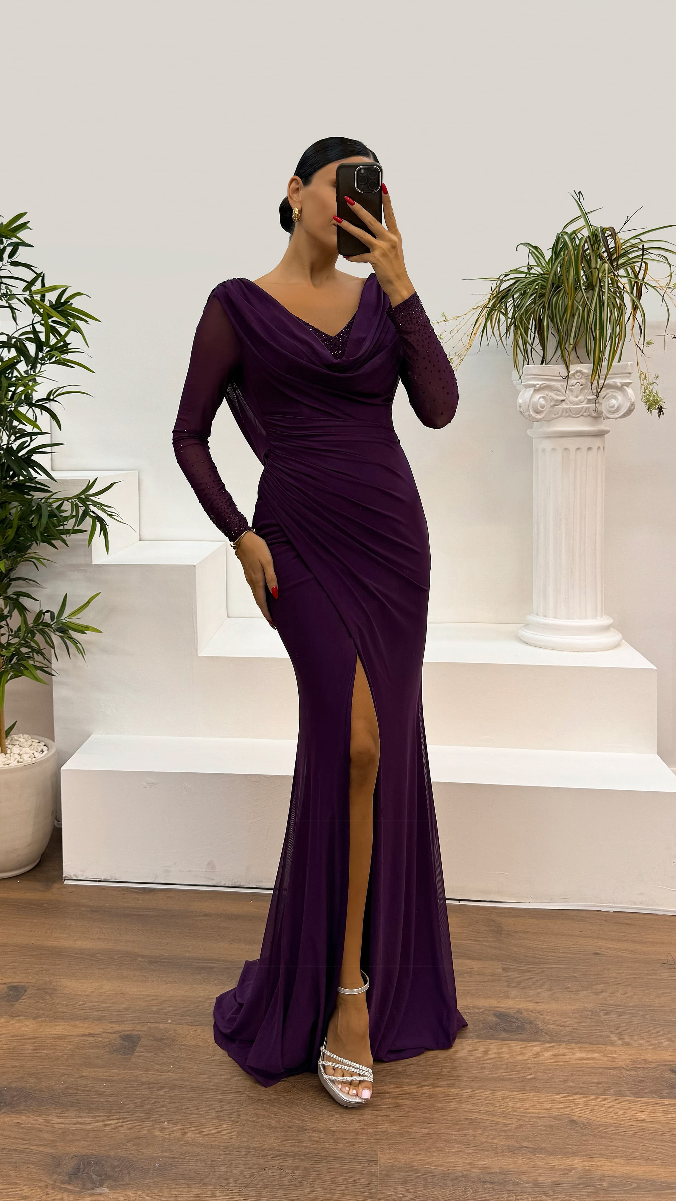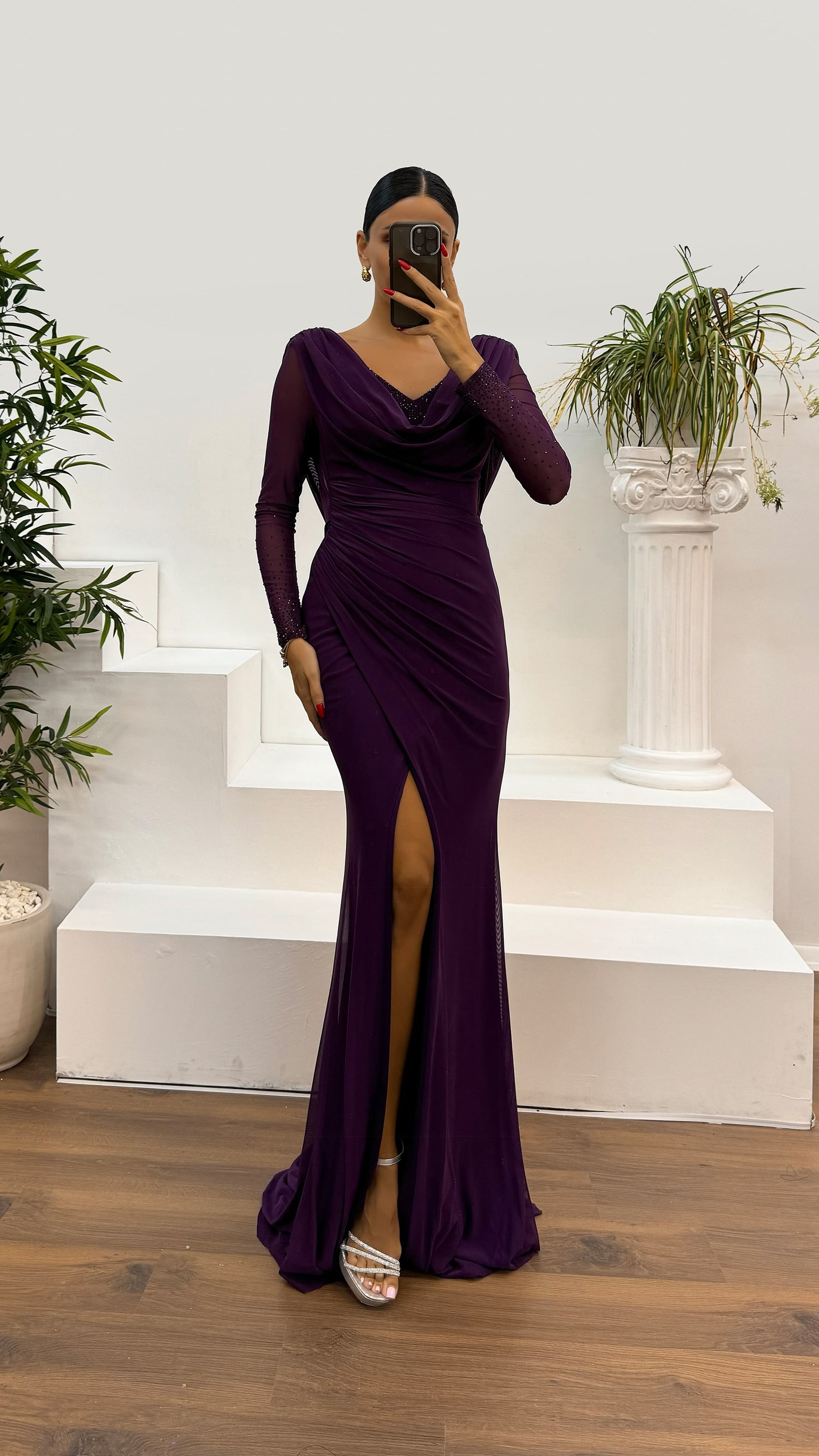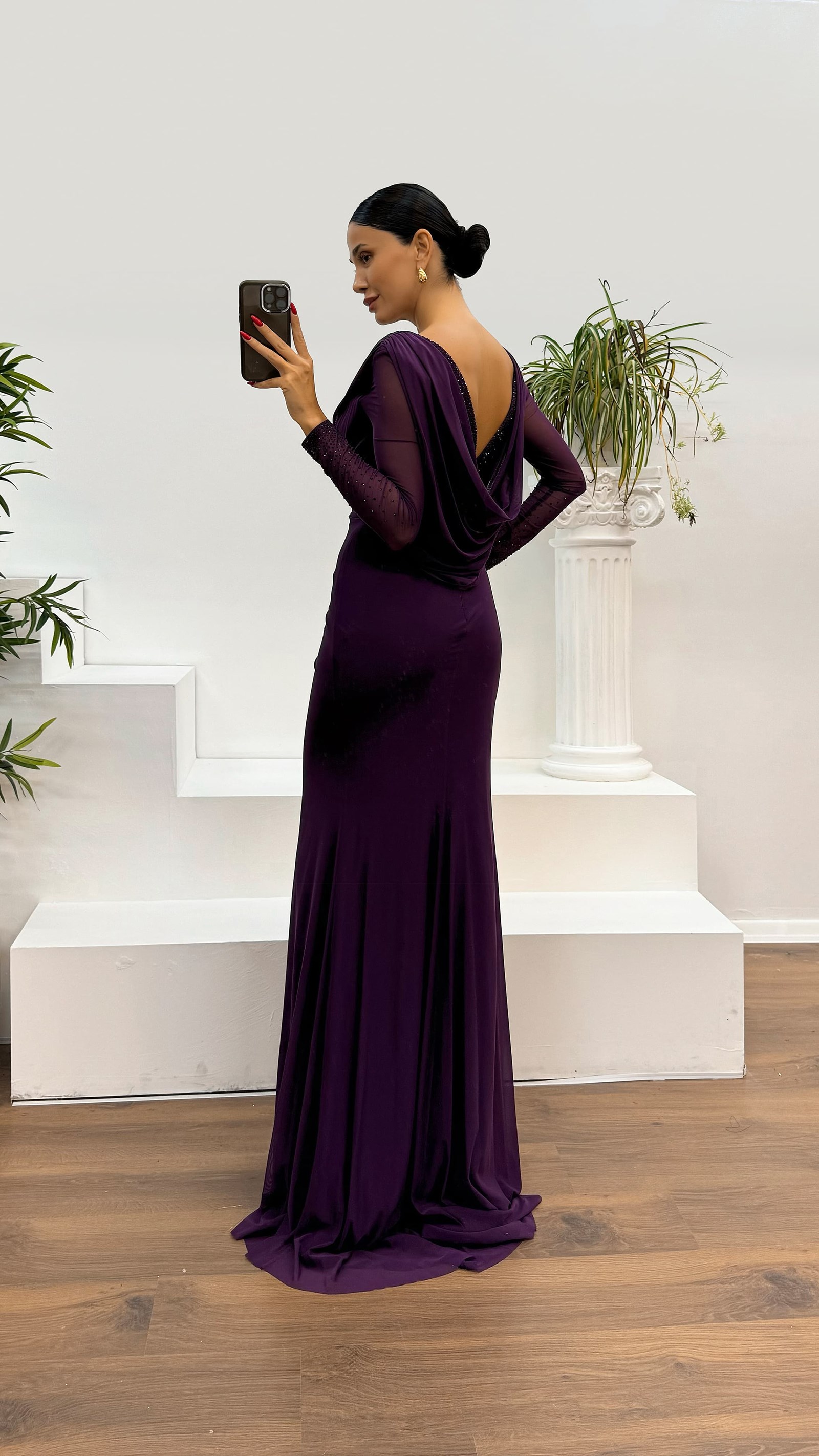 • Koyu Lila Uzun Kol İşlemeli Sırt Detay Abiye Elbise