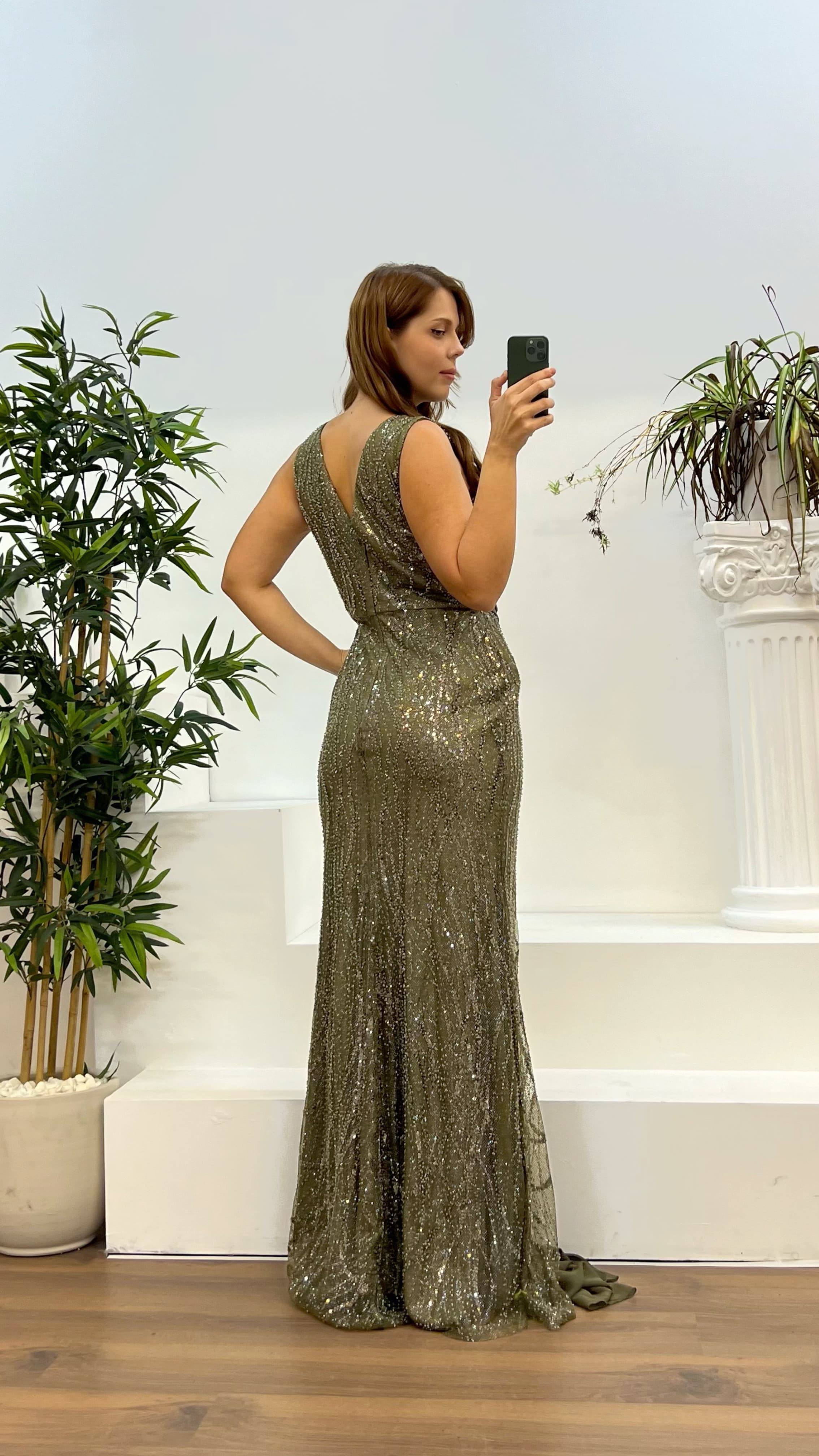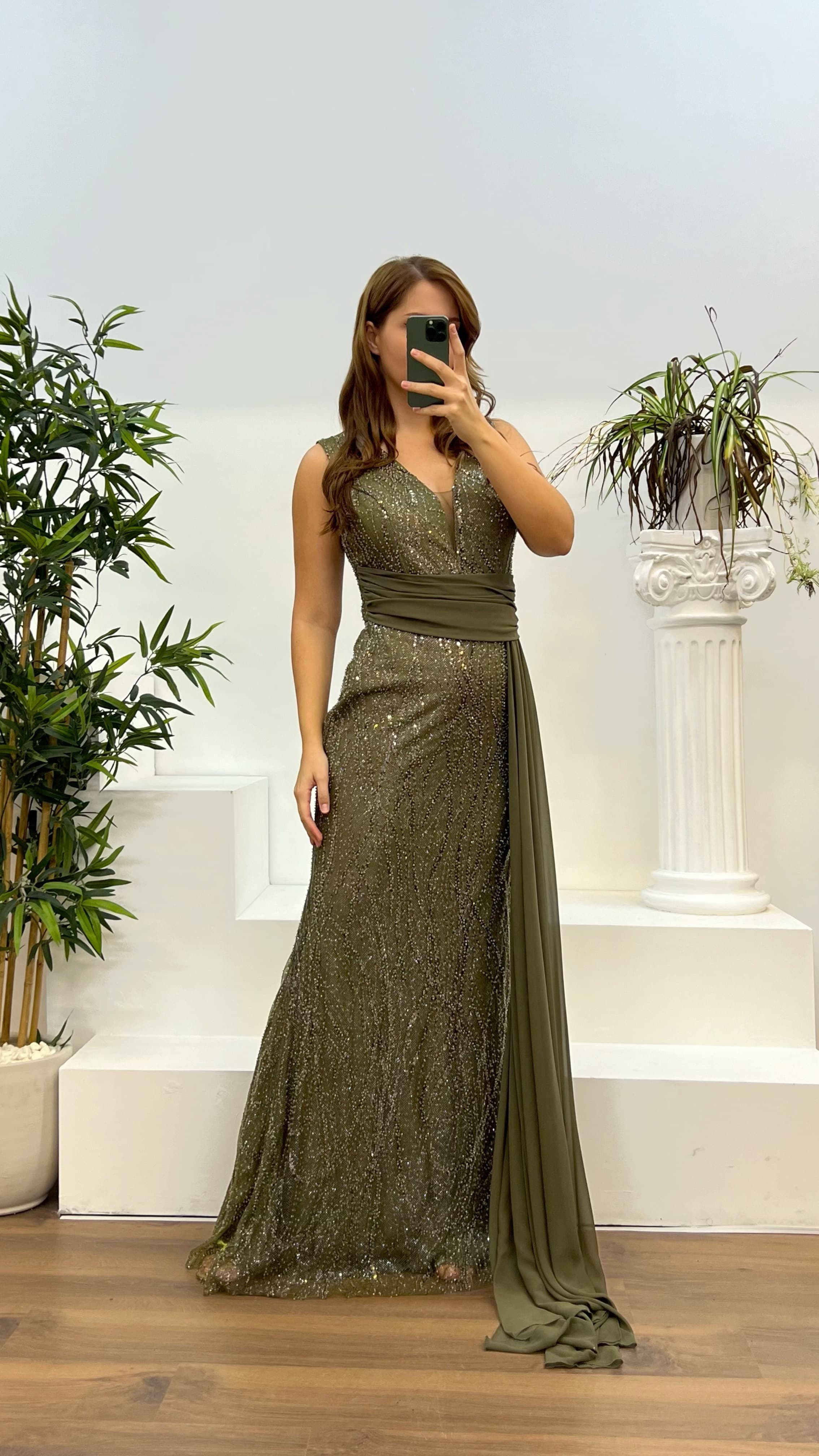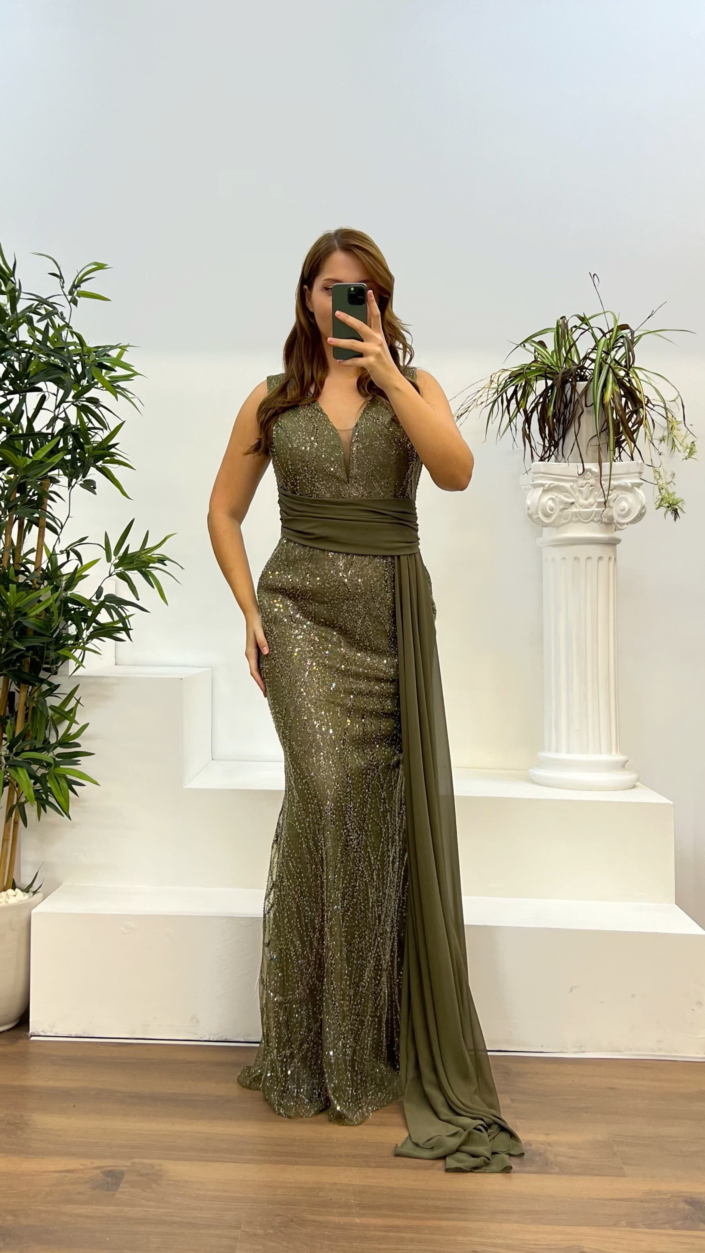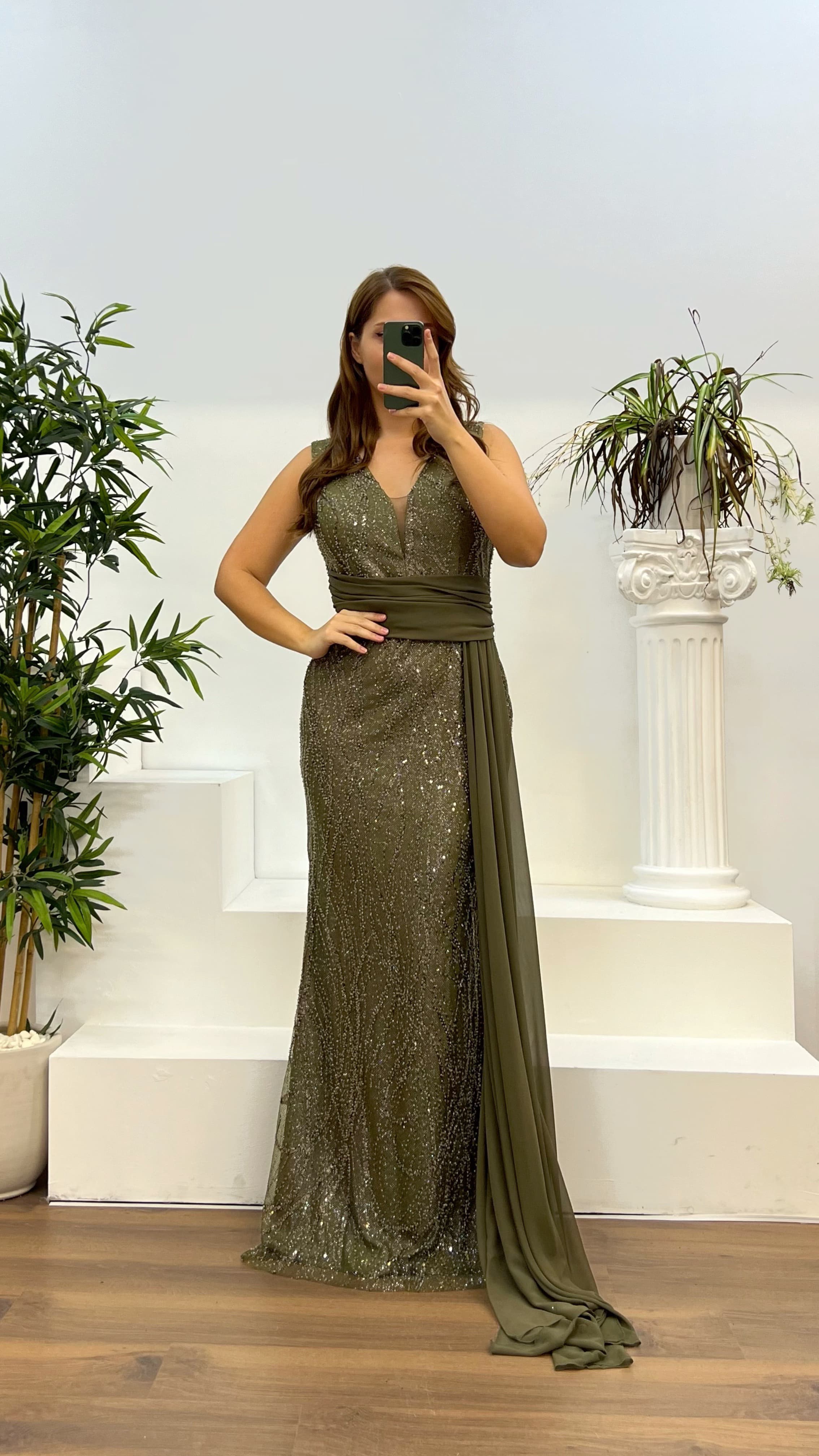 • Haki V Yaka Bel Detay İşlemeli Büyük Beden Abiye Elbise
