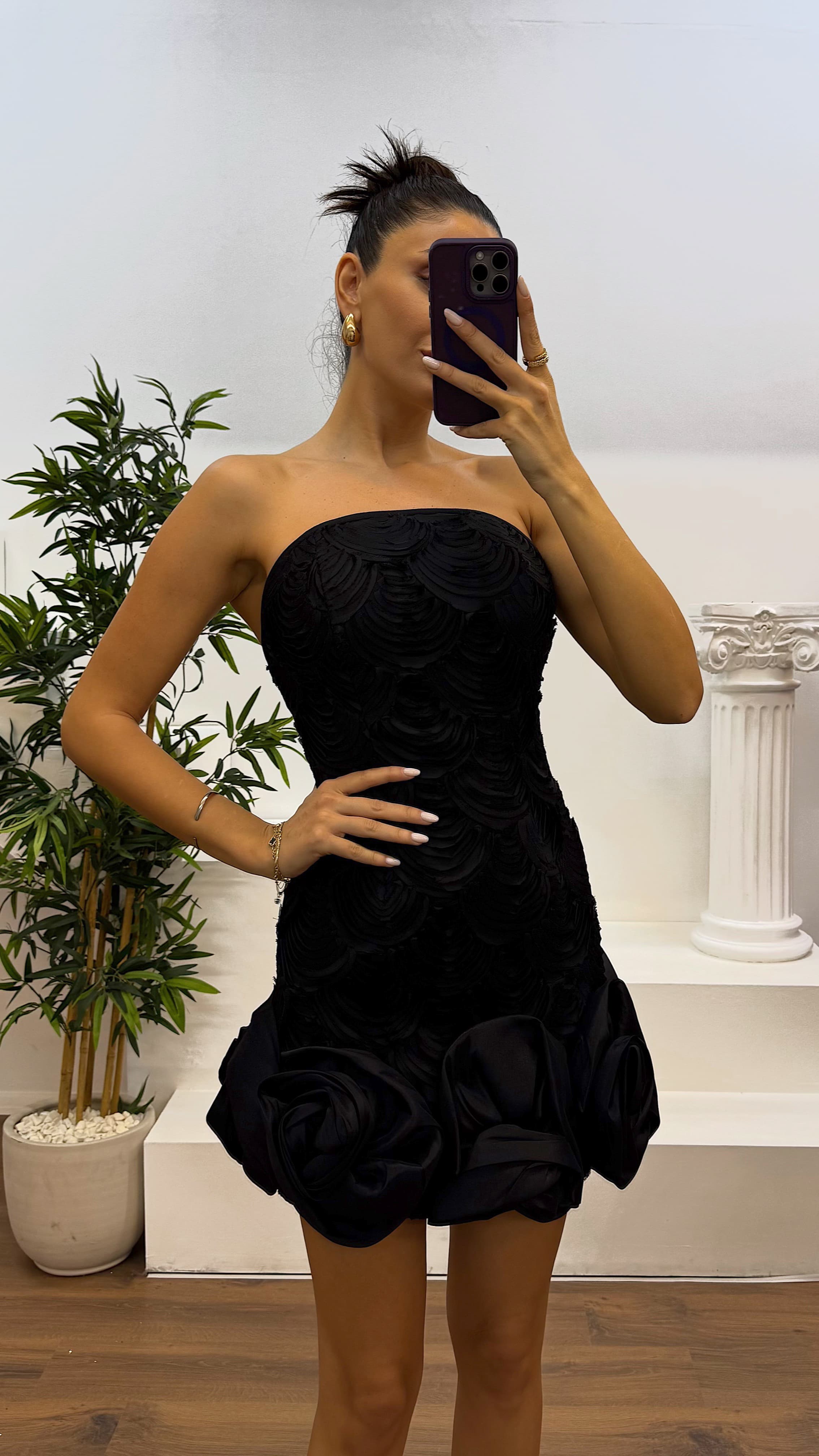• Siyah Straplez Gül Detaylı Kısa Tasarım Abiye Elbise