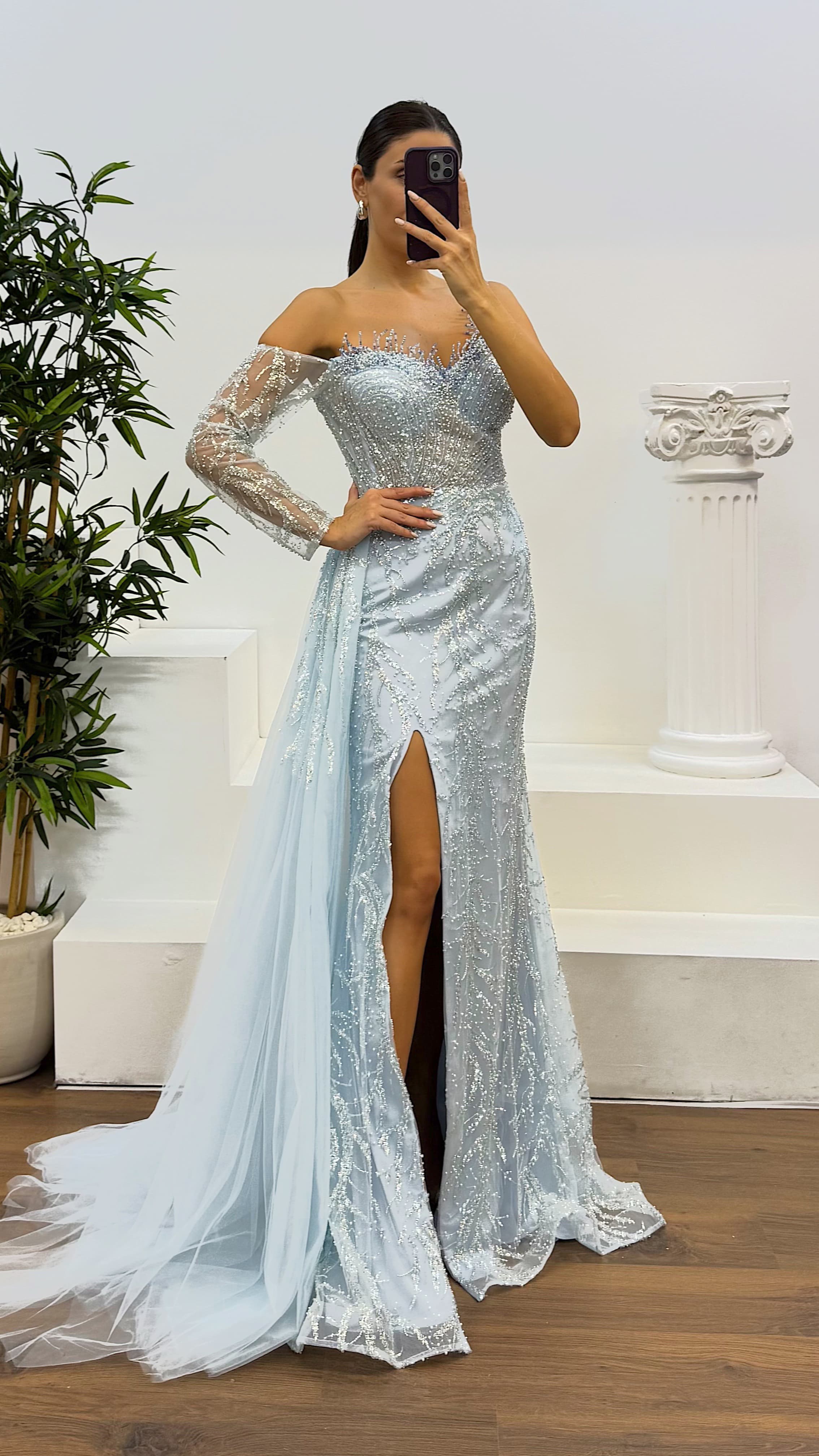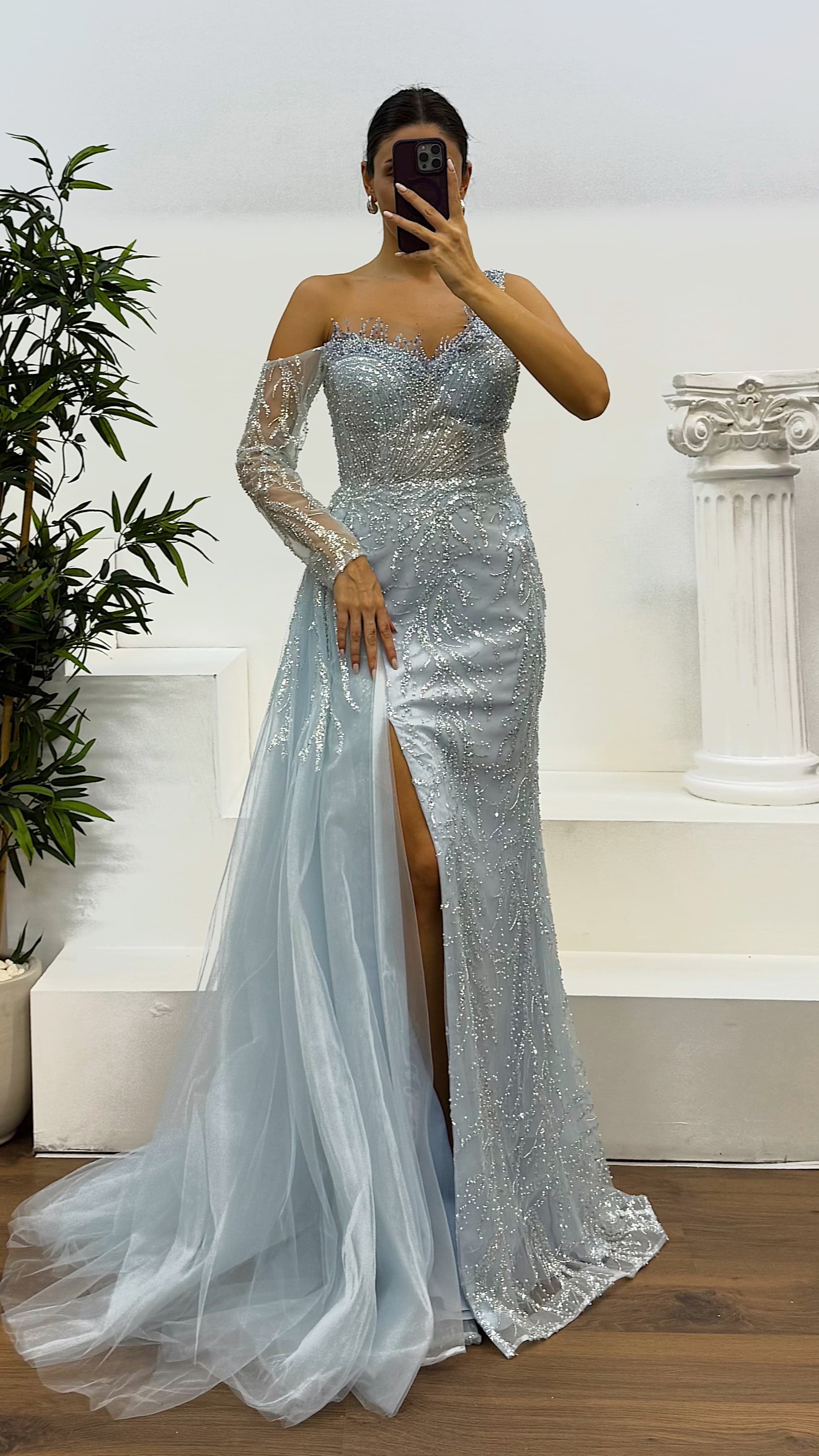 Vestido de noche de diseñador bordado con un hombro El producto está diseñado como un vestido de noche bordado de un solo hombro, adecuado para tallas 36-46, con forro, detalle de cola lateral y abertura. Altura del producto: Puede variar entre 165-170 cm. Tipo de tela: tul 3% lycra 97% poliéster