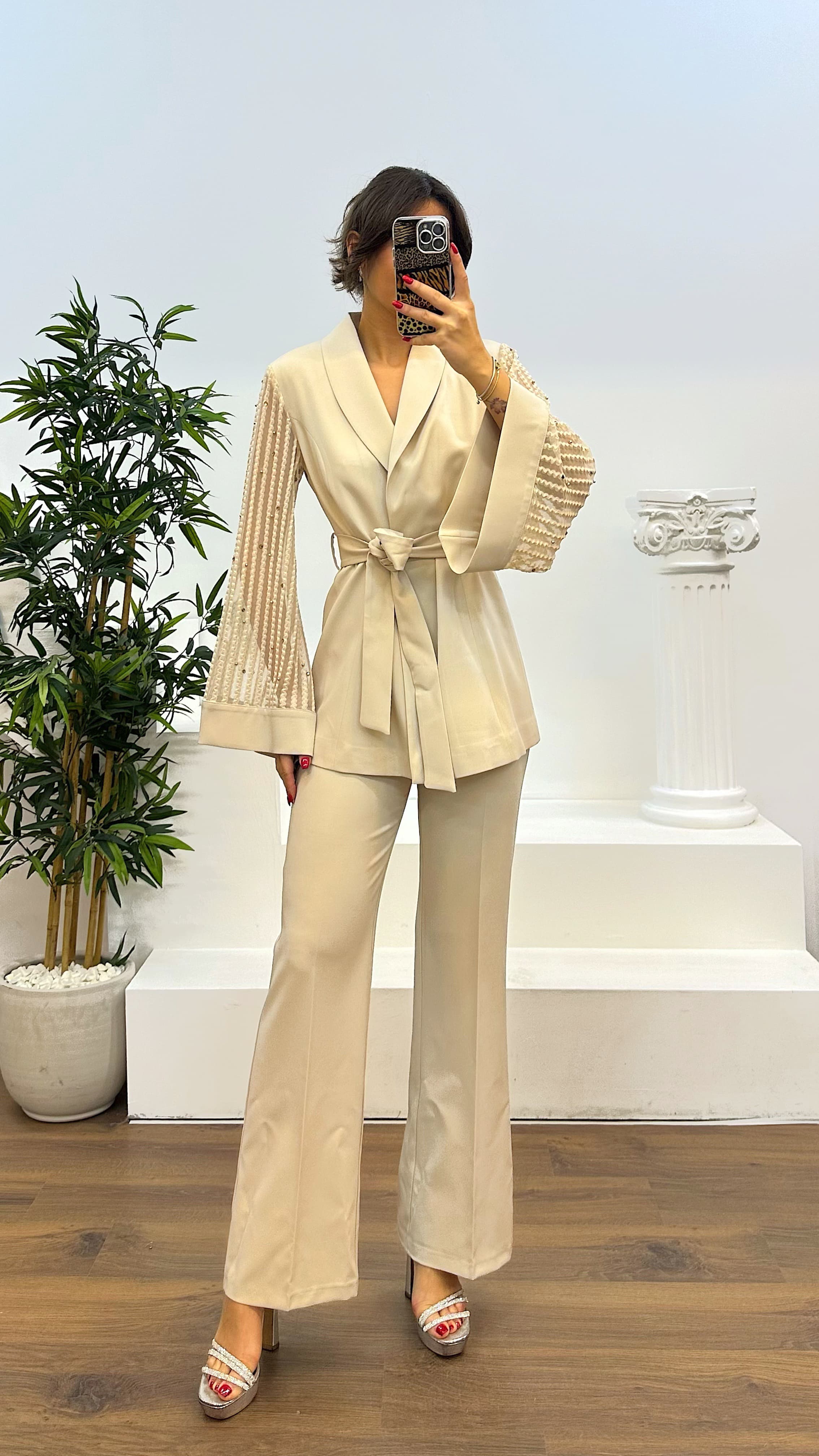 El vestido con detalles en las mangas está diseñado como un conjunto que se adapta a las tallas de la 36 a la 44. Es forrado, tiene cremallera, almohadillas en los hombros y detalles en las mangas. La longitud del vestido es de 100 cm. Tipo de tela: tul 3% lycra, 97% poliéster – tela atlas 100% poliéster. Longitud del brazo del producto: 60 cm.