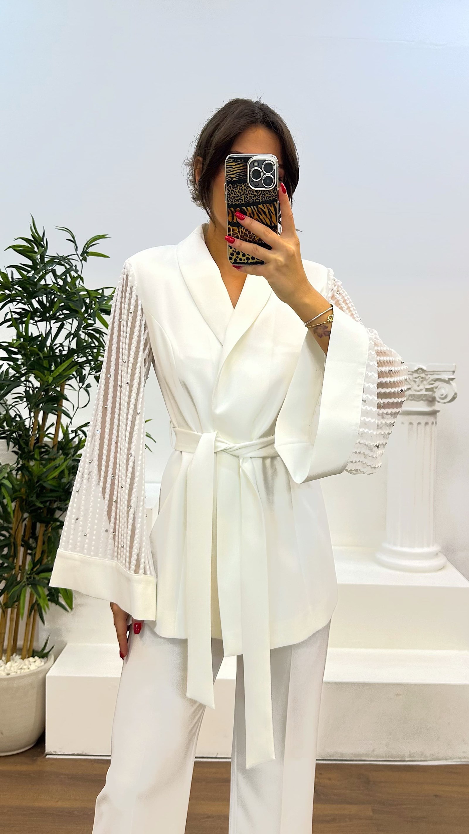 El vestido con detalles en las mangas está diseñado como un conjunto que se adapta a las tallas de la 36 a la 44. Es forrado, tiene cremallera, almohadillas en los hombros y detalles en las mangas. La longitud del vestido es de 100 cm. Tipo de tela: tul 3% lycra, 97% poliéster – tela atlas 100% poliéster. Longitud del brazo del producto: 60 cm.