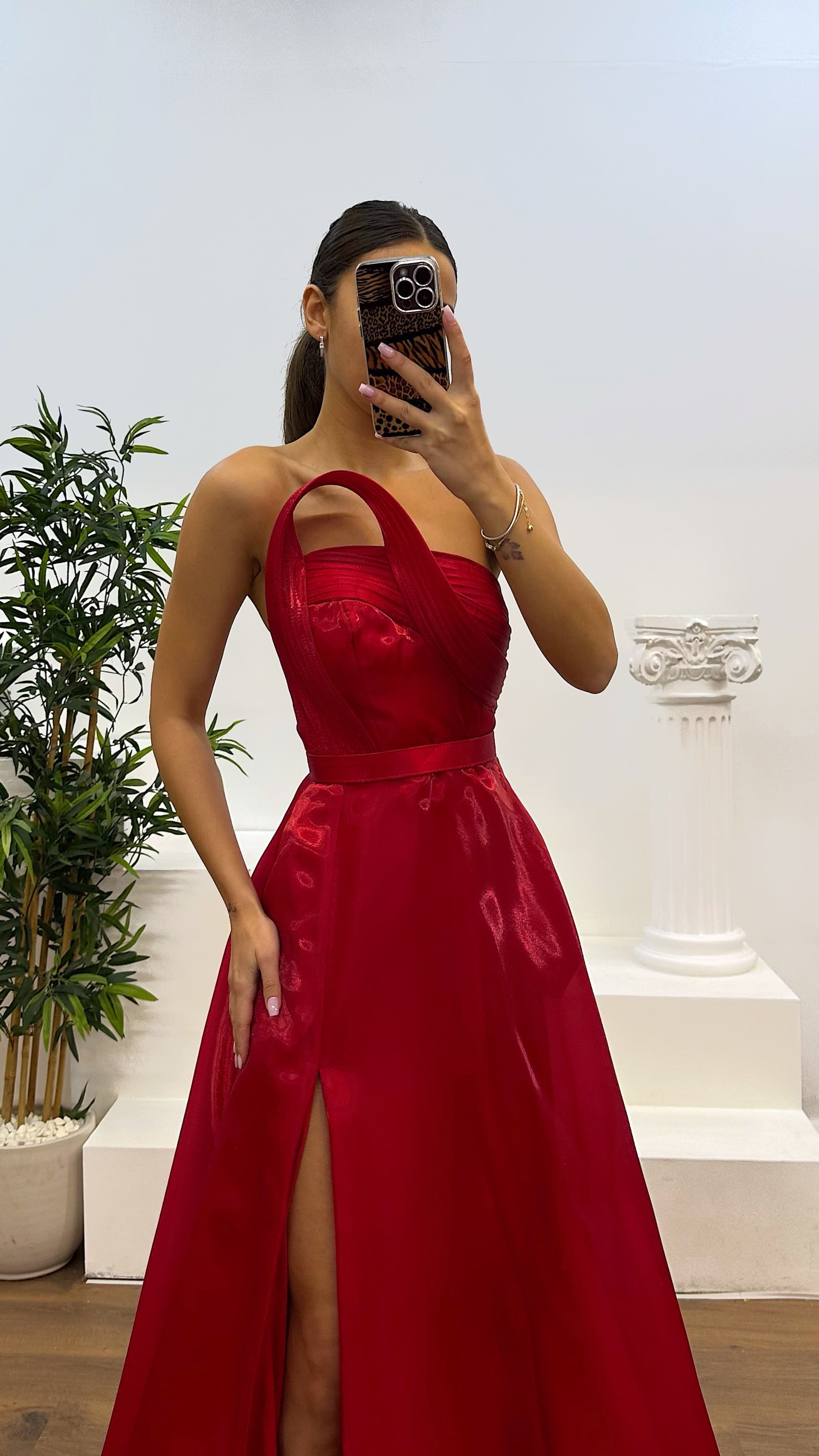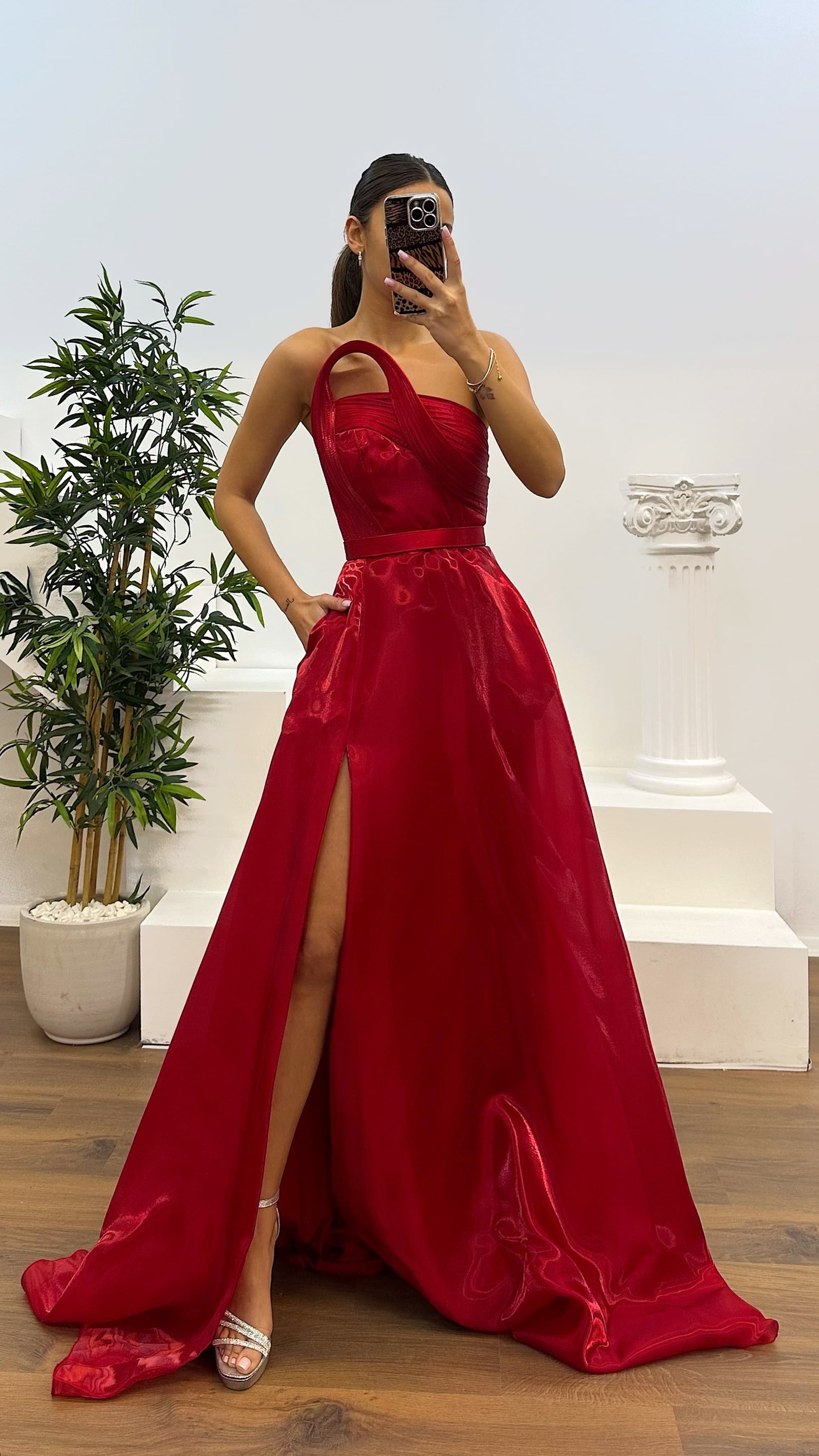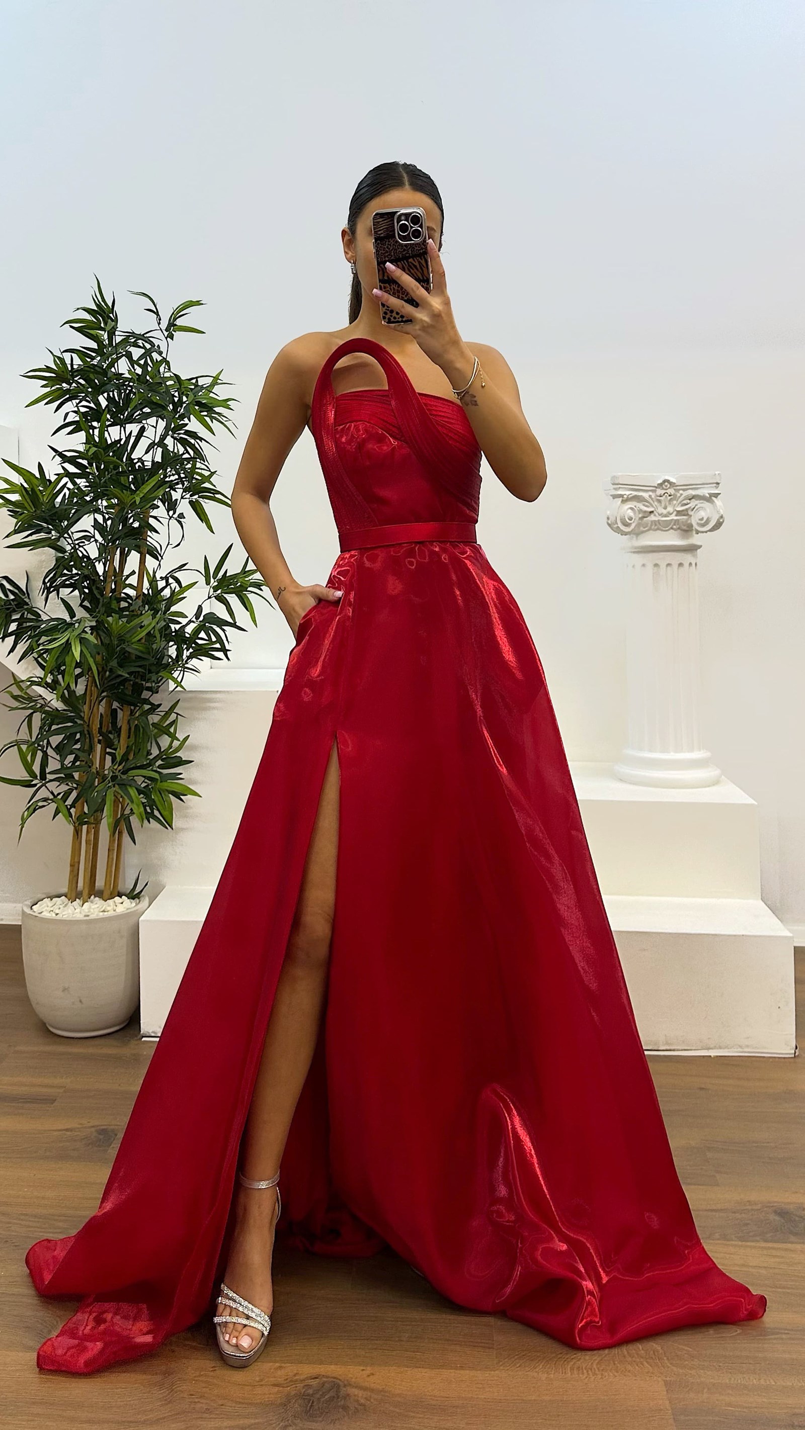 Vestido de noche con detalle de escote strapless El producto es compatible con tallas de la 36 a la 44, tiene relleno en el busto, está forrado, con cierre de cremallera y tirantes cruzados en la espalda, tiene bolsillos, abertura, cinturón desmontable y está diseñado como un vestido de noche con detalle de escote. Longitud del producto: 160 cm. Tipo de tela: Organza satén 100% poliéster.