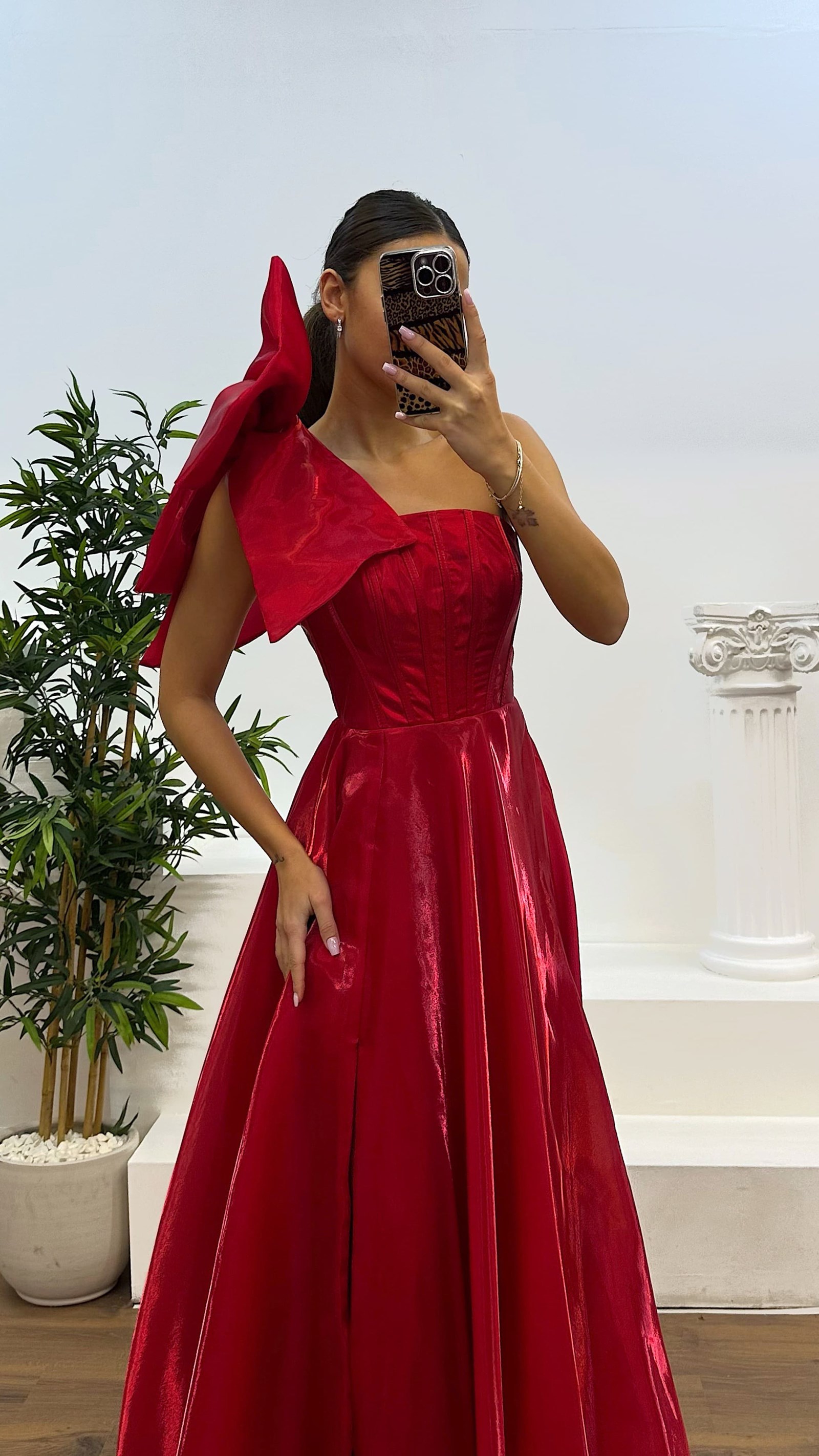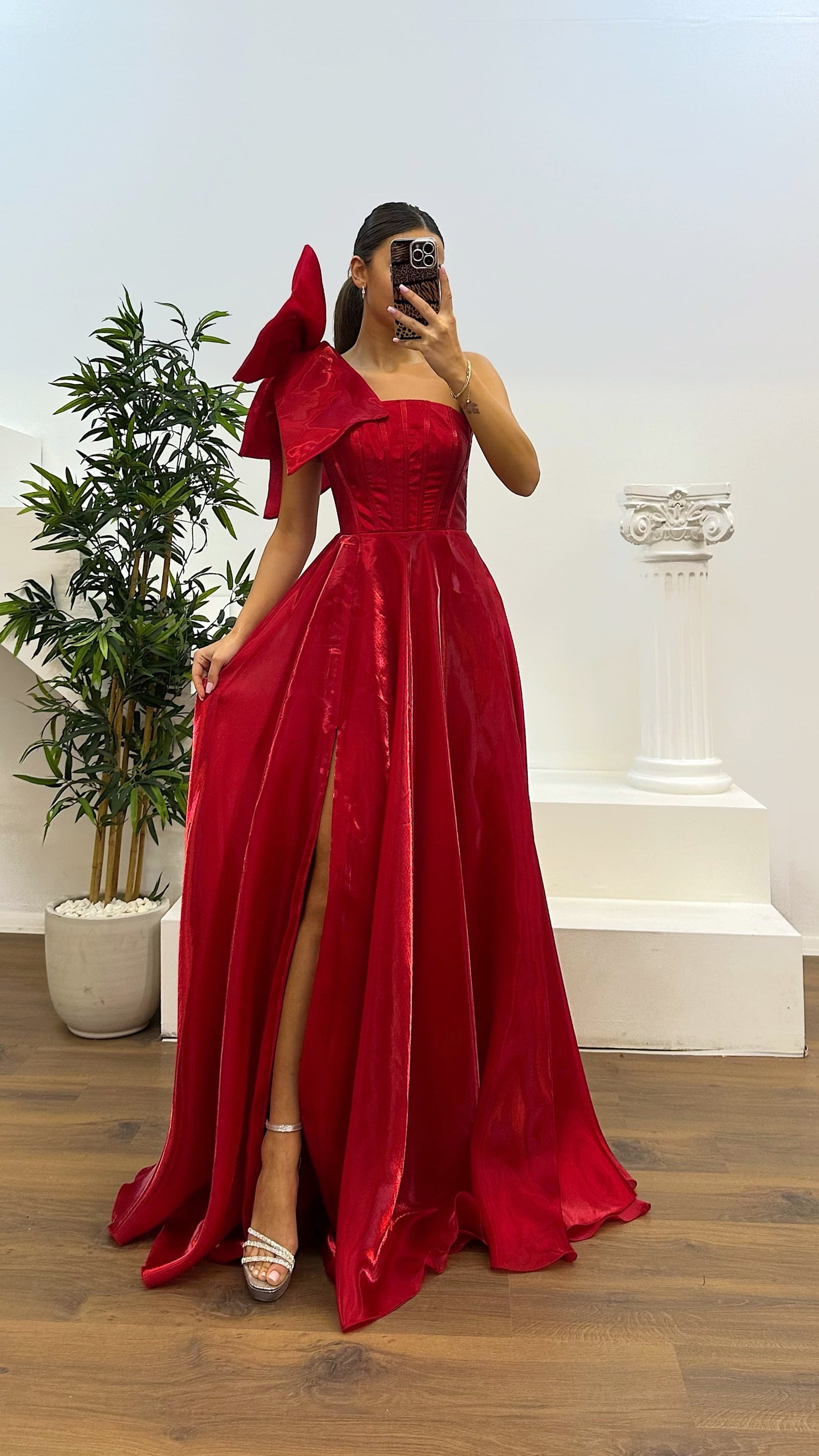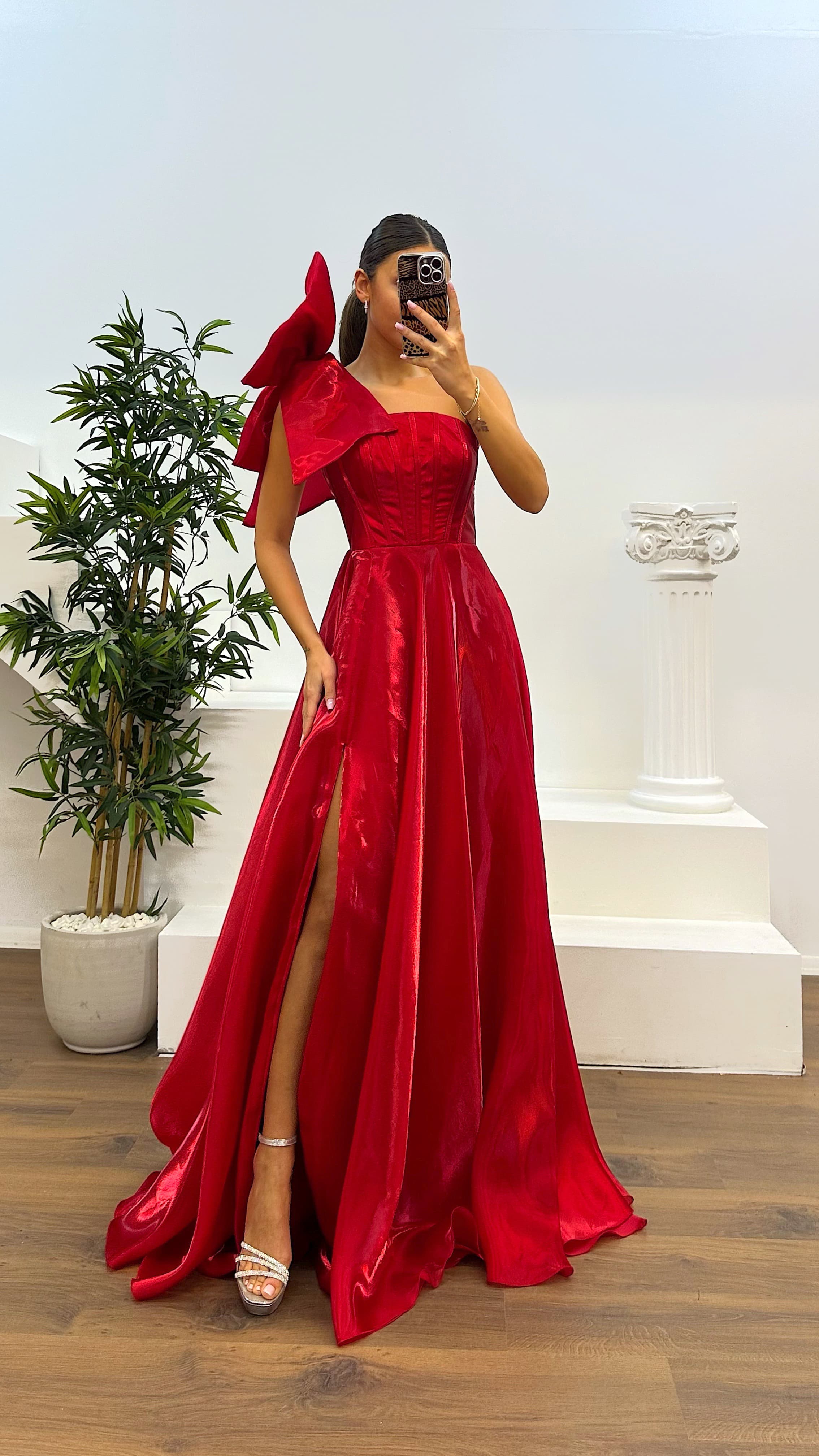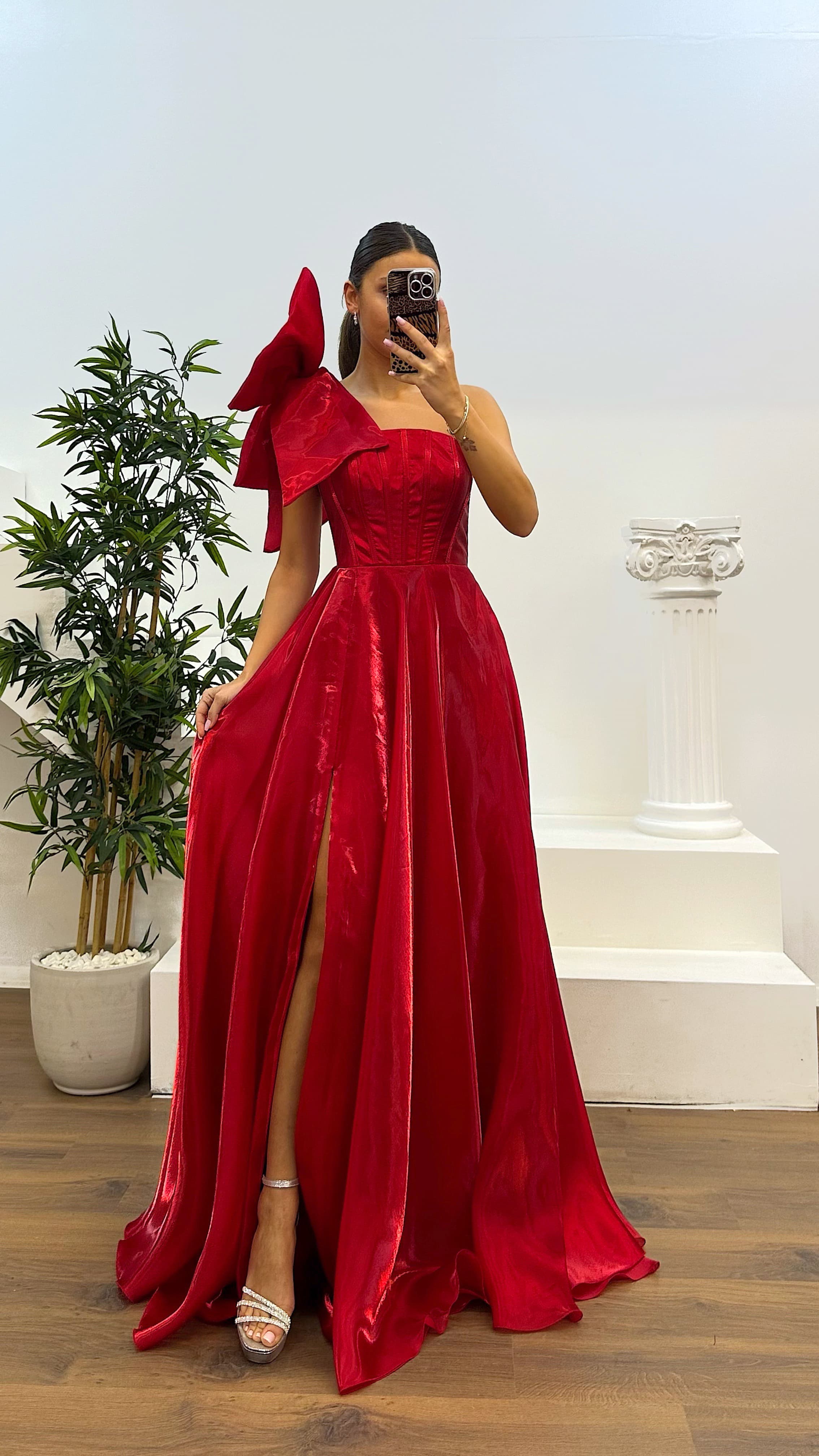 Vestido de noche con detalles en los hombros El producto es compatible con tallas de la 36 a la 44, con almohadillas para el busto, forrado, con cierre cruzado de cordón y cremallera en la parte posterior, diseñado como un vestido de noche con detalles en los hombros y abertura. La longitud del vestido puede variar entre 165 y 170 cm. Tipo de tela: Satén organza, 100% poliéster.