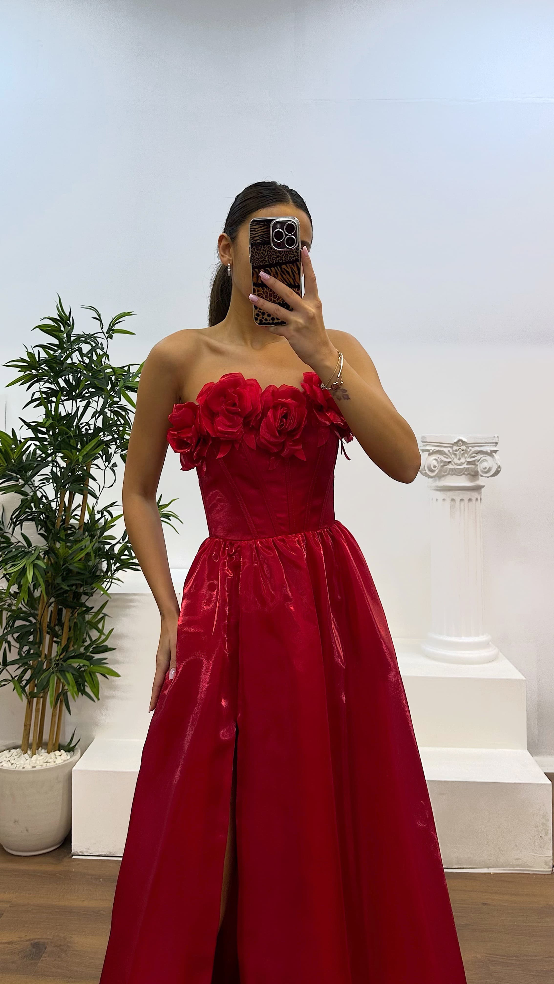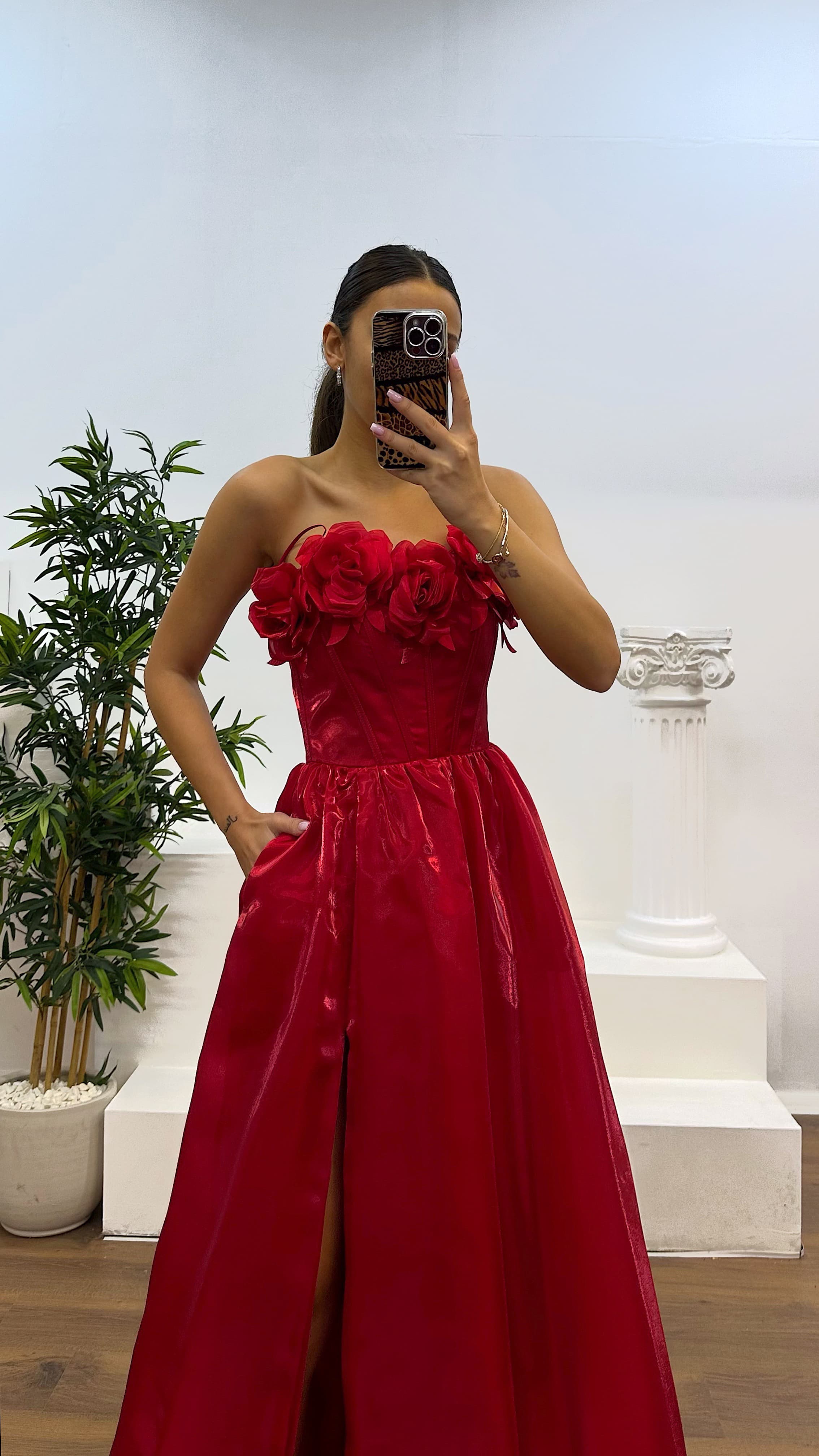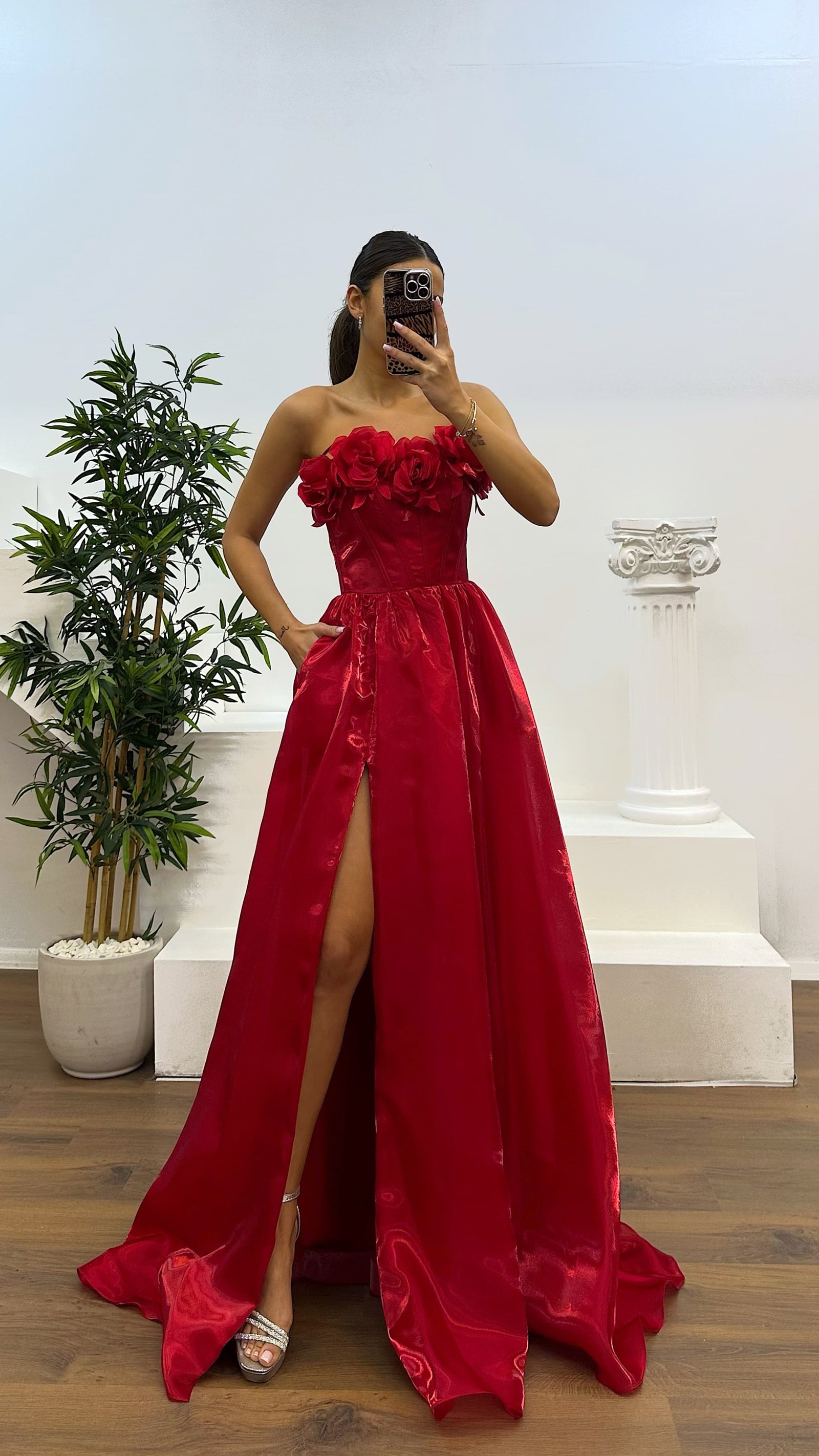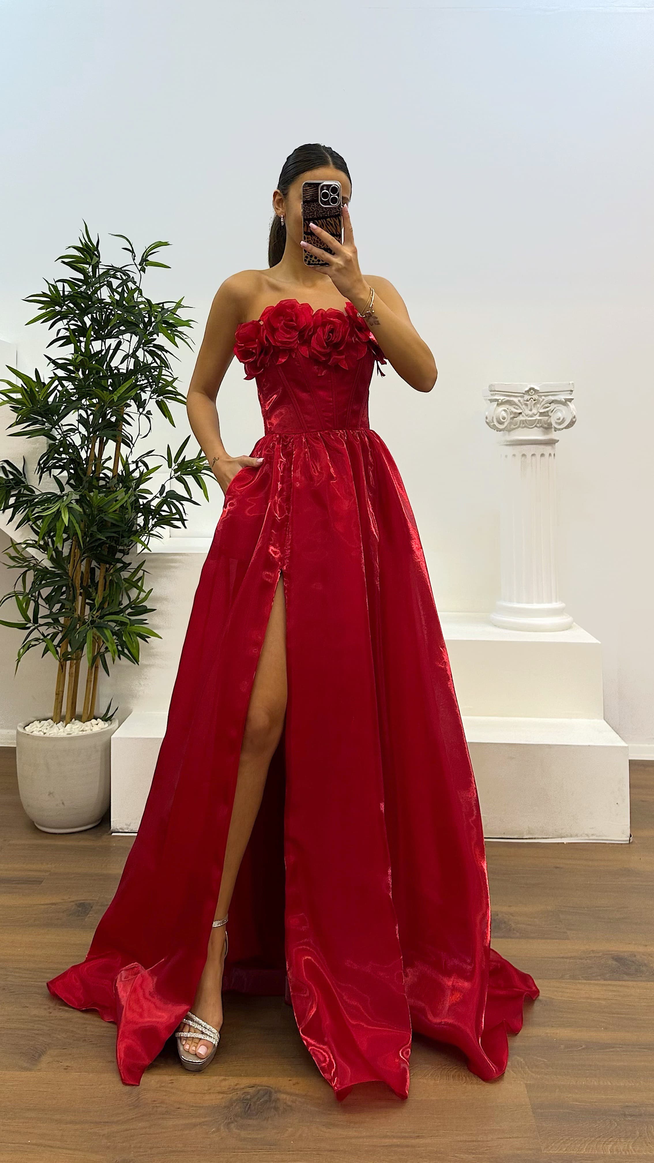 Vestido de noche strapless con detalles florales El producto es compatible con tallas de la 36 a la 44, con almohadilla en el busto, forrado, con cierre cruzado en la parte posterior y cremallera, con abertura y bolsillos, diseñado como un vestido de noche. Longitud del producto: 160 cm. Tipo de tela: Organza satén 100% poliéster.