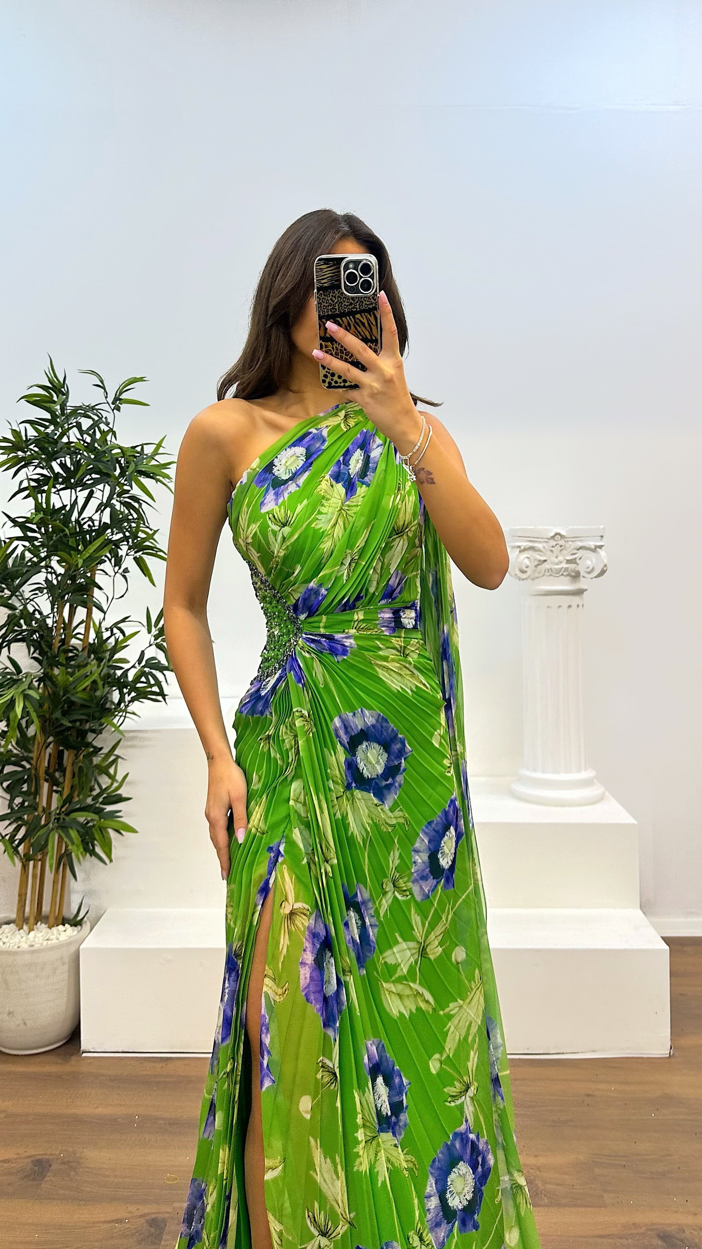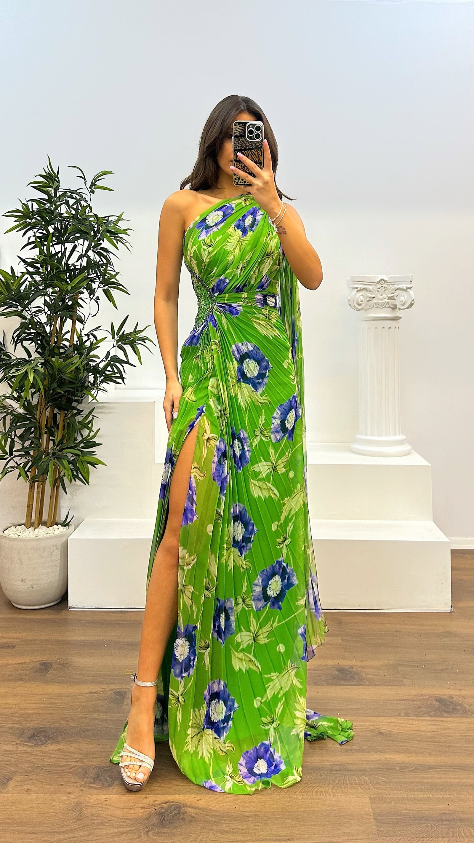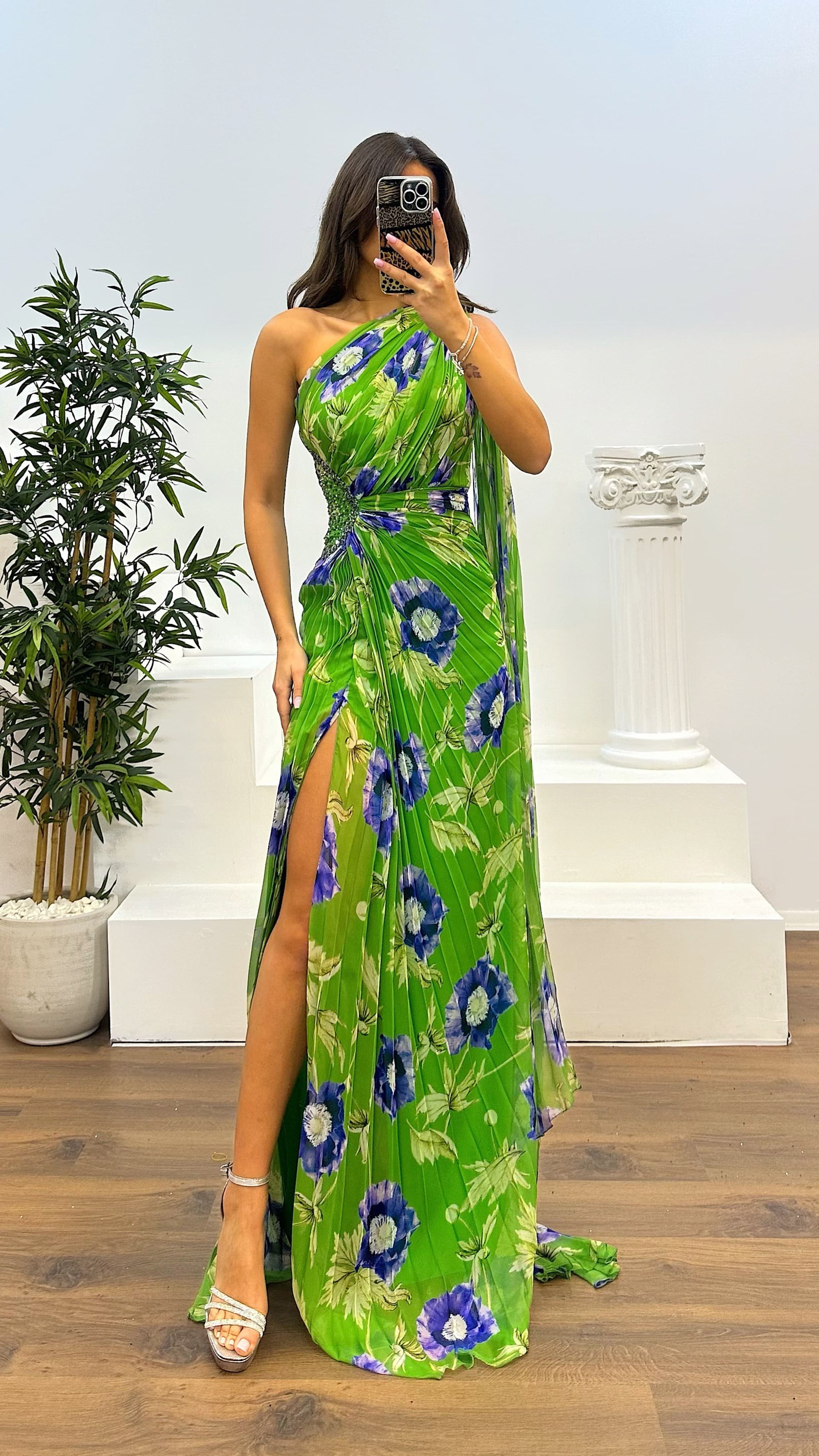 Vestido de fiesta plisado de un solo hombro Este producto es compatible con tallas de la 36 a la 44, con almohadillas para el pecho, forrado, con cierre en la parte trasera, abertura y detalles en la cintura. La longitud del producto puede variar entre 165-170 cm. Tipo de tela: chifón 66%, viscosa 34%, poliéster.