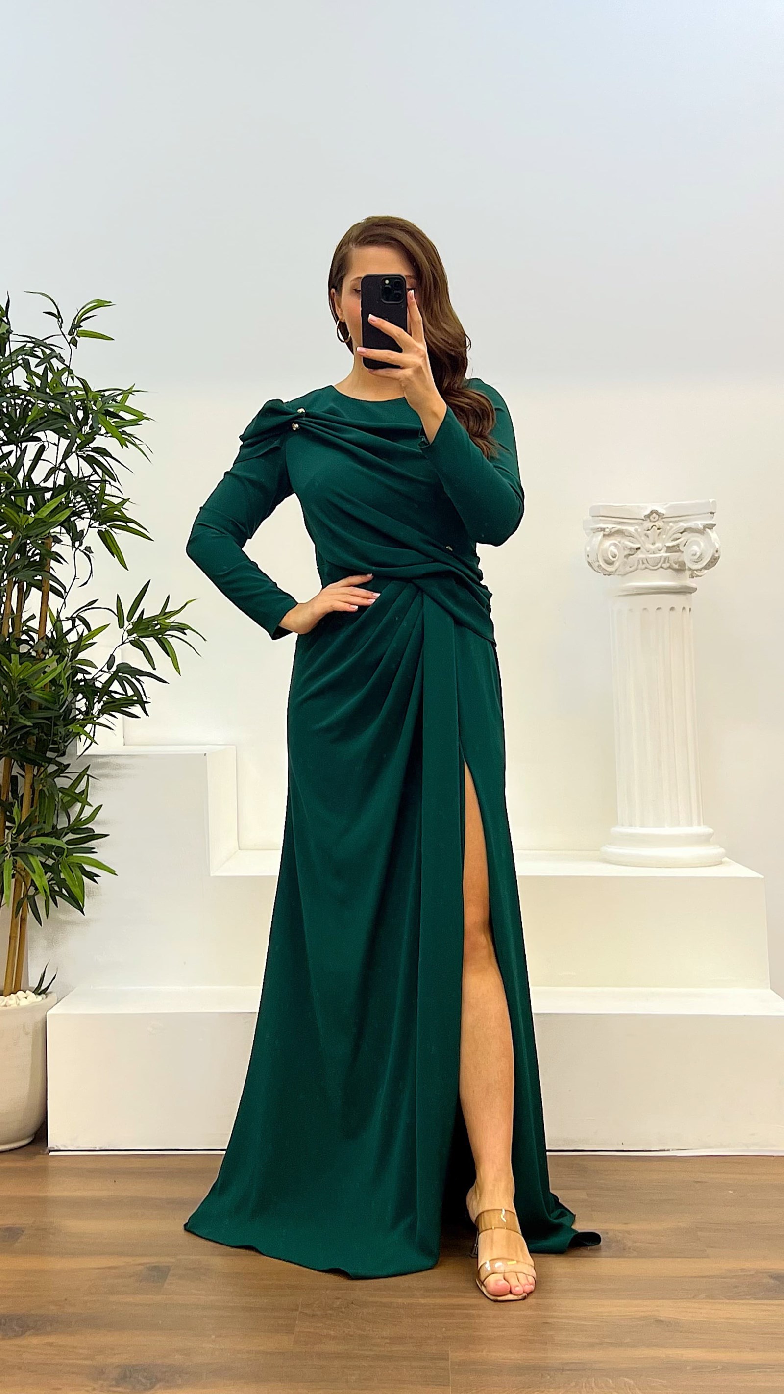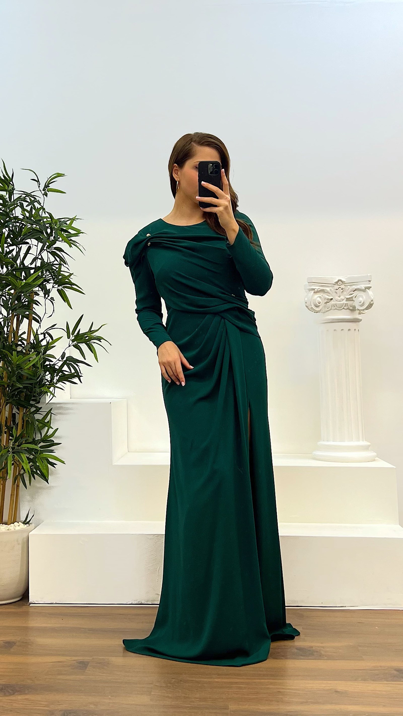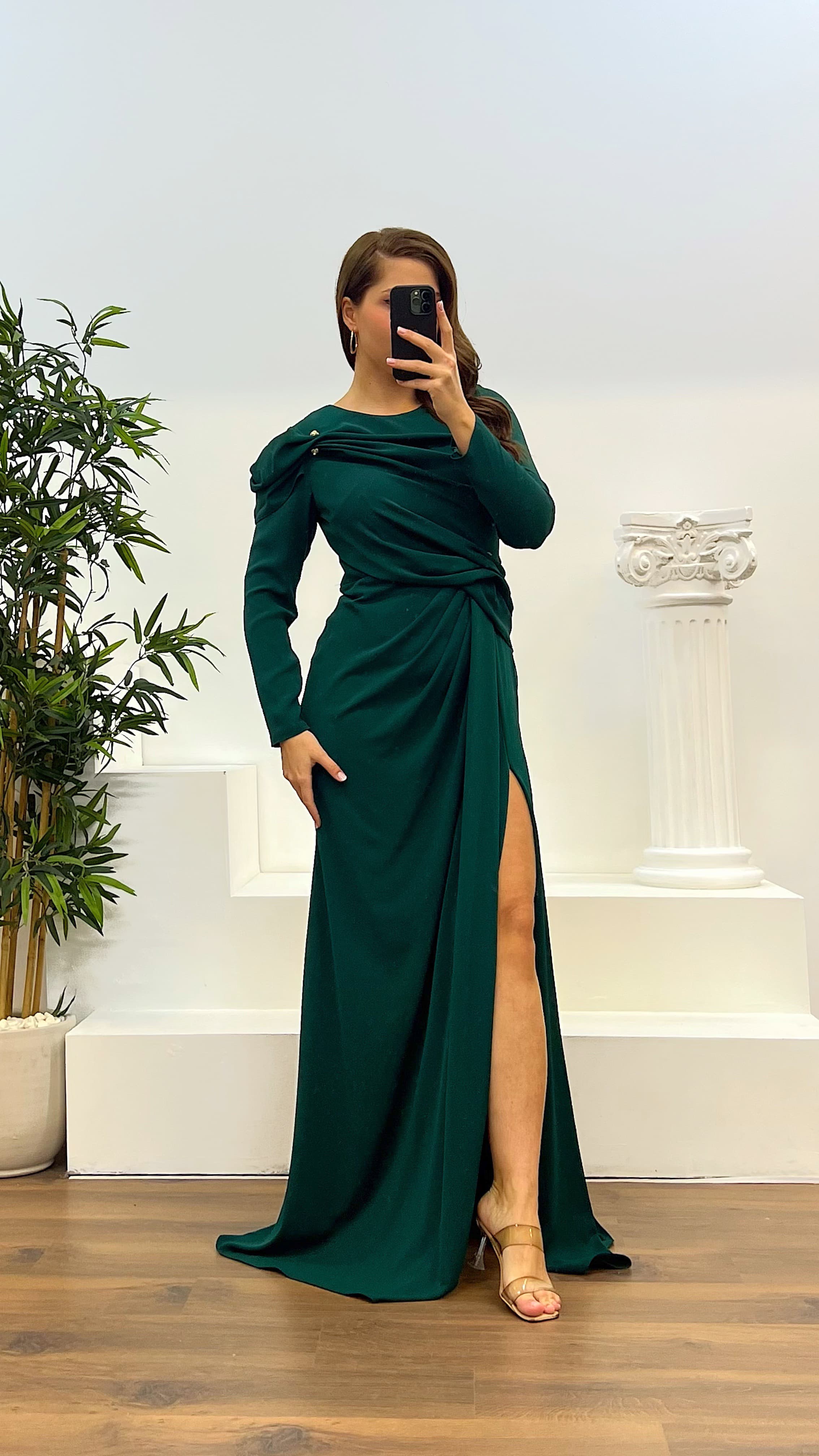 Vestido de noche con escote redondo y drapeado El producto es adecuado para tallas 44-48, con almohadillas para el pecho, forrado, con cierre en la parte posterior y un diseño con abertura. La longitud del producto: puede variar entre 165-170 cm. La longitud de las mangas del producto: 65 cm. Tipo de tela: 100% poliéster."