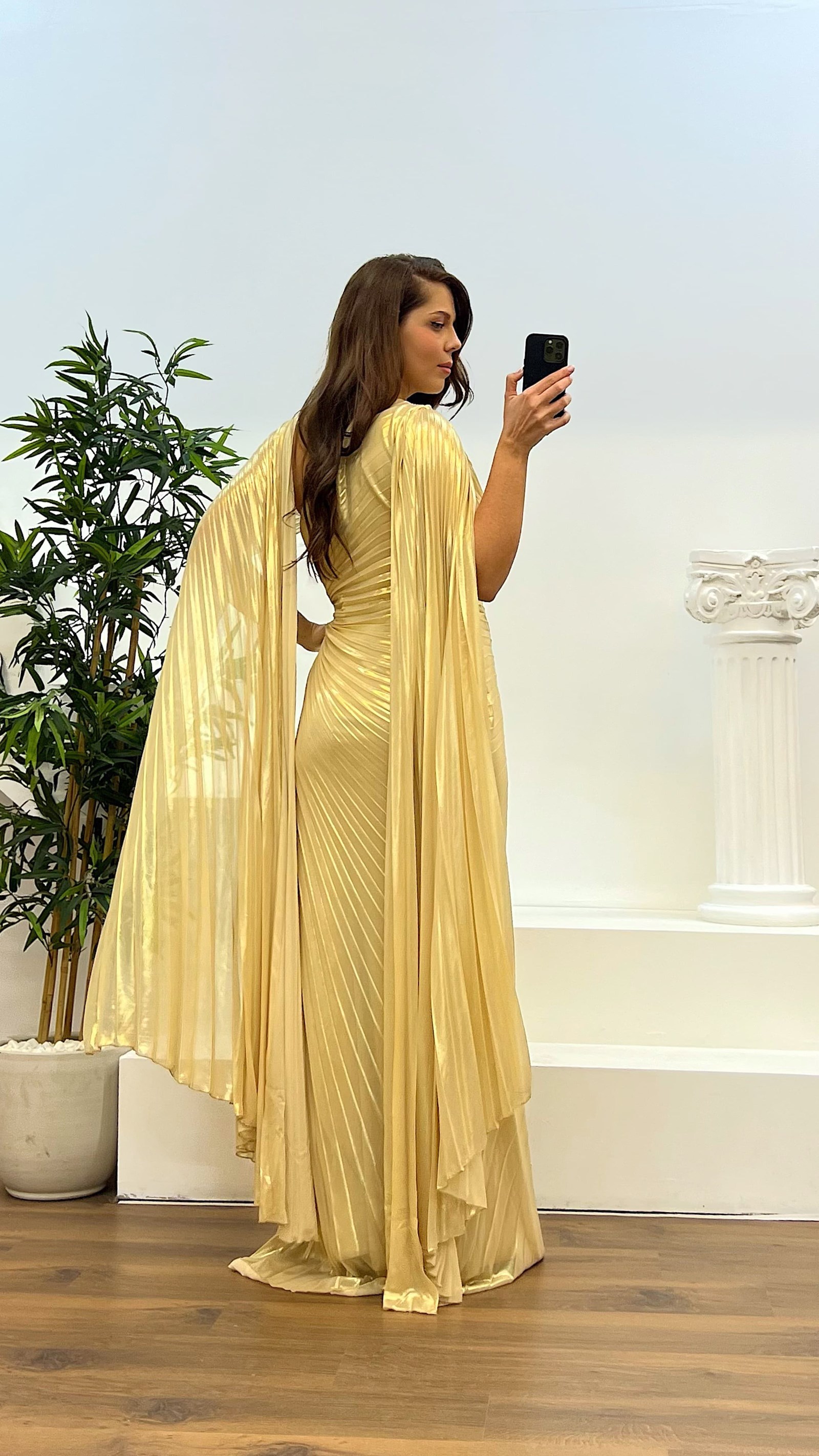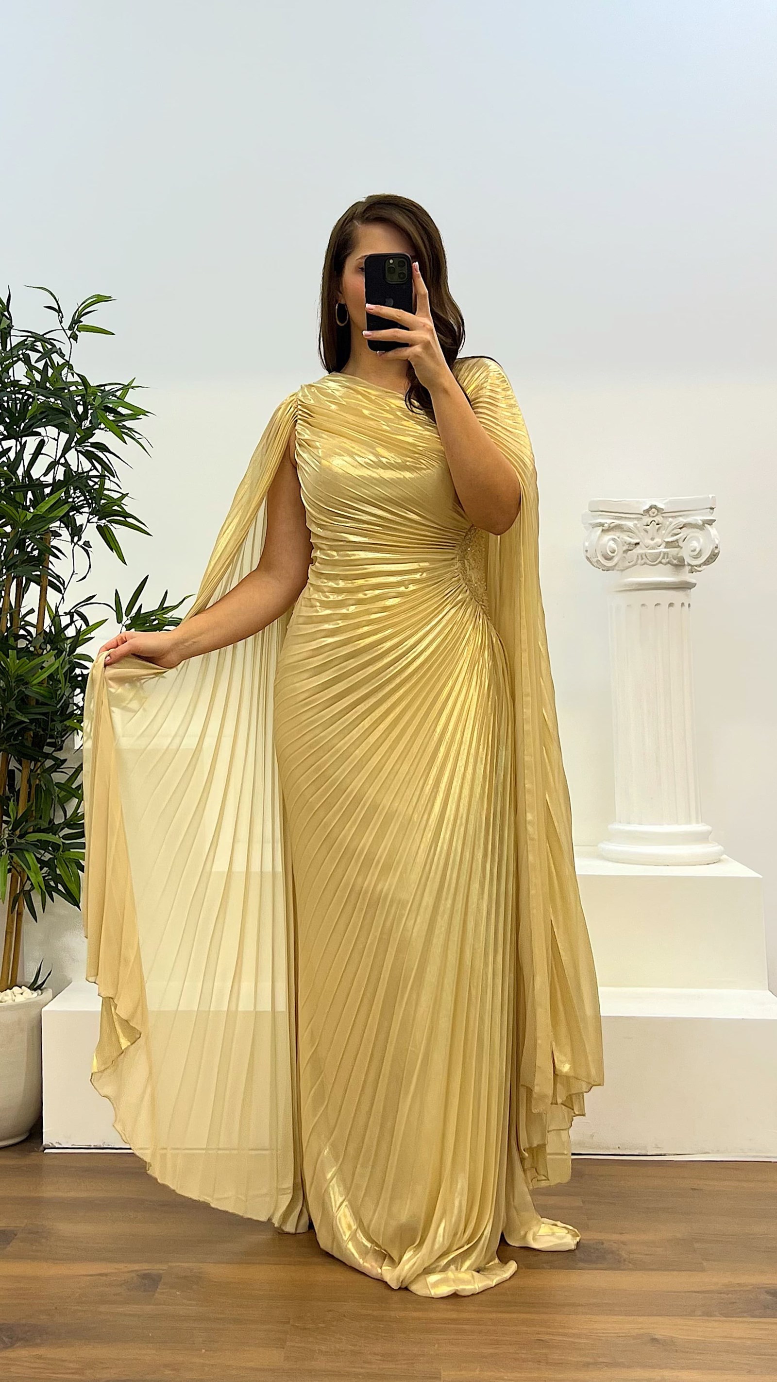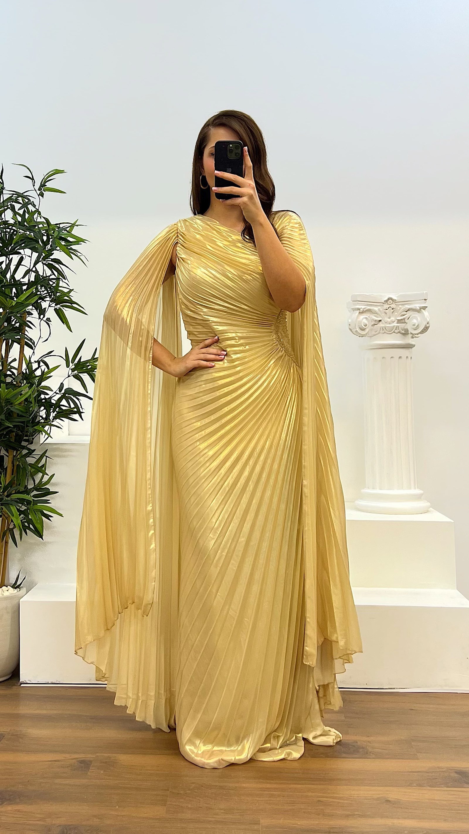 • Gold Piliseli Bel Detay Büyük Beden Abiye Elbise