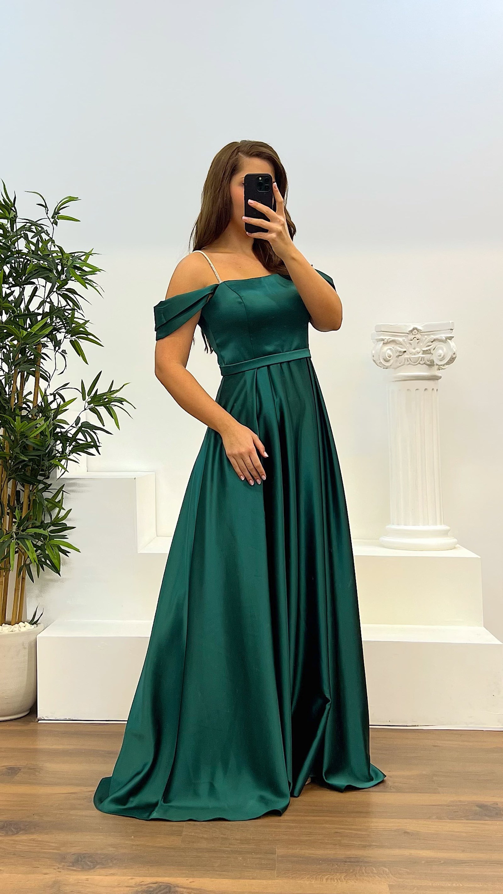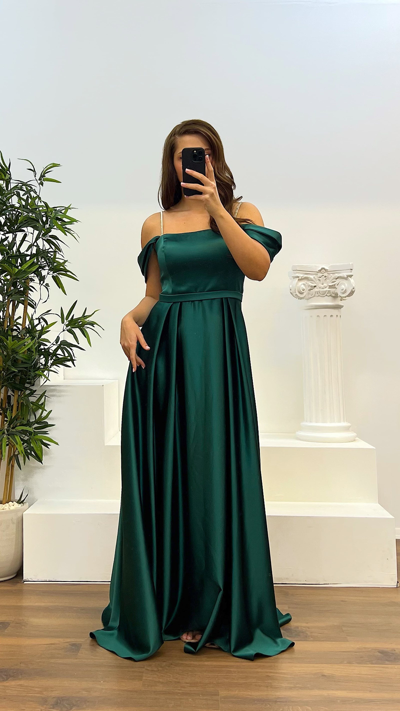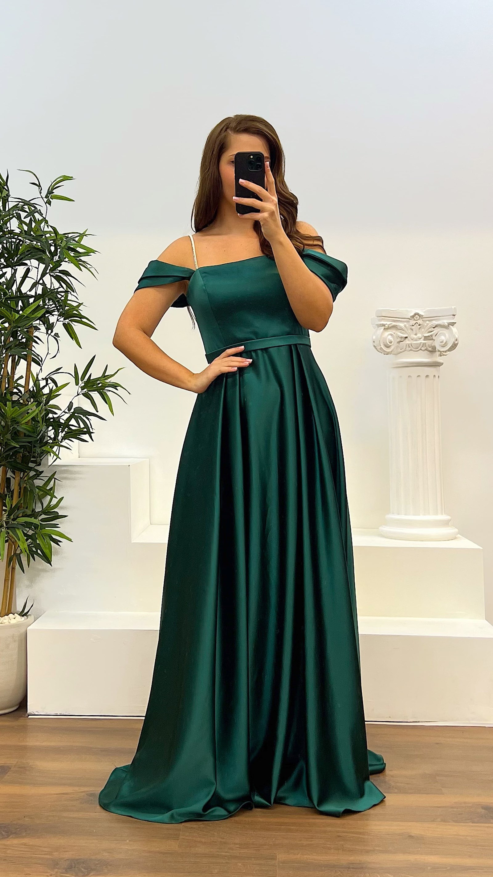 Vestido de noche con tirantes finos y escote barco El producto es adecuado para tallas de la 44 a la 48, con almohadillas para el busto, forrado, con cierre de cremallera en la parte posterior y diseñado como un vestido de noche con tirantes finos. La longitud del producto puede variar entre 165-170 cm. Tipo de tela: satén viscosa-poliéster.