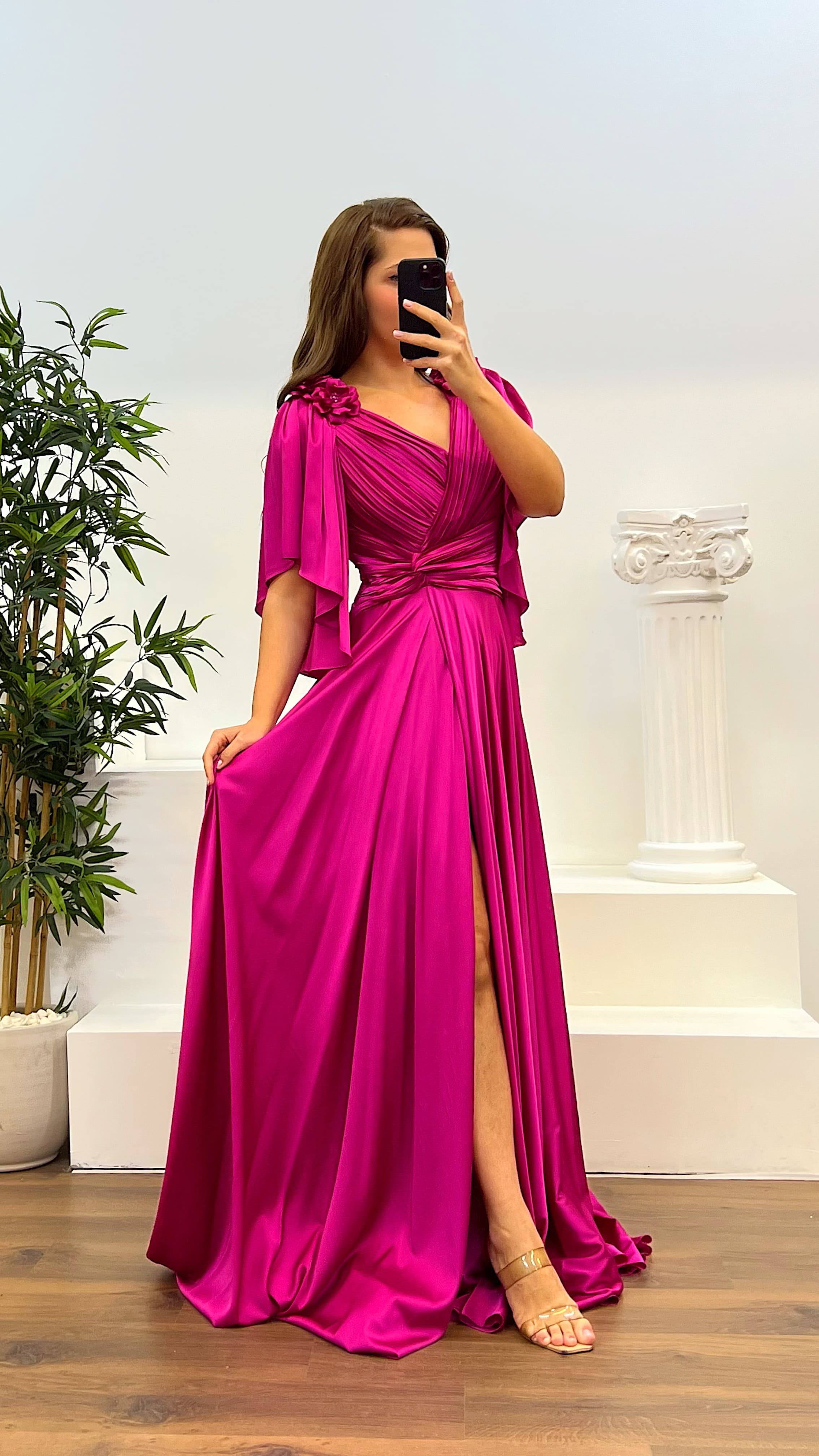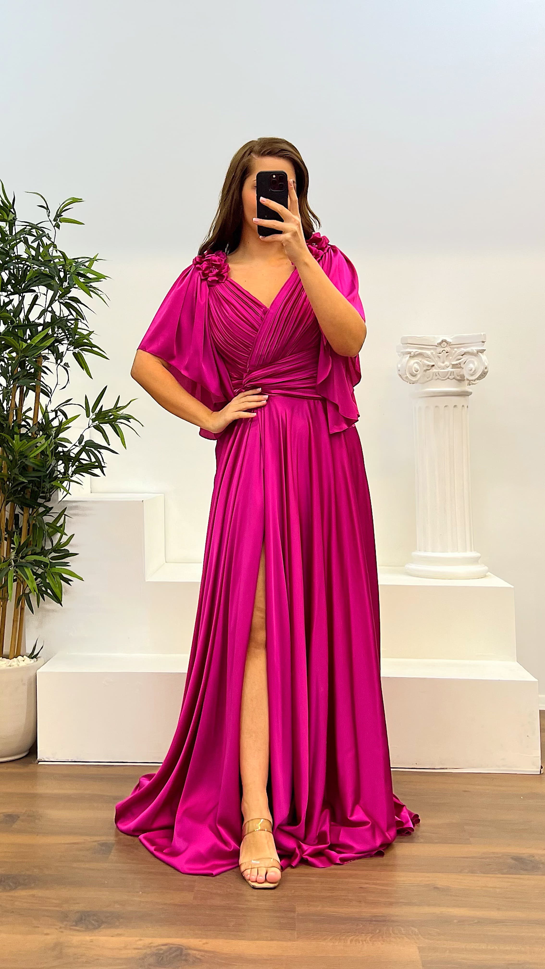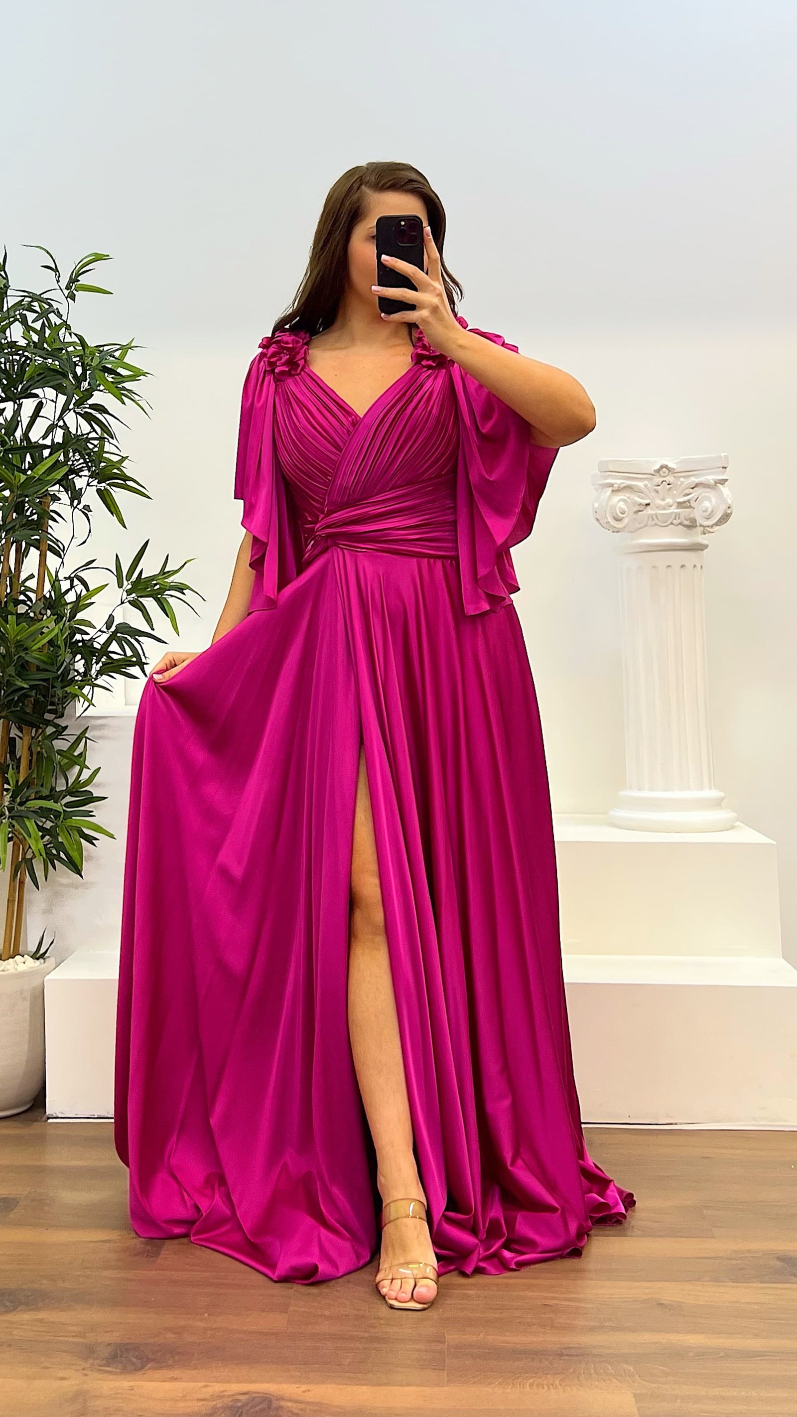 Fuşya Çiçek Detay Saten Büyük Beden Abiye Elbise
