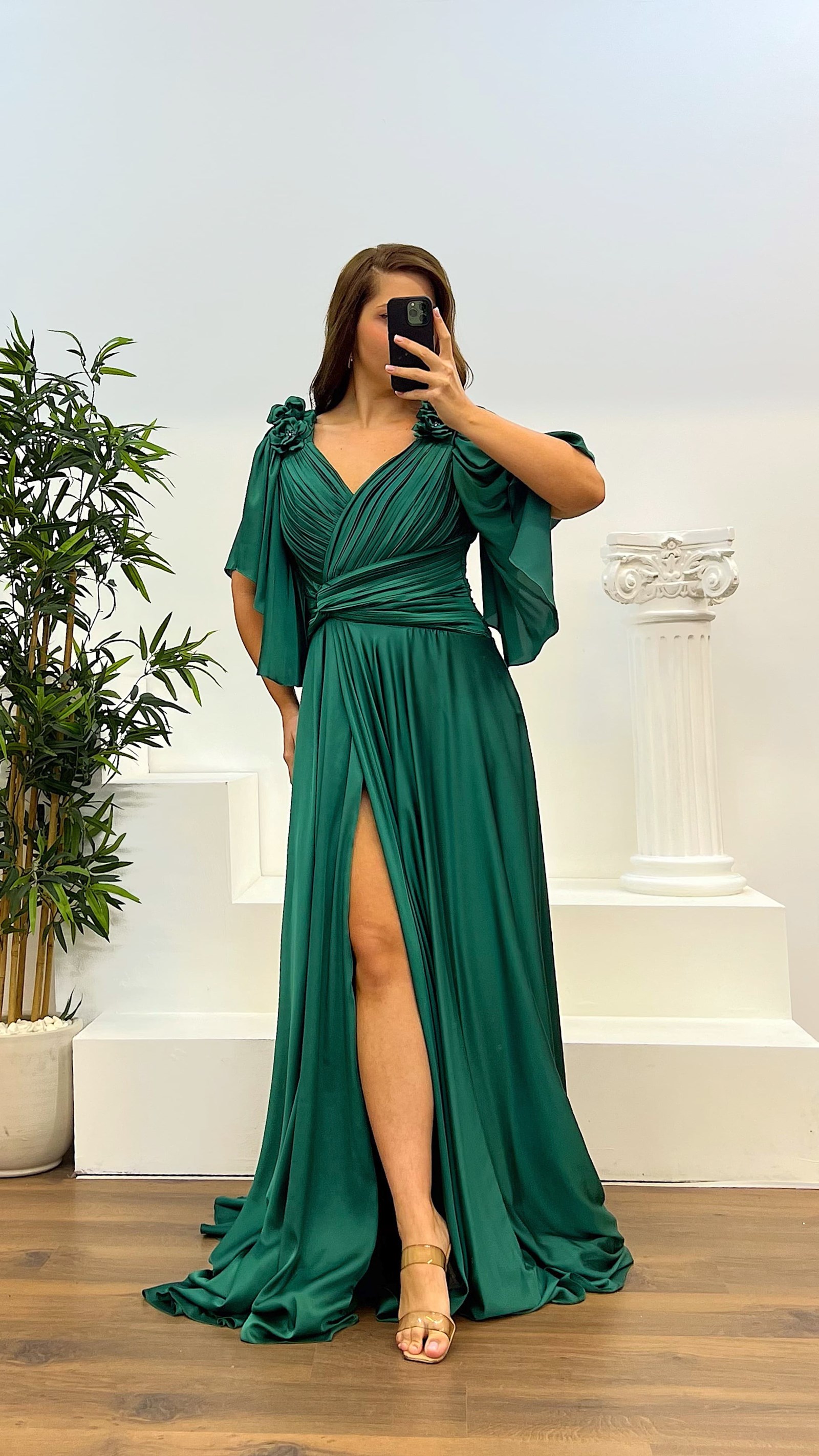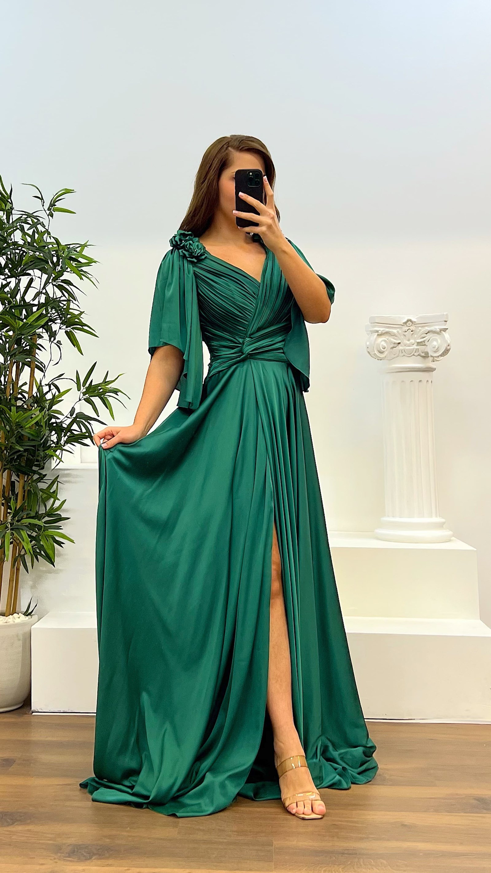 • Zümrüt Çiçek Detay Saten Büyük Beden Abiye Elbise