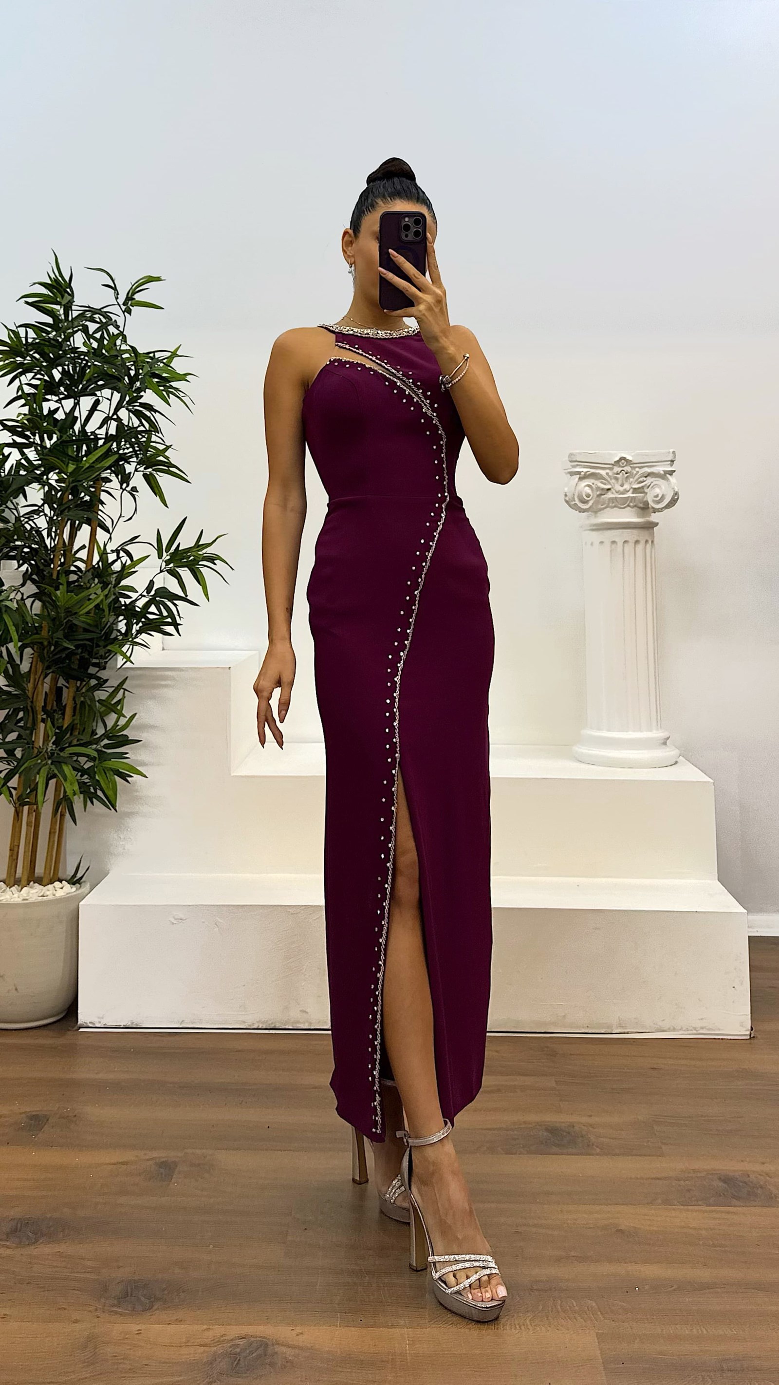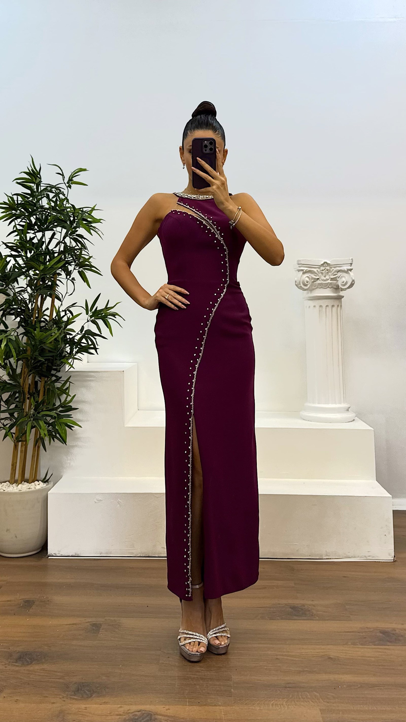 Vestido de noche con detalle de piedras y cuello halter El producto es compatible con tallas de la 36 a la 42, con copas internas, forrado, cierre con cremallera en la parte posterior, abertura y detalles de piedras, diseñado como un vestido de noche. La longitud del producto es de 160 cm. Tipo de tela: 100% poliéster.