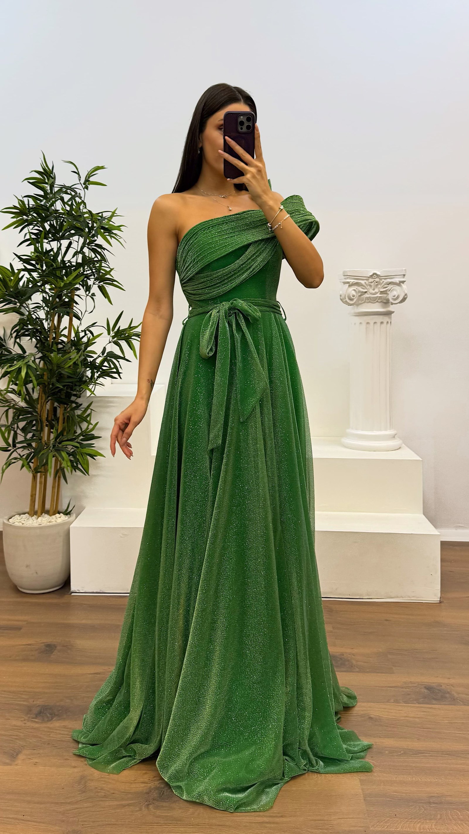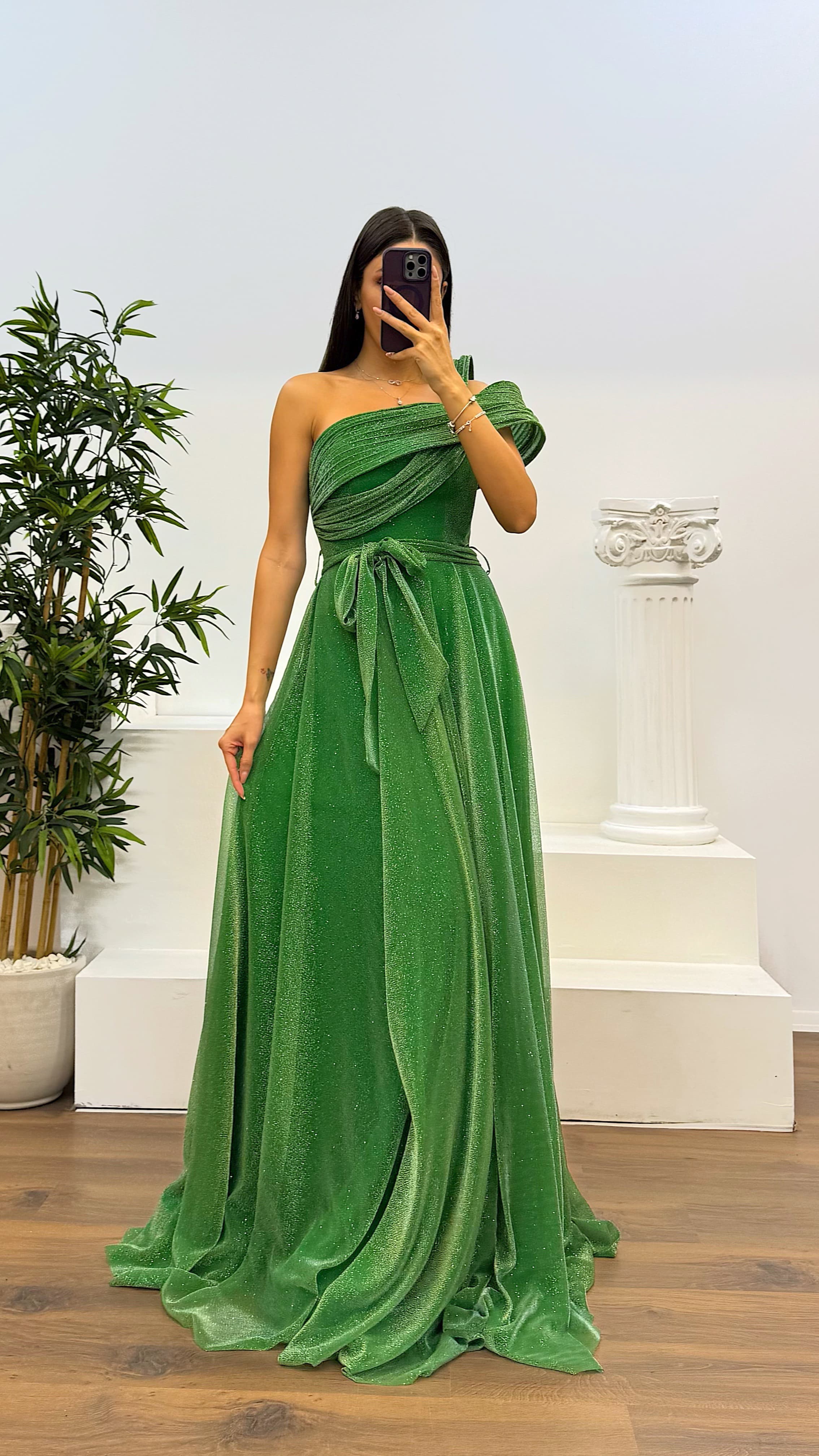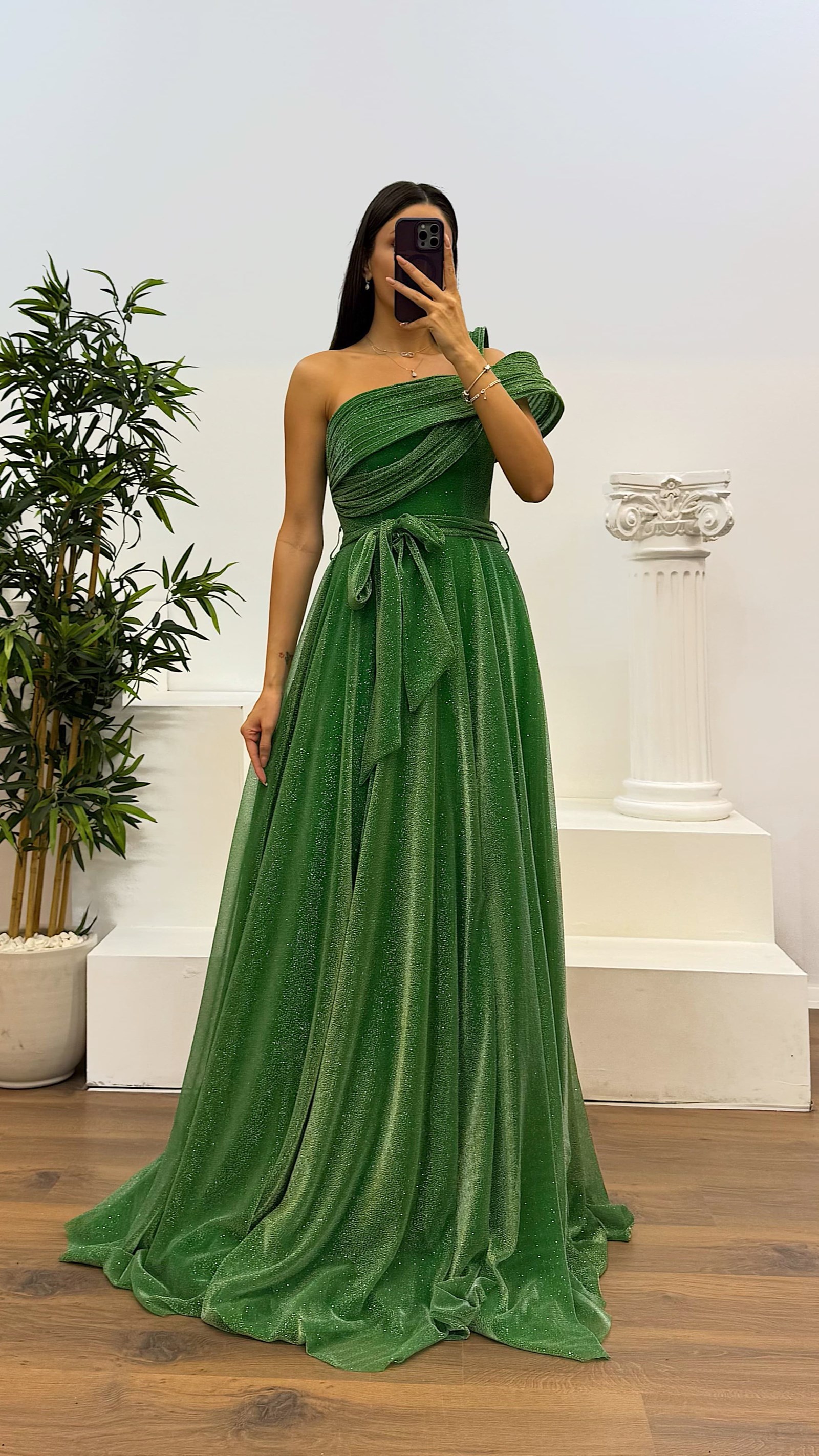 • Yeşil Tek Omuz Simli Kabarık Abiye Elbise