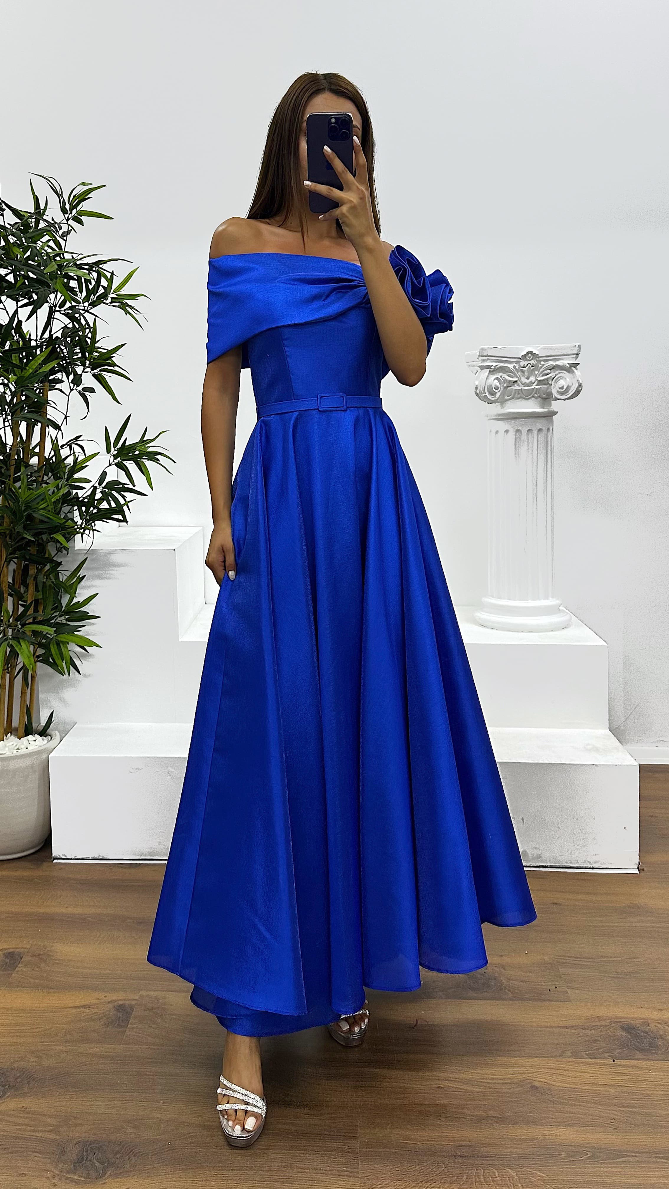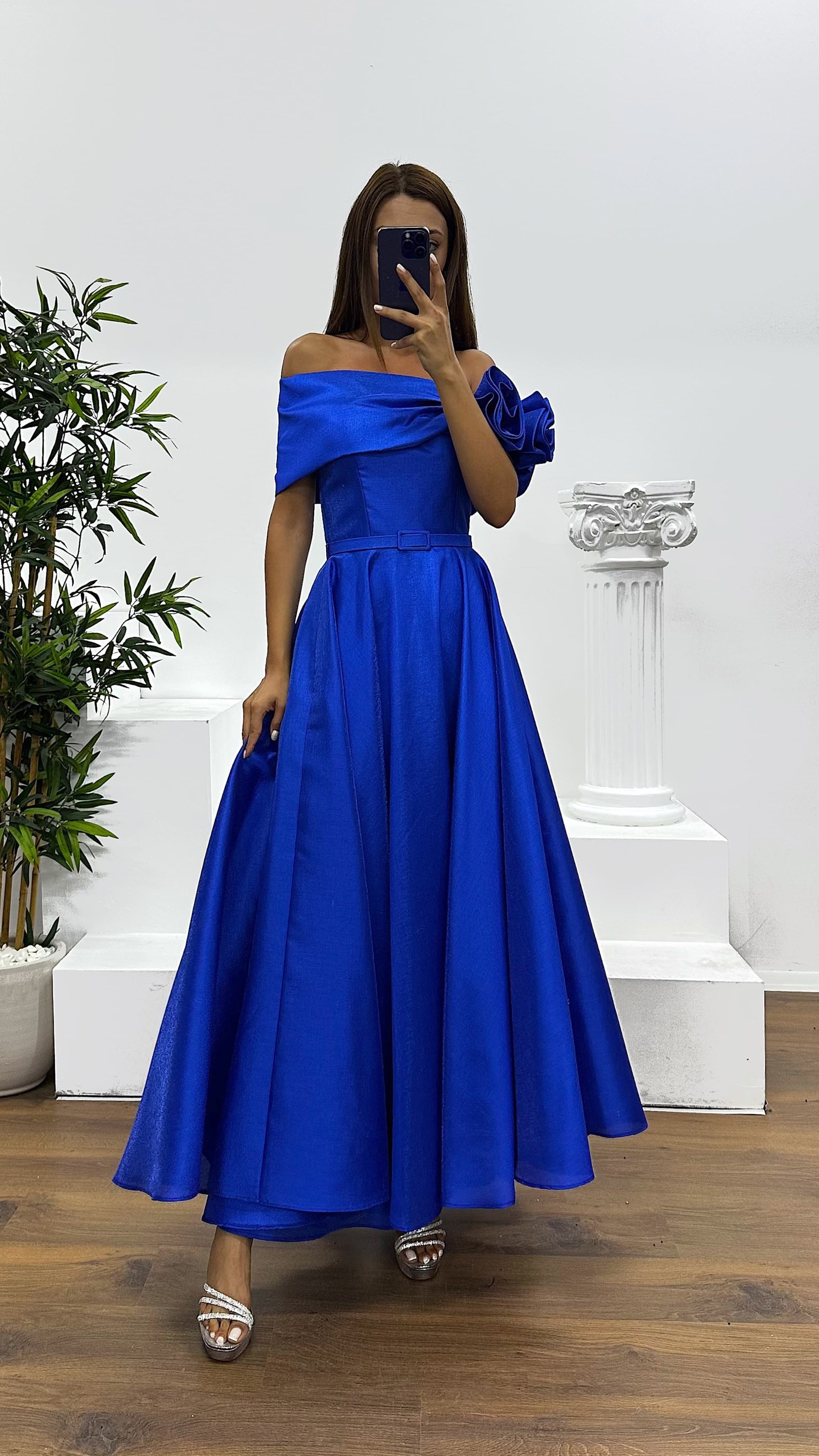• Fuşya Omuz Çiçek Detay Midi Abiye Elbise