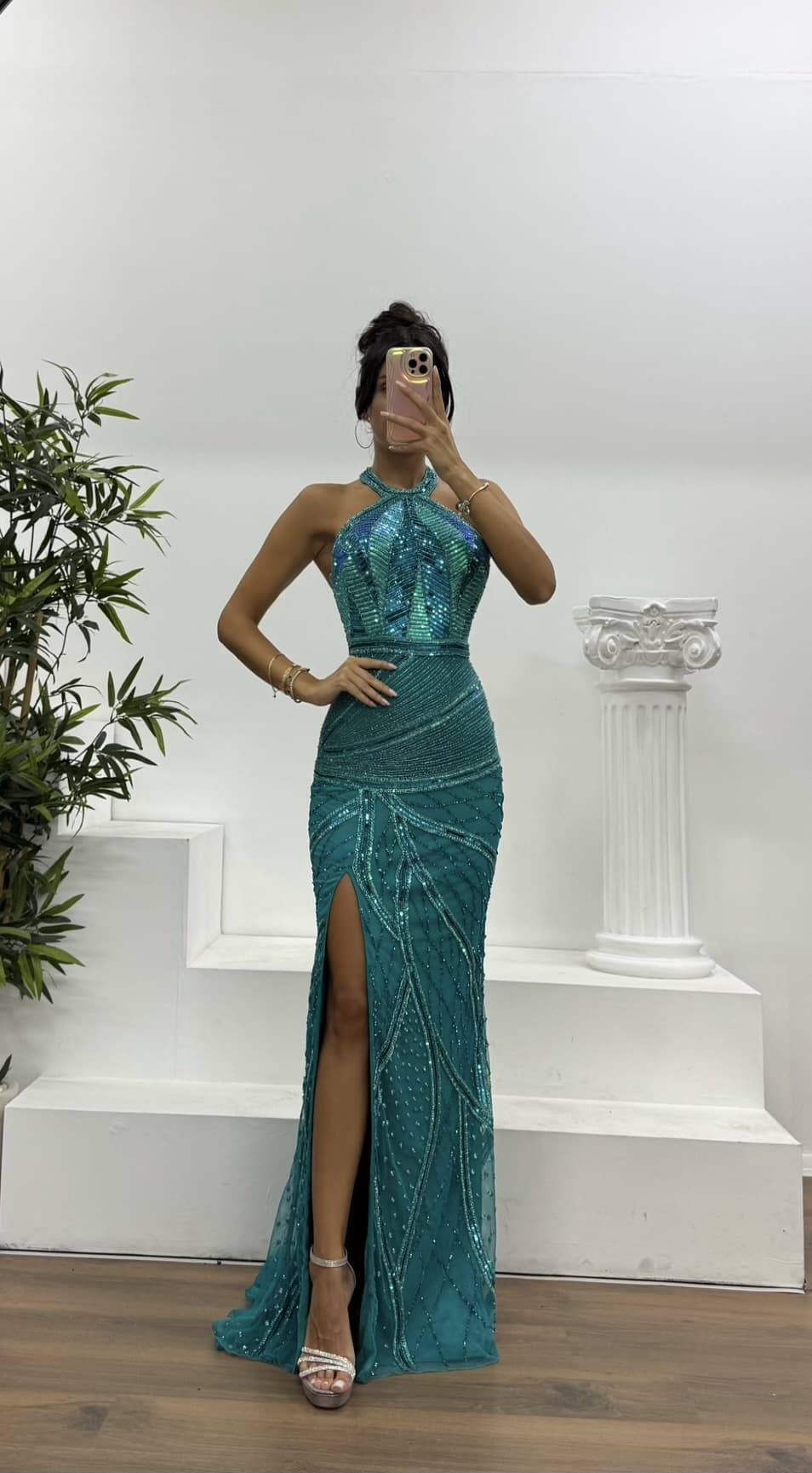 Vestido de noche bordado con cuello halter El vestido está diseñado como un vestido de noche bordado con cuello halter, compatible con tallas 36–40. Cuenta con copas en el busto, forro completo, cremallera trasera y abertura lateral. Largo del vestido: Puede variar entre 170–175 cm. Tejido: Tul bordado – 97 % poliéster, 3 % elastano.
