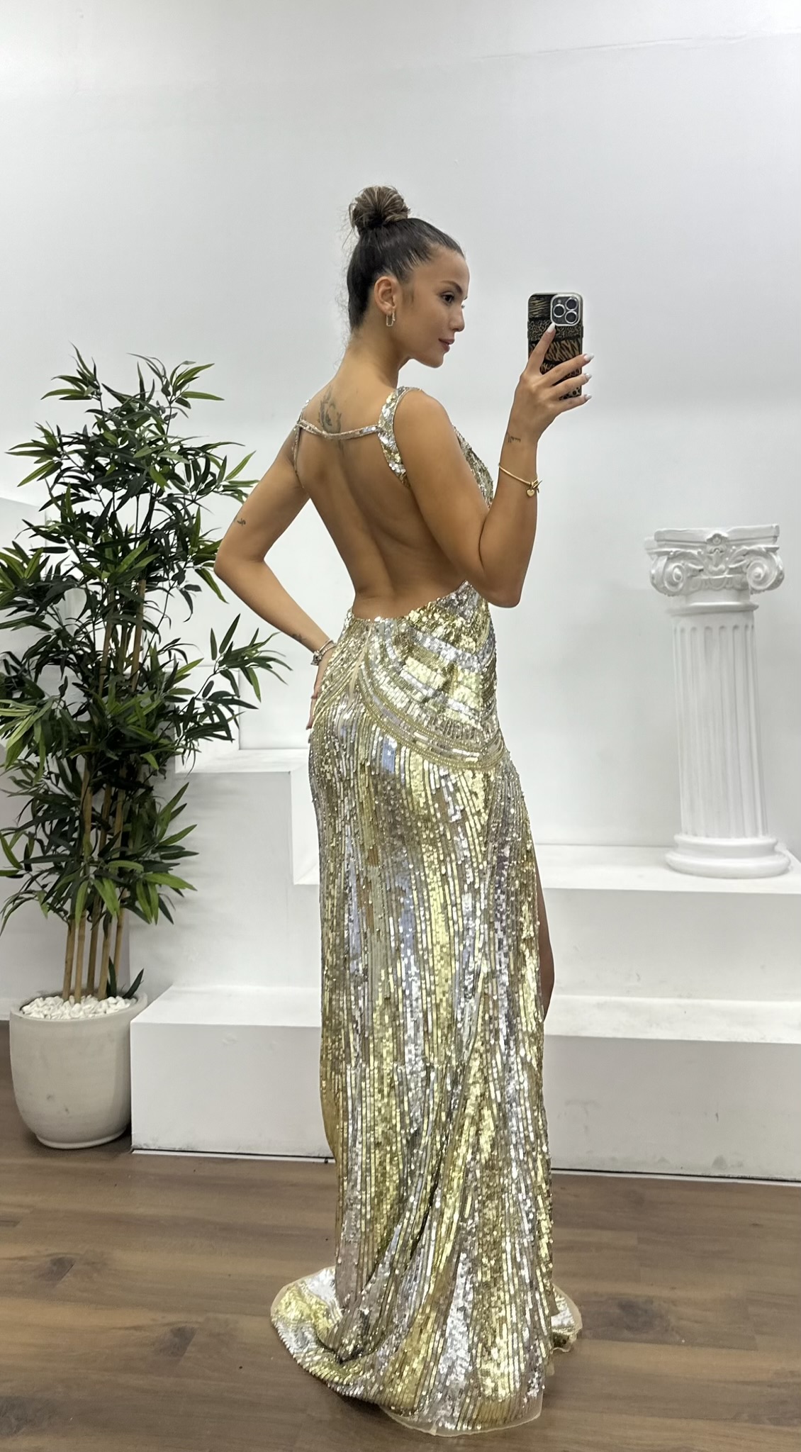 • Siyah-Gold Sırt Detay Özel El İşlemesi Abiye Elbise