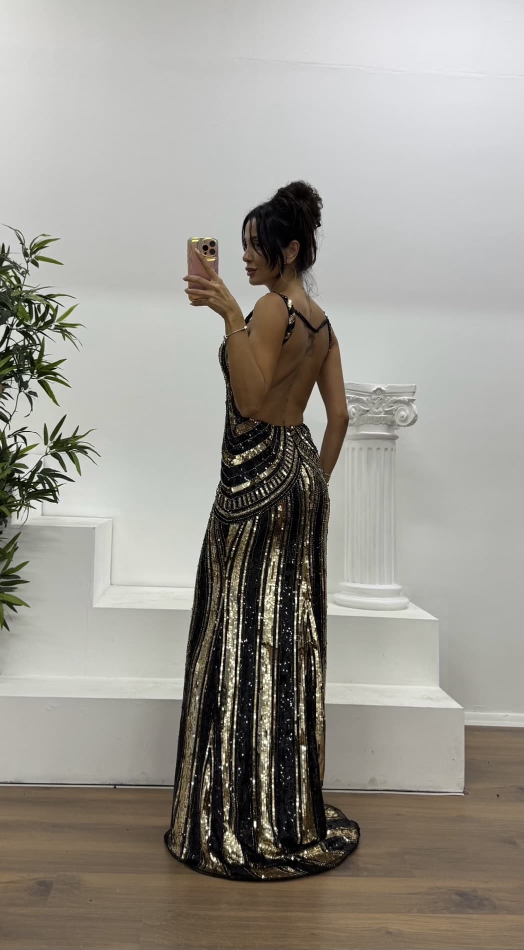 Vestido de noche bordado con detalle en la espalda Compatible con tallas 36–38, con copas en el busto, forro, cremallera y abertura. Diseñado como vestido de noche con detalle en la espalda. Largo del vestido: puede variar entre 170–175 cm. Tipo de tela: lentejuelas, 100 % poliéster.