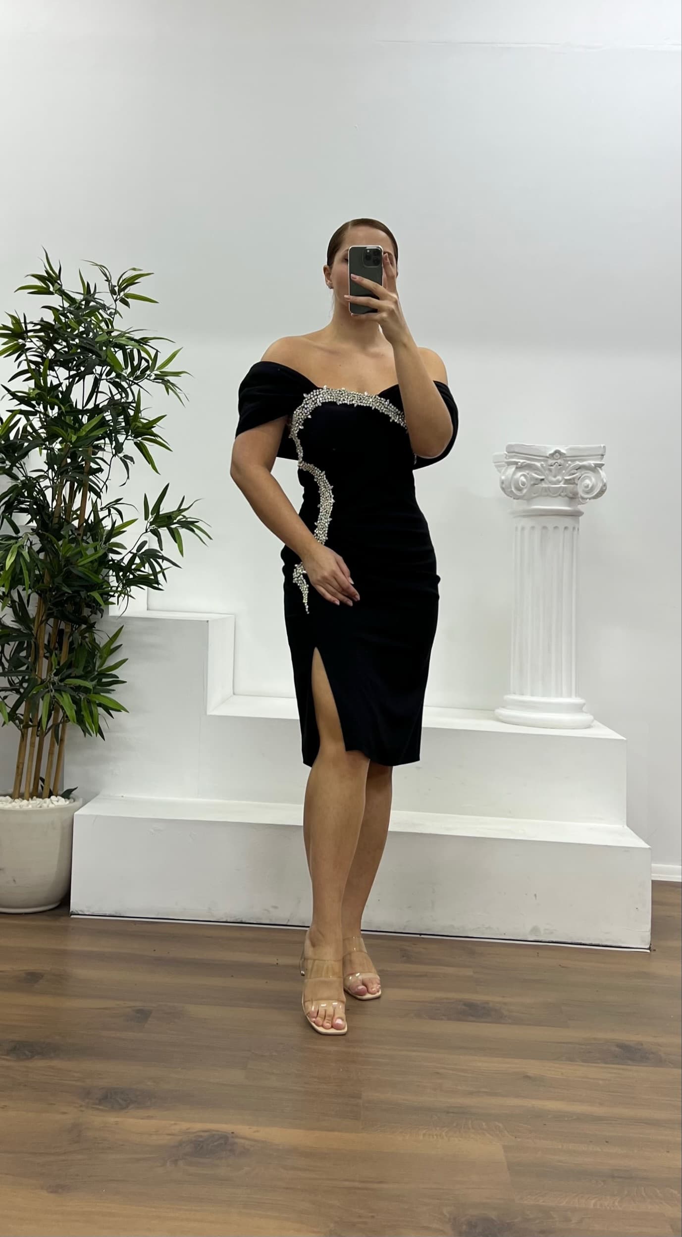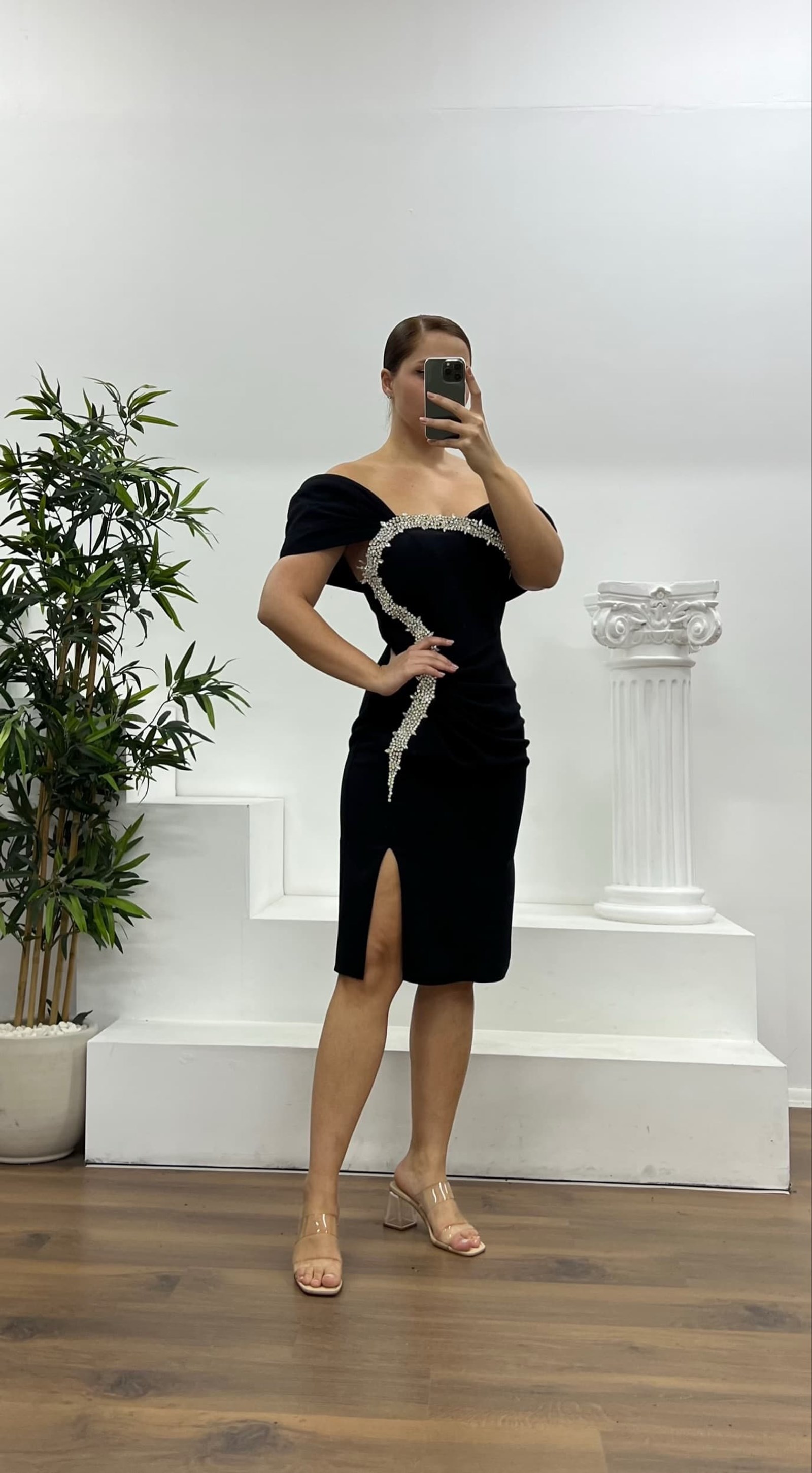 Siyah Taş Detay Mini Büyük Beden Abiye Elbise