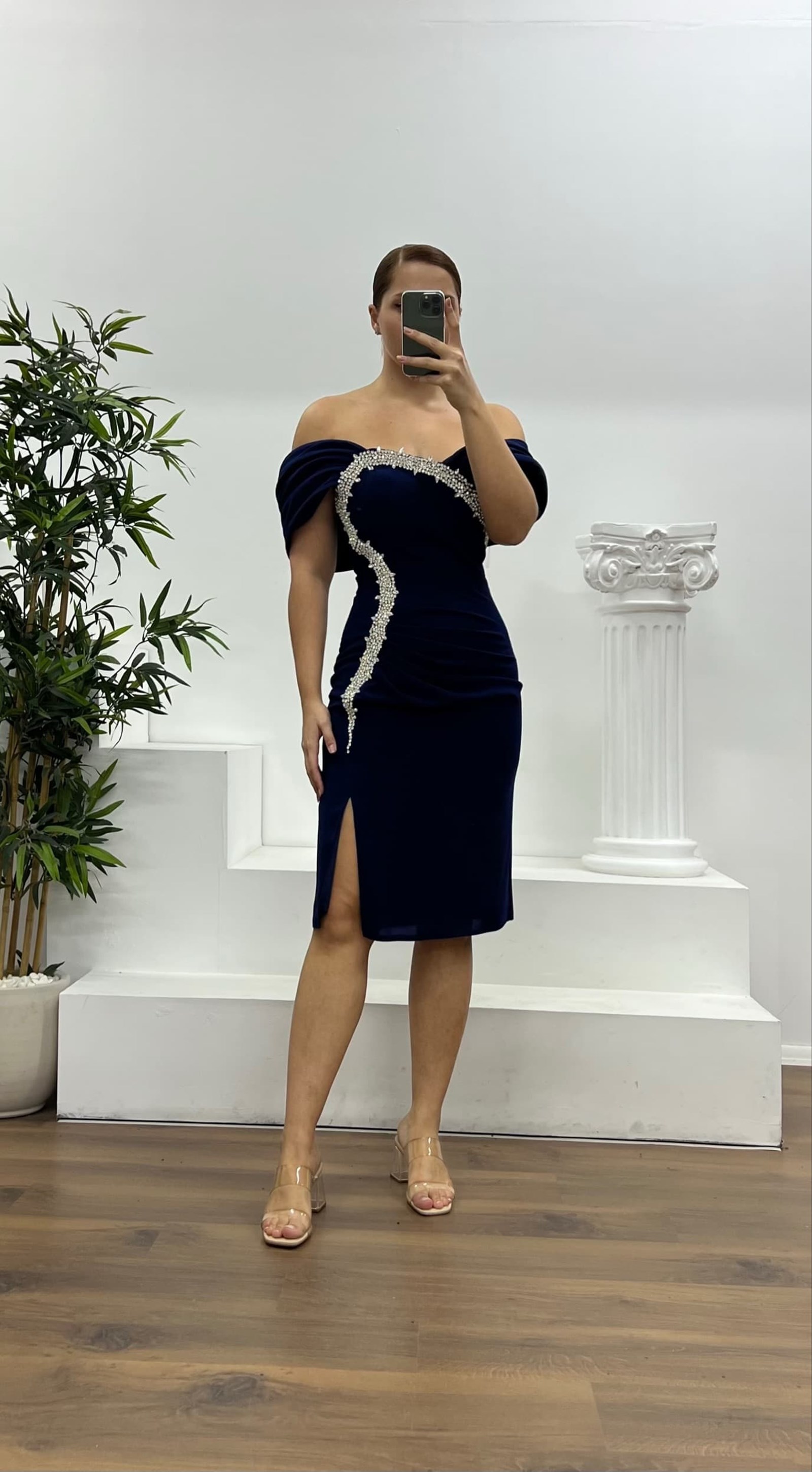 Vestido de fiesta con detalles de pedrería. Apto para tallas 44–48, con copas en el pecho, forro interior, cierre trasero con cremallera, abertura y escote barco. Diseñado como un elegante vestido de noche con detalles de piedras. Largo del vestido: 100 cm. Tipo de tela: atlas, 100 % poliéster. Ideal para bodas, compromisos, graduaciones o eventos donde quieras destacar con elegancia.