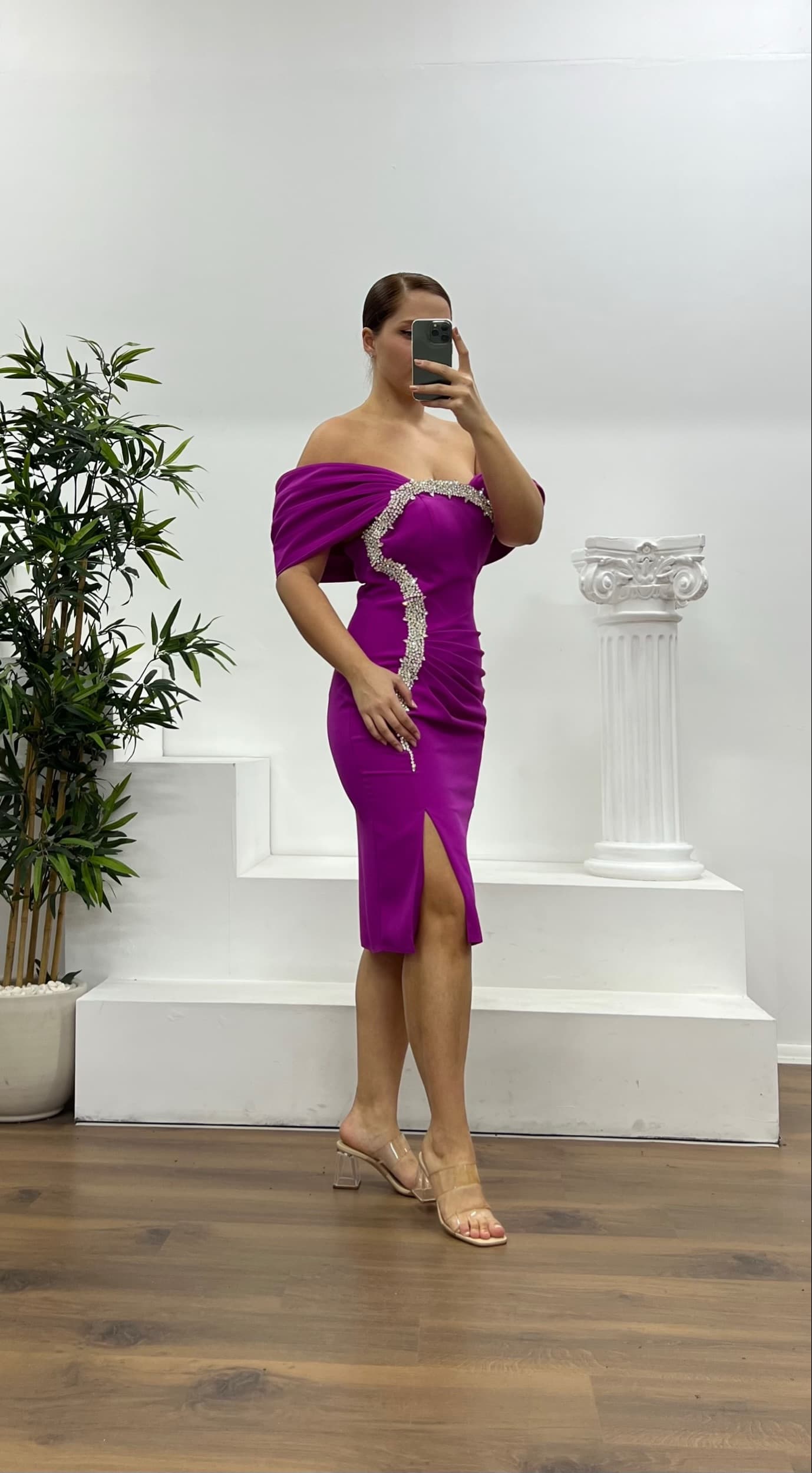 • Fuşya Taş Detay Mini Büyük Beden Abiye Elbise
