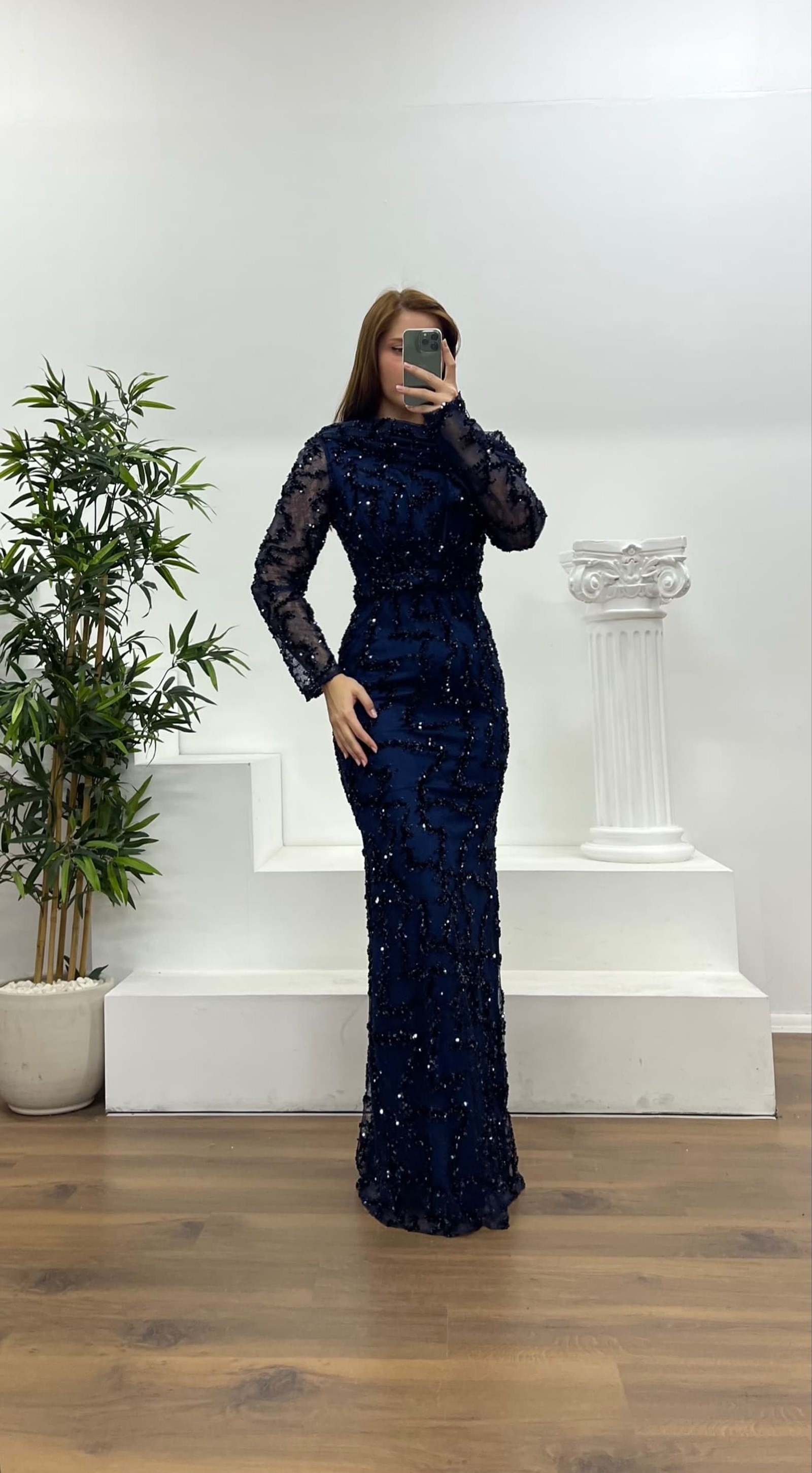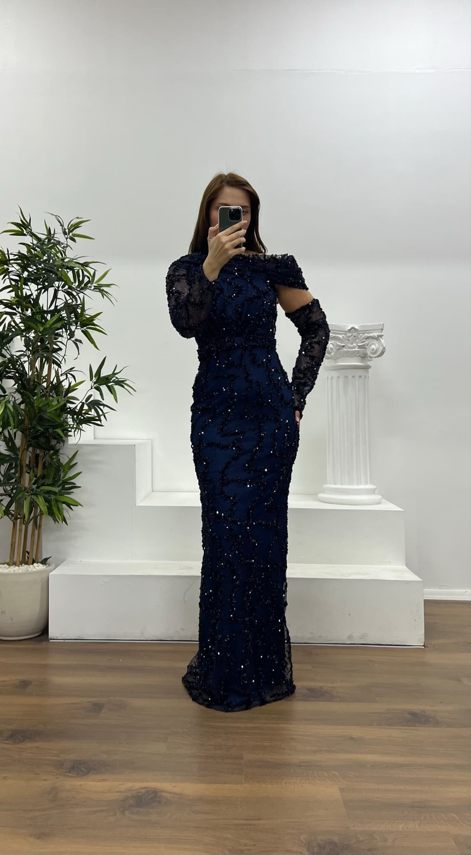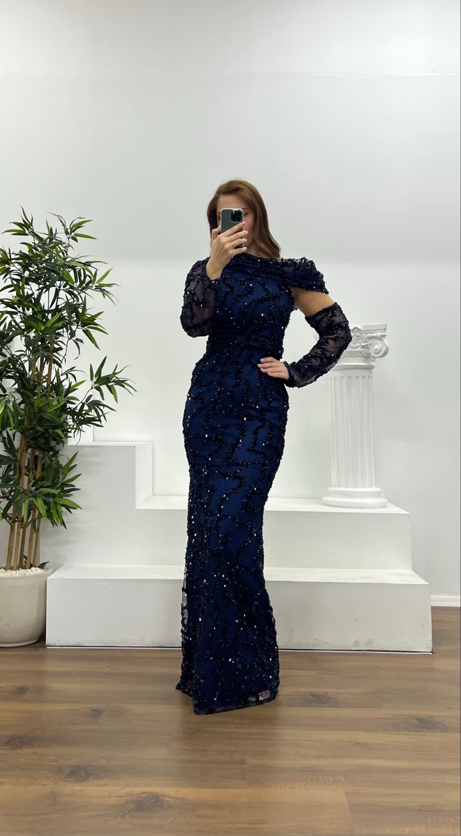 • Lacivert Asimetrik Yaka İşlemeli Büyük Beden Abiye Elbise