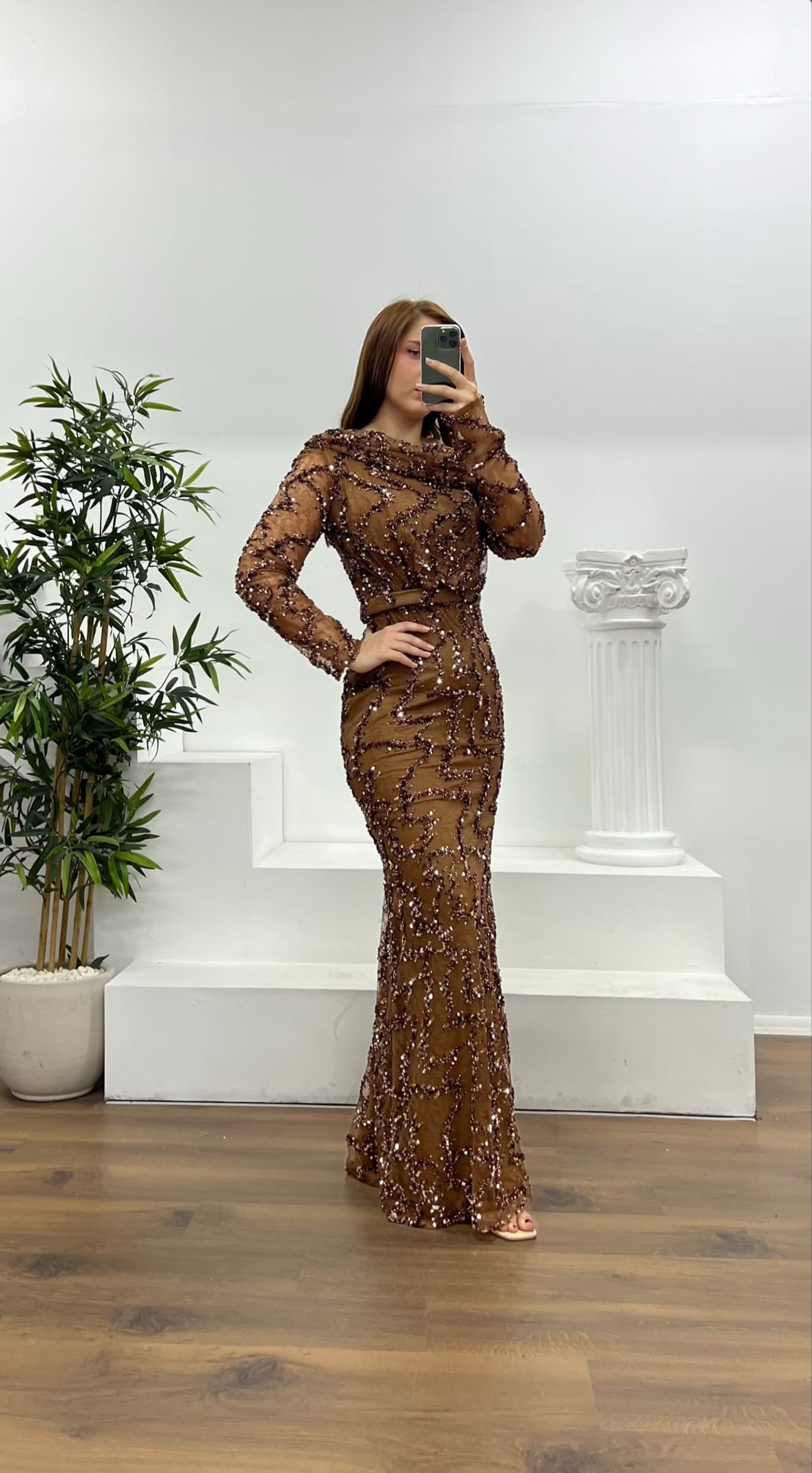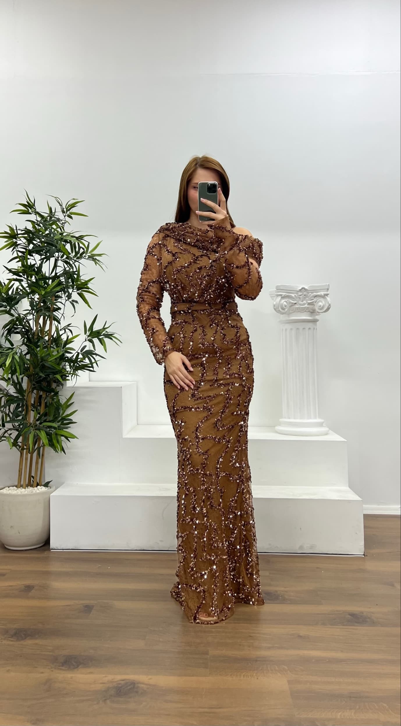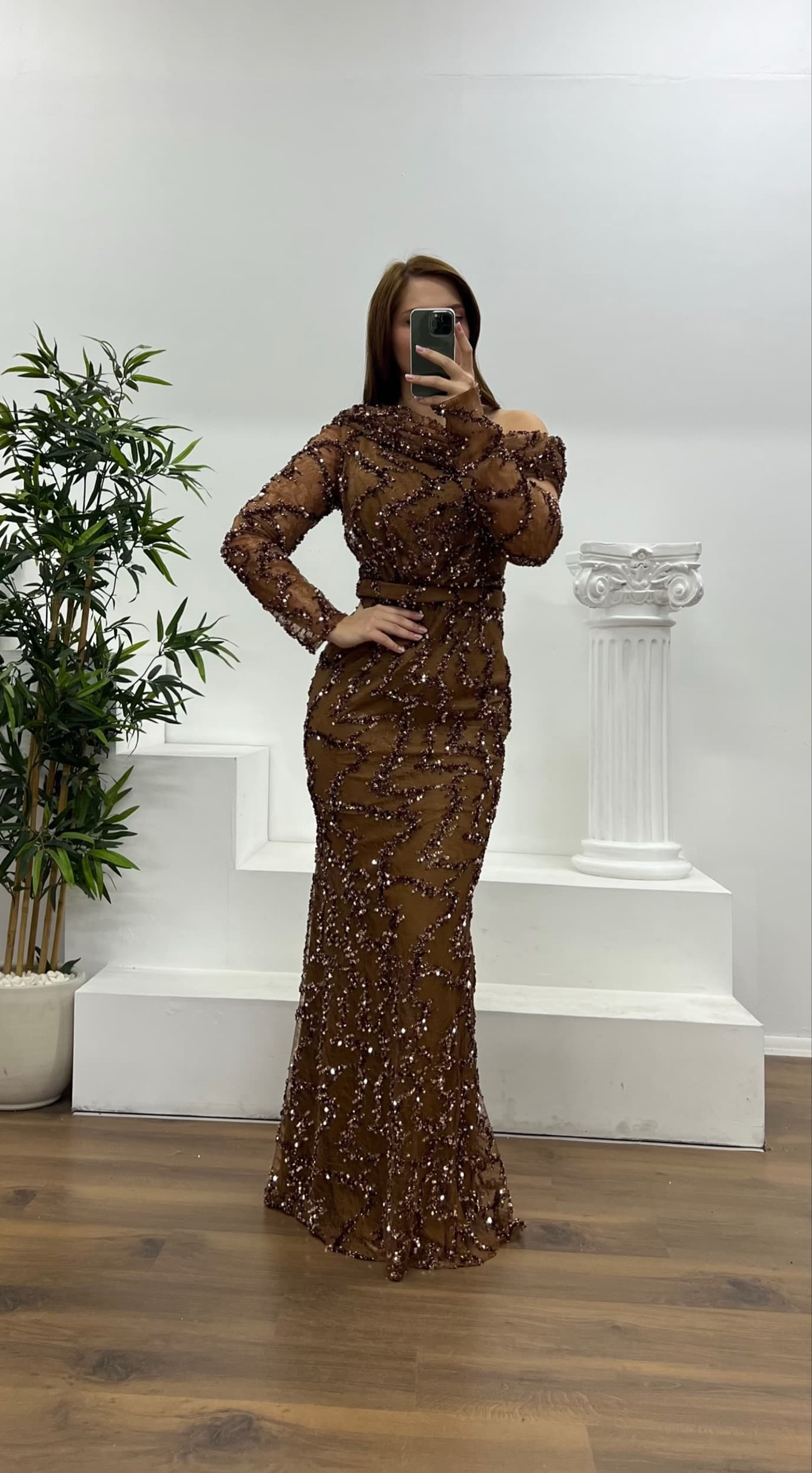 • Kahverengi Asimetrik Yaka İşlemeli Büyük Beden Abiye Elbise