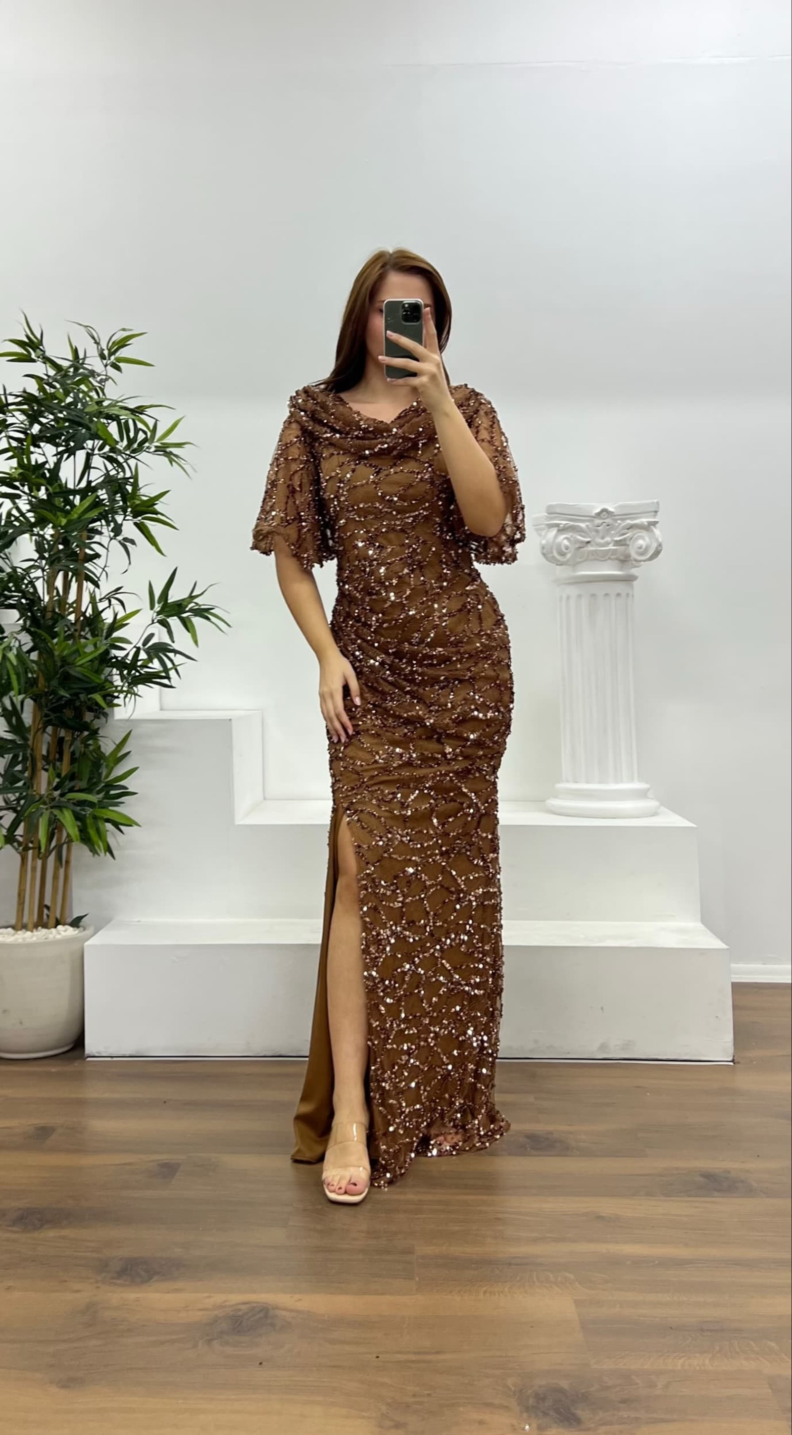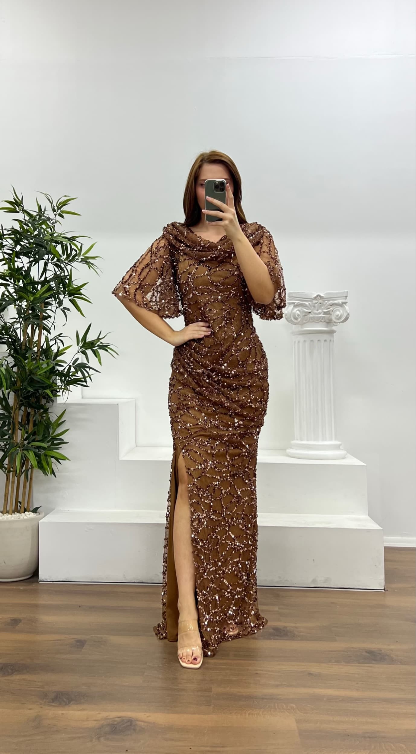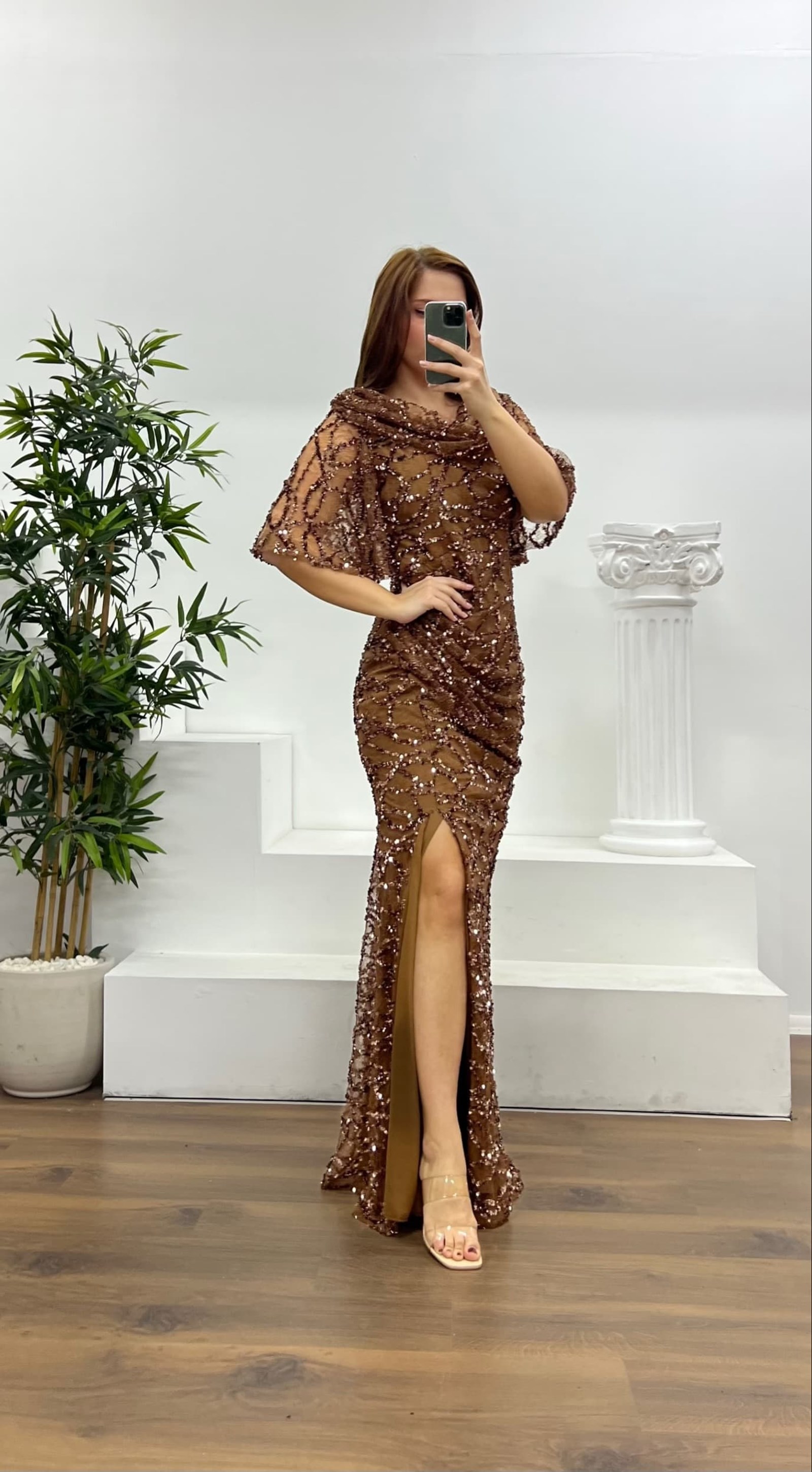 Kahverengi Dökümlü Boncuk İşlemeli Büyük Beden Abiye Elbise