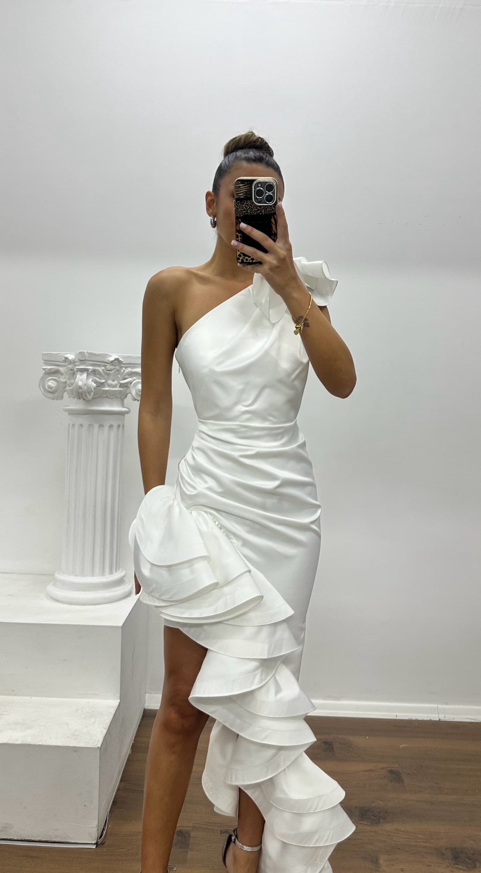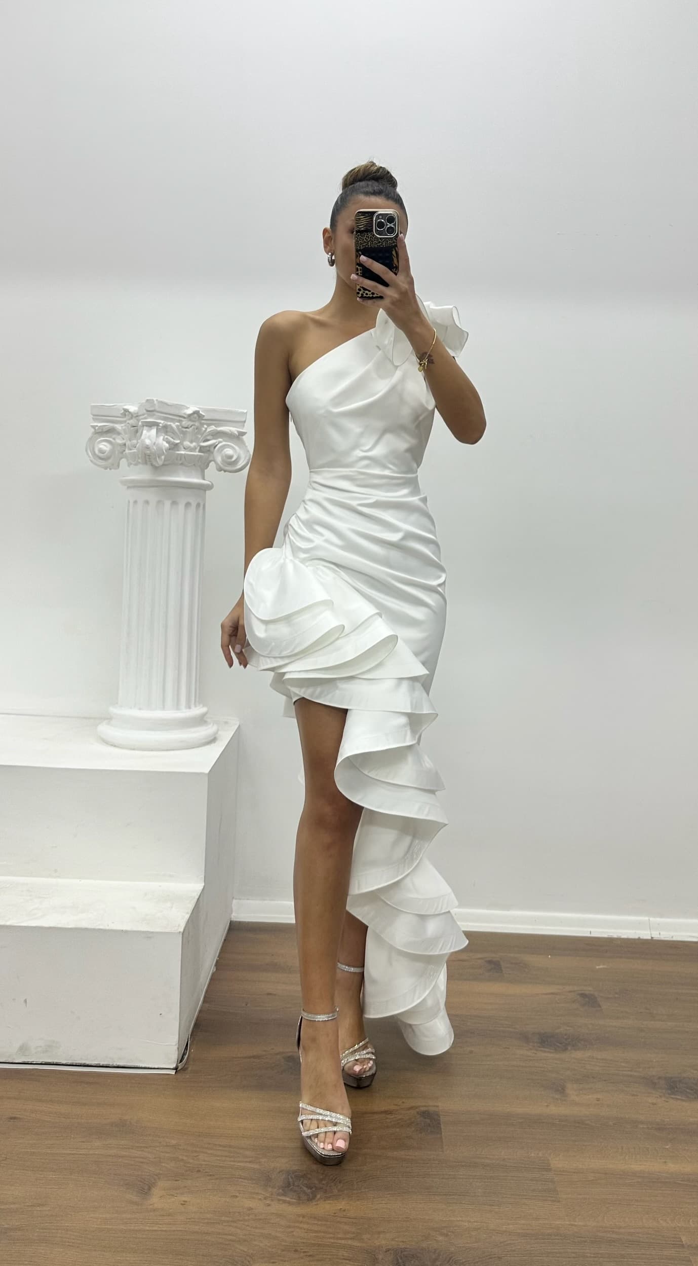 • Beyaz Tek Omuz Asimetrik Valonlu Saten Özel Tasarım Abiye Elbise