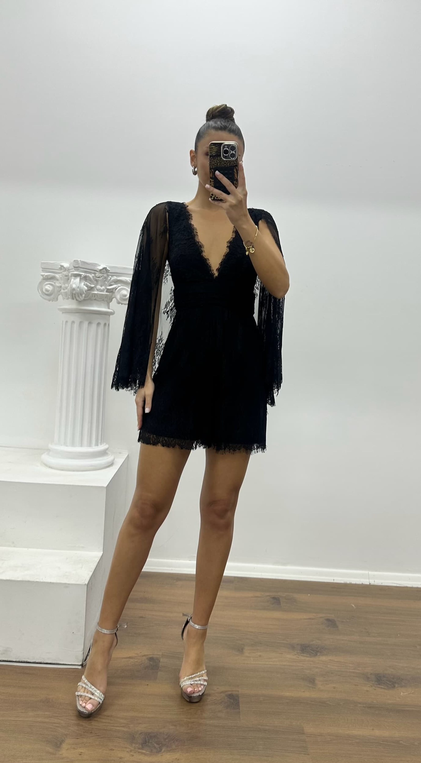 • Siyah V Yaka Dantel Özel Tasarım Mini Abiye Tulum