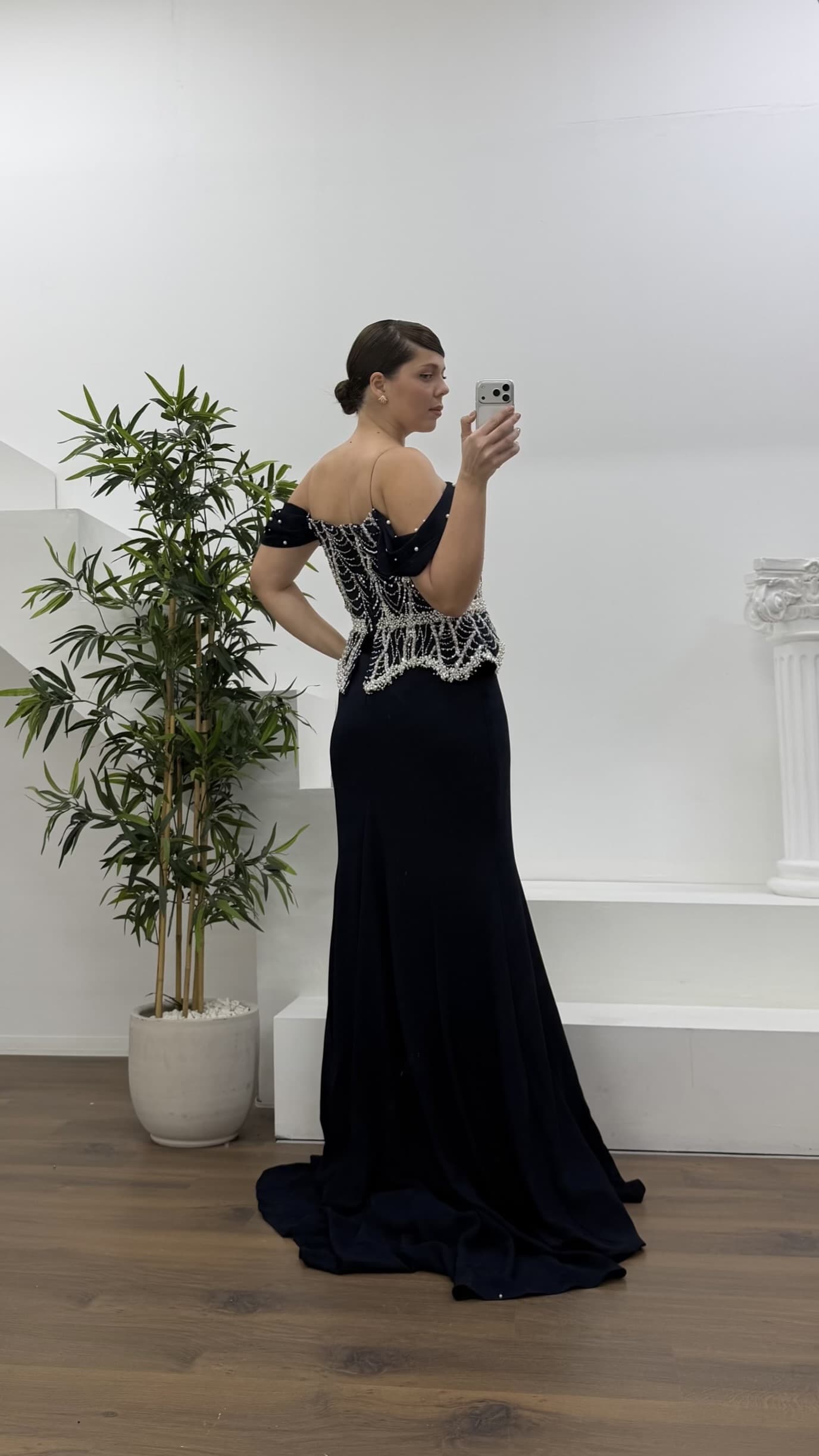 Vestido de noche azul marino de talla grande  estilo peplum  con detalle de perlas y mangas caídas
