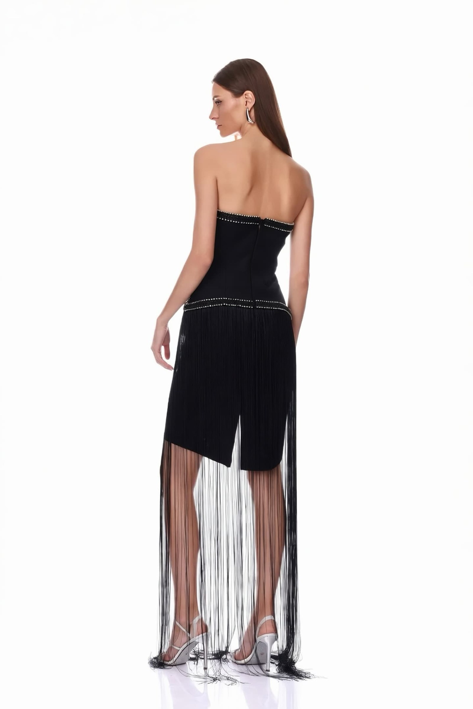 • Siyah Uzun Püsküllü Straplez Abiye Elbise