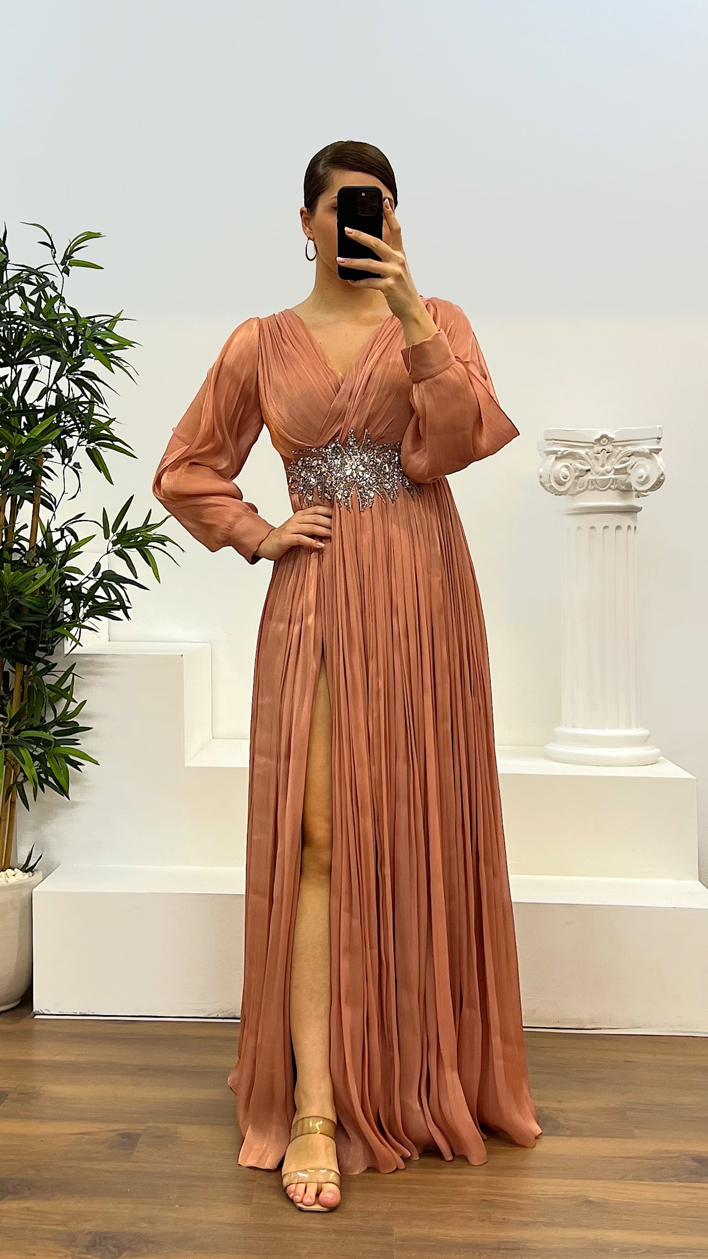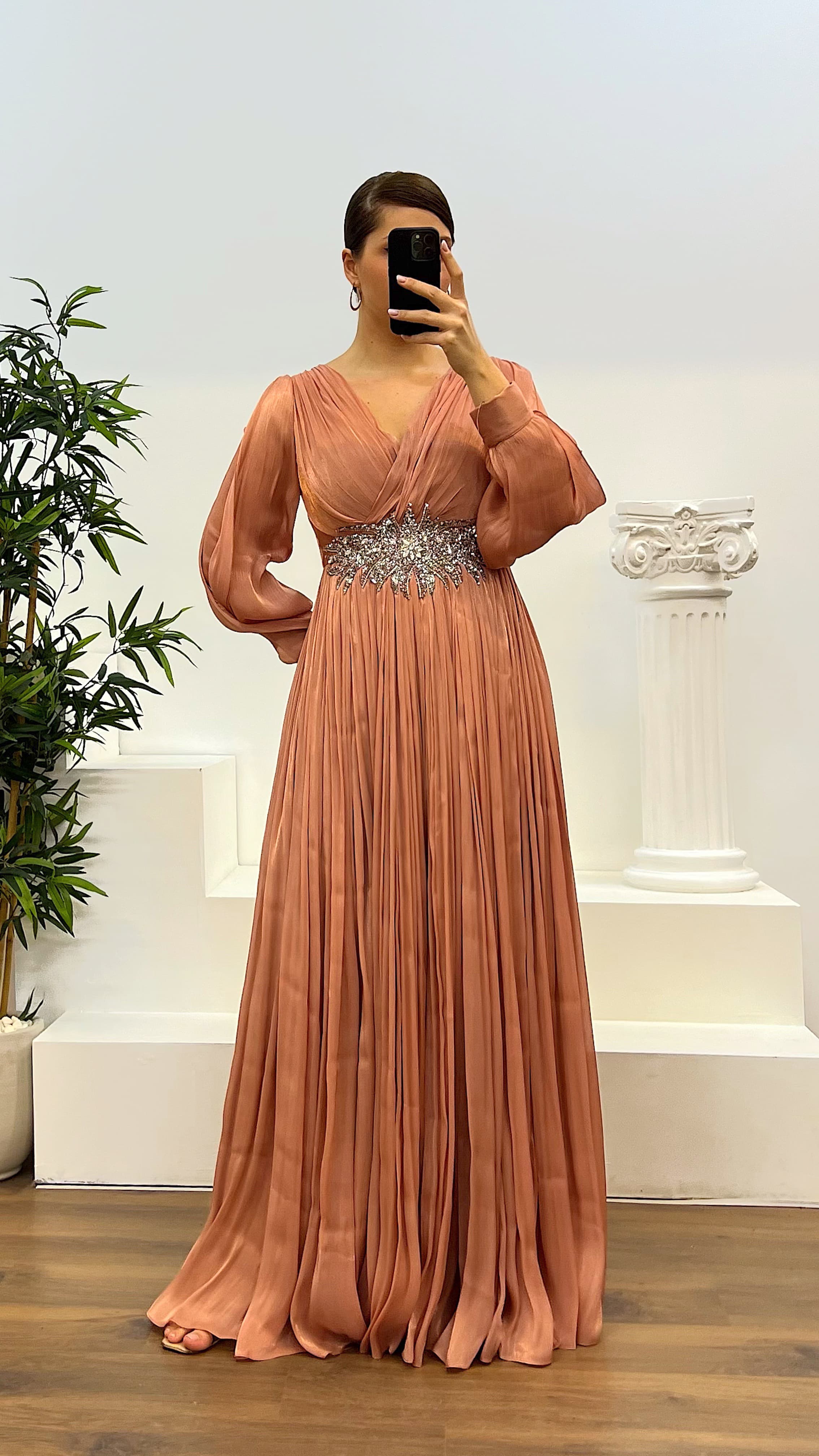 Robe de soirée avec détails à la taille Le produit est compatible avec les tailles 44-48, conçu avec des coussinets de poitrine, doublé, fermeture à glissière à l'arrière, fente et broderie à la taille. La longueur du produit : peut varier entre 165 et 170 cm. La longueur des manches du produit : 65 cm. Type de tissu : chiffon 66 % viscose 34 % polyester.