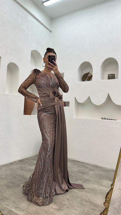 • Mint Yeşili Drapeli Tüylü İşlemeli Abiye Elbise
