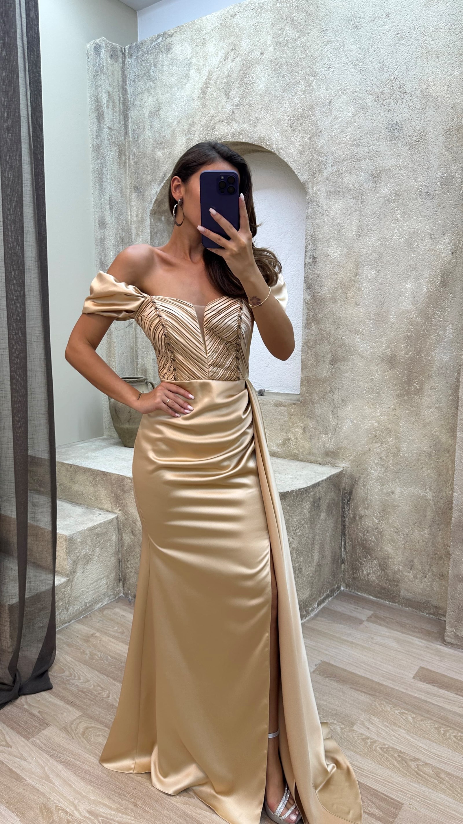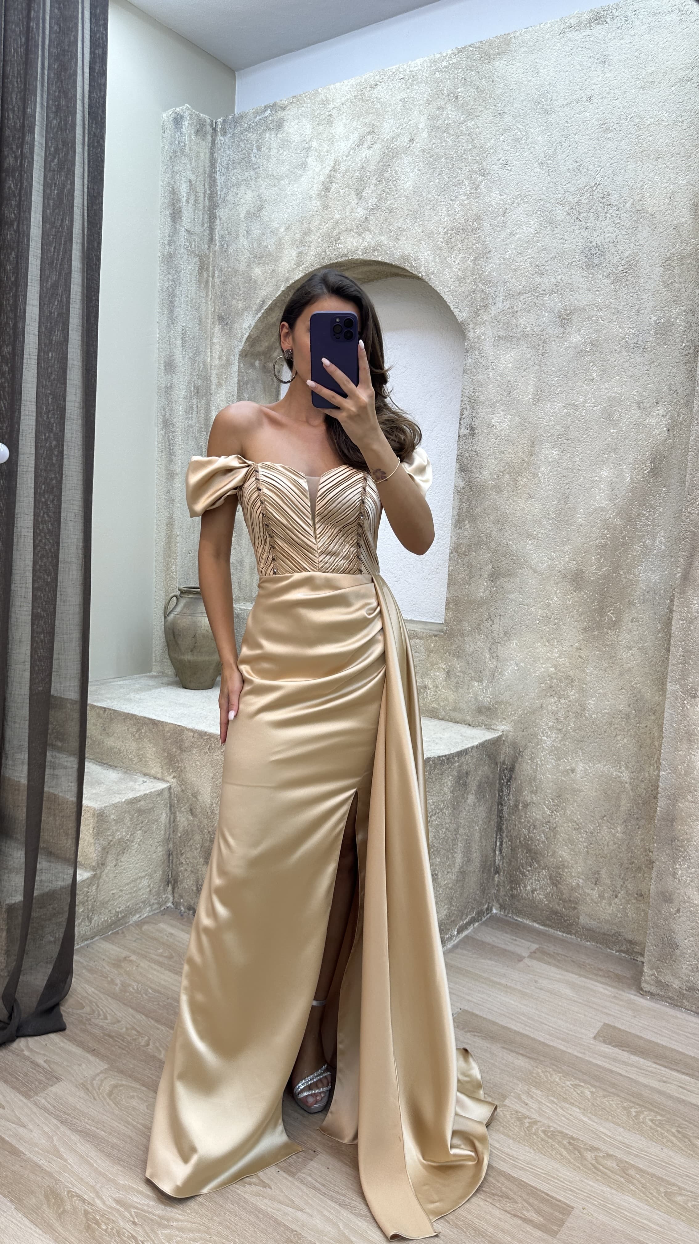 • Bej Omuz Detay Göğsü Drapeli Abiye Elbise