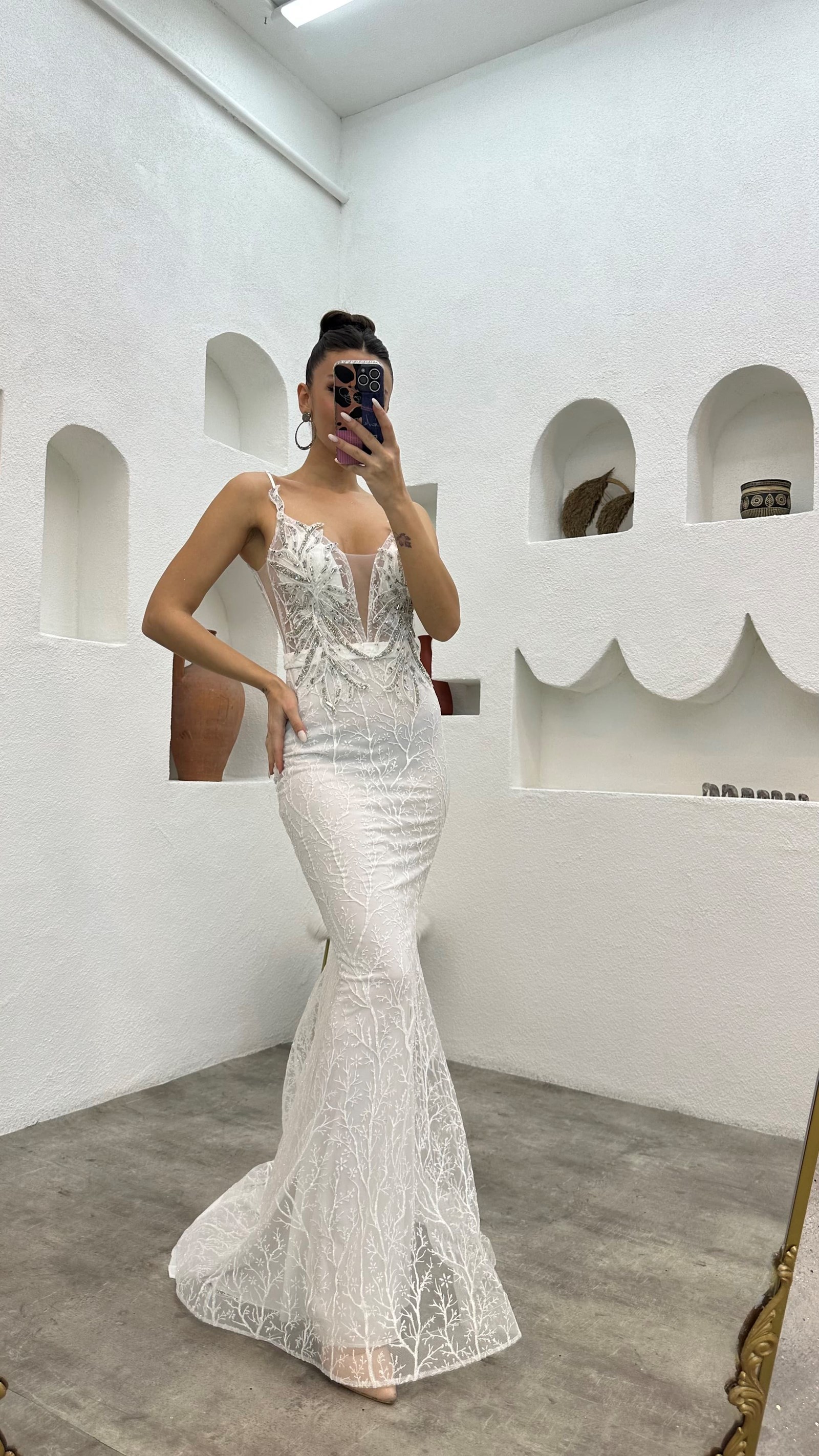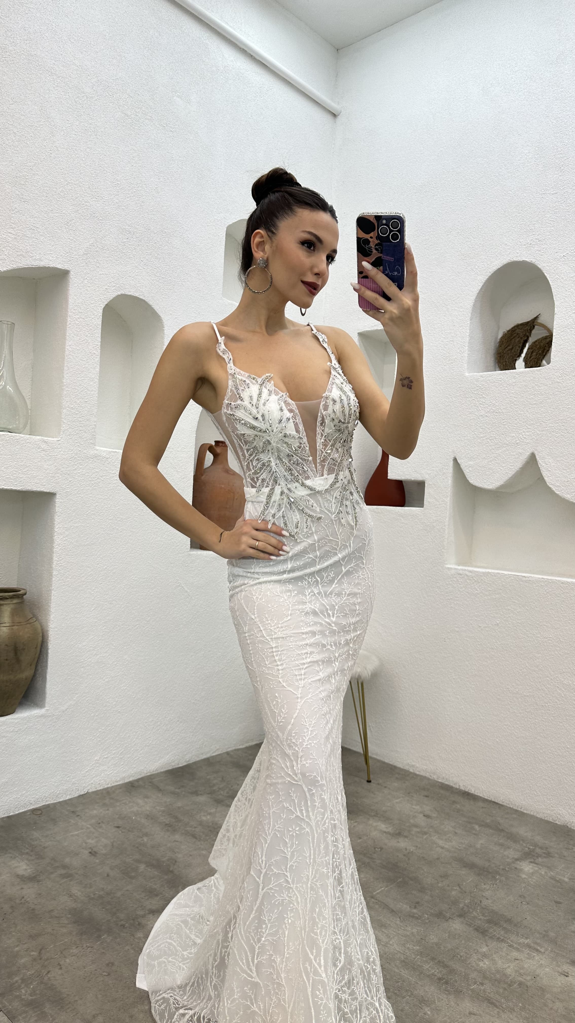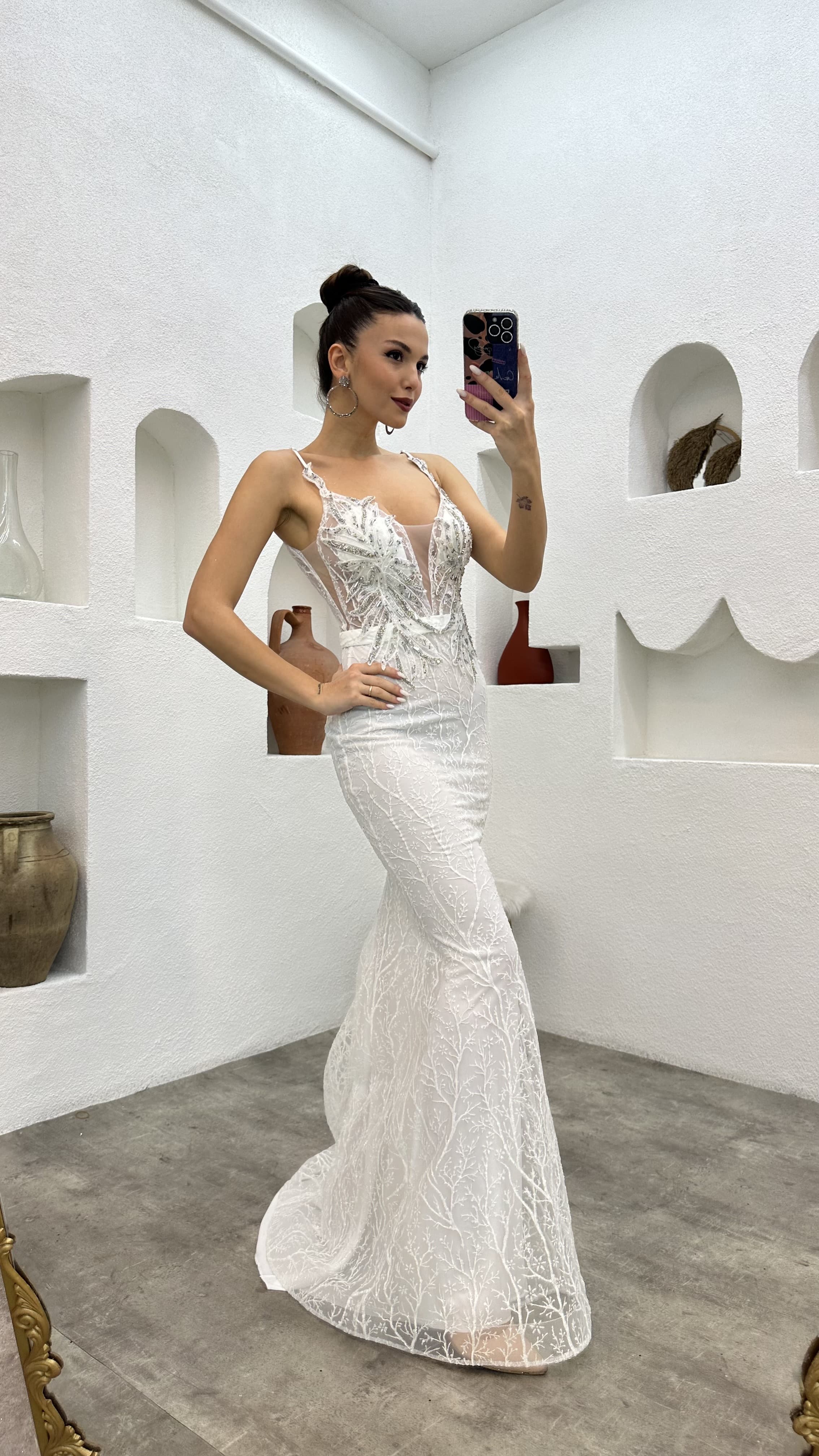 Beyaz İp Askılı İşlemeli Tül Abiye Elbise