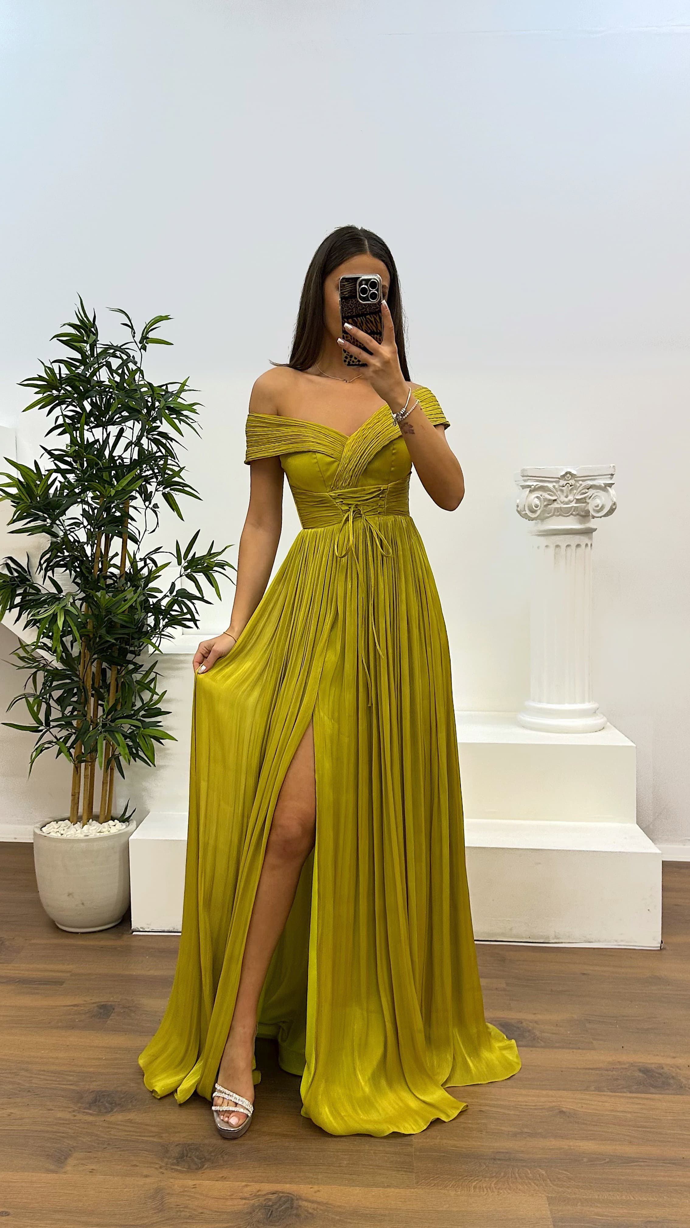 • Elma Yeşili Madonna Yaka Piliseli Abiye Elbise