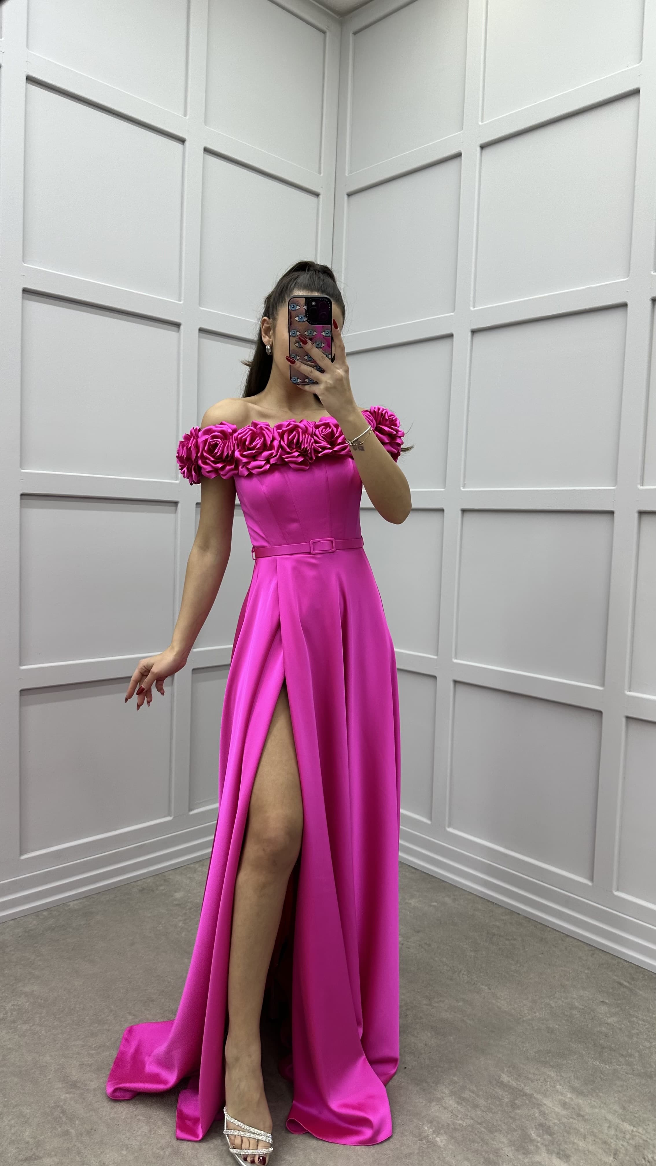 • Fuşya Göğsü Gül Detay Tasarım Saten Abiye Elbise