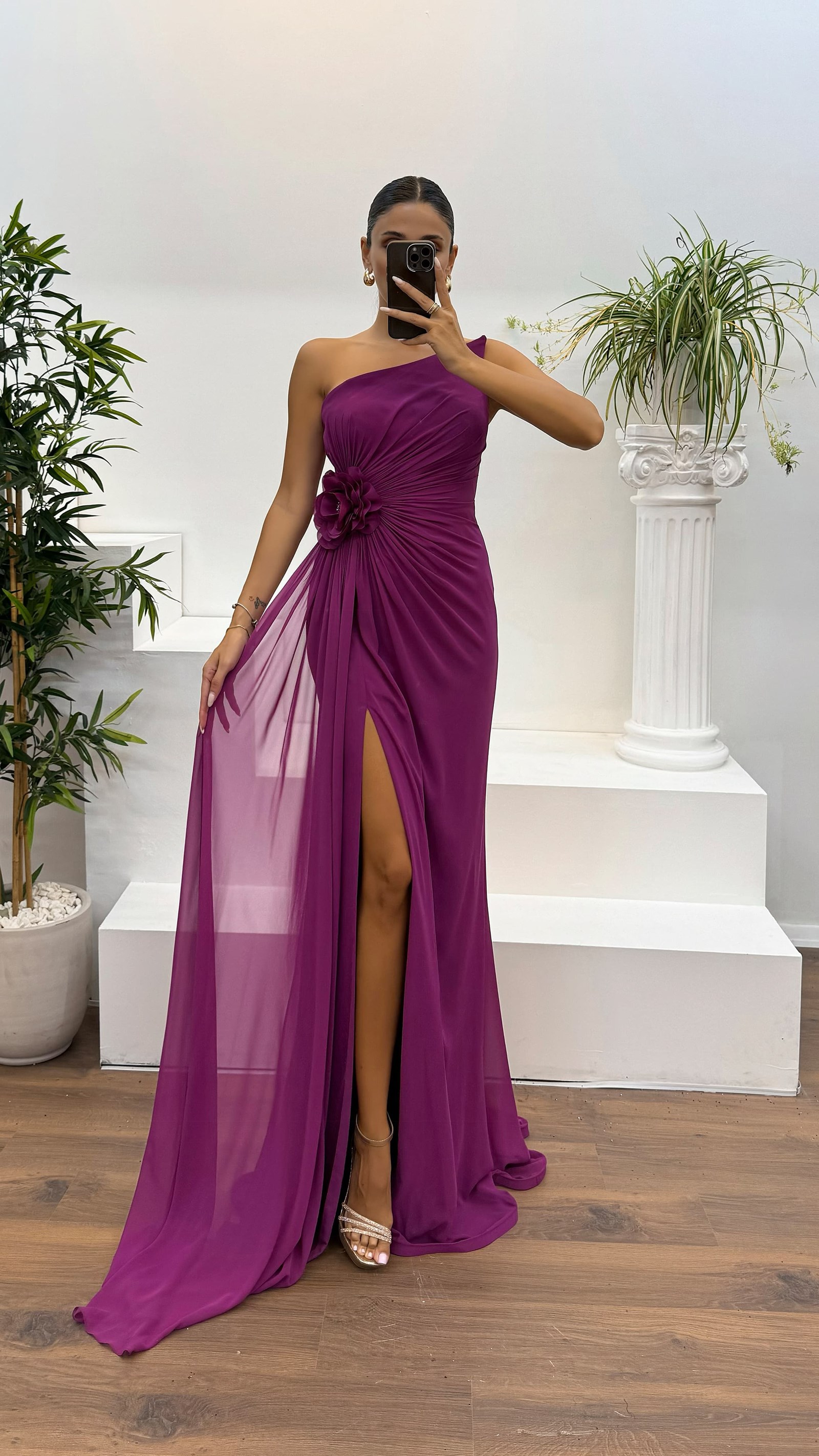 • Fuşya Straplez Bel Çiçek Detay Abiye Elbise